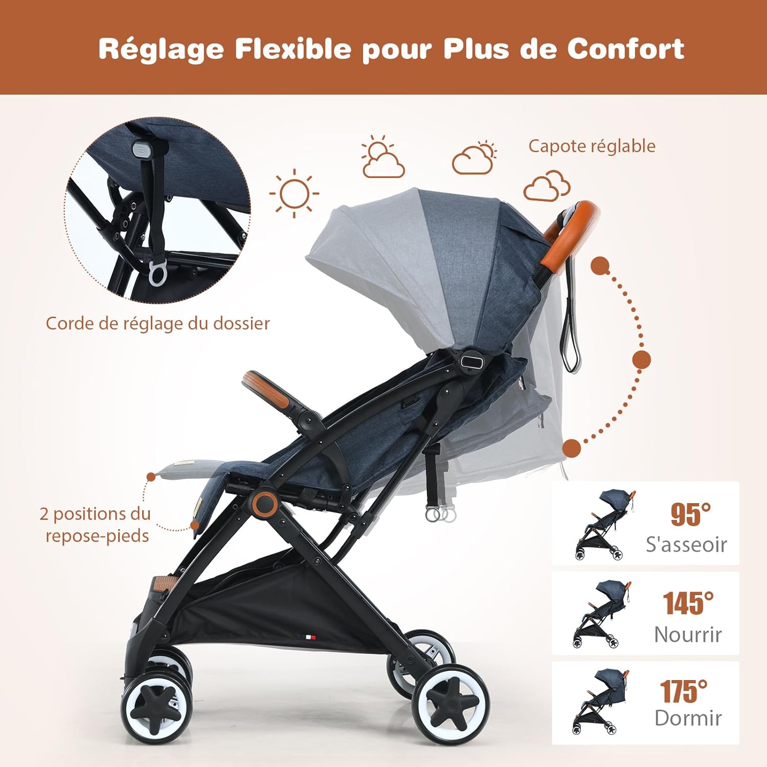 La maniabilité de la poussette est un atout majeur : son système de pliage à une main facilite le rangement et le transport, tandis que ses roues antidérapantes et son système d’absorption des chocs assurent une conduite en toute sécurité. Le dossier et le repose-pieds réglables permettent d’adapter la position de votre enfant pour un confort optimal, tandis que l’auvent rétractable et la moustiquaire protègent des intempéries et assurent une circulation d’air agréable. Offrez-vous une expérience parentale fluide et agréable avec cette poussette haut de gamme.