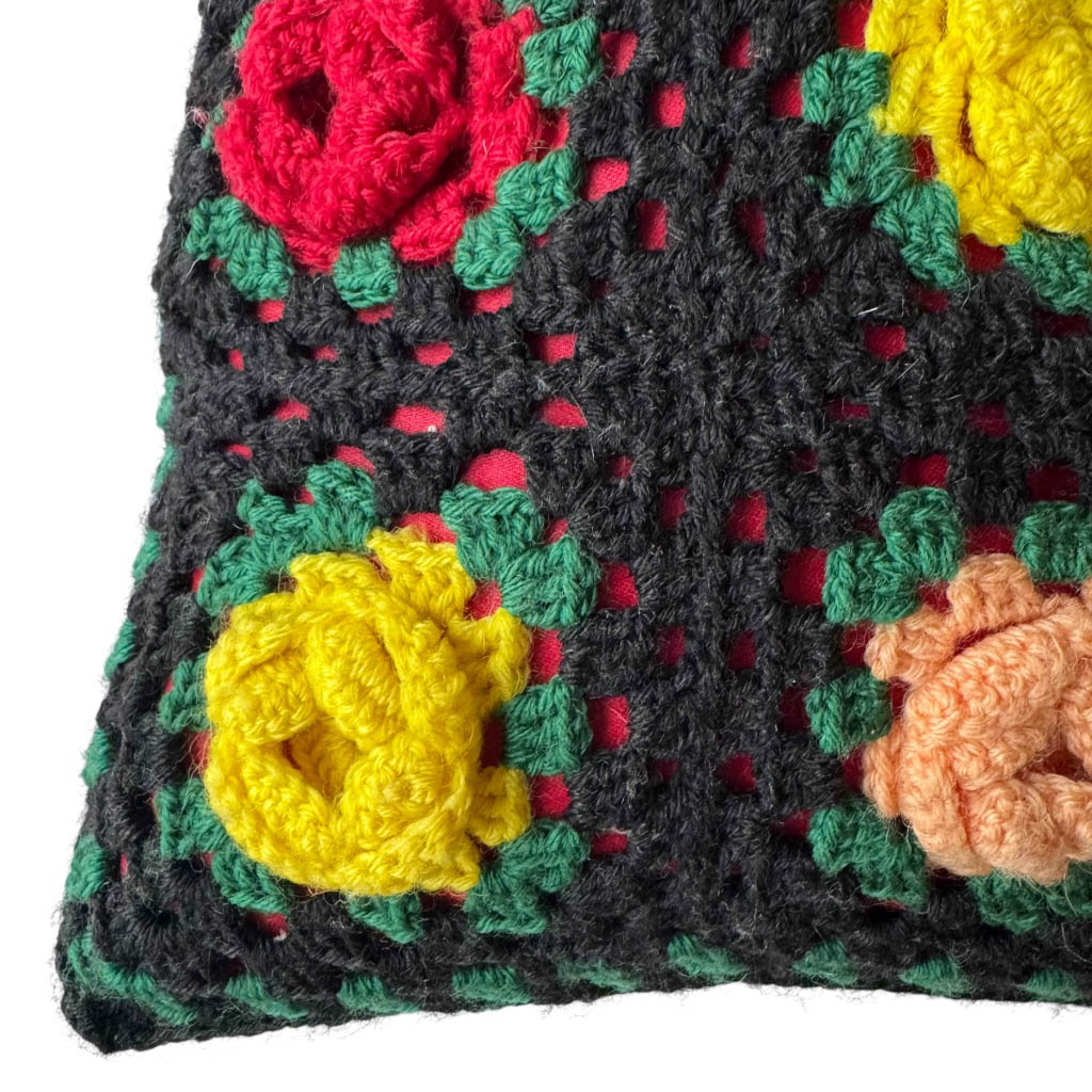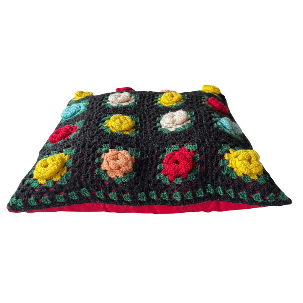 Coussin Grany crochet noir Elephant Paris Vintage Coussin multicolore crocheté à la main motif Grany datant des années 1 9 7 0, couleurs vives, rigolotes et graphiques . . . Bon état général malgré une petite tâche au verso sur la doublure rouge en satin épais de coton Dimensions : Largeur : 4 0 c m X Hauteur : 4 0 c m