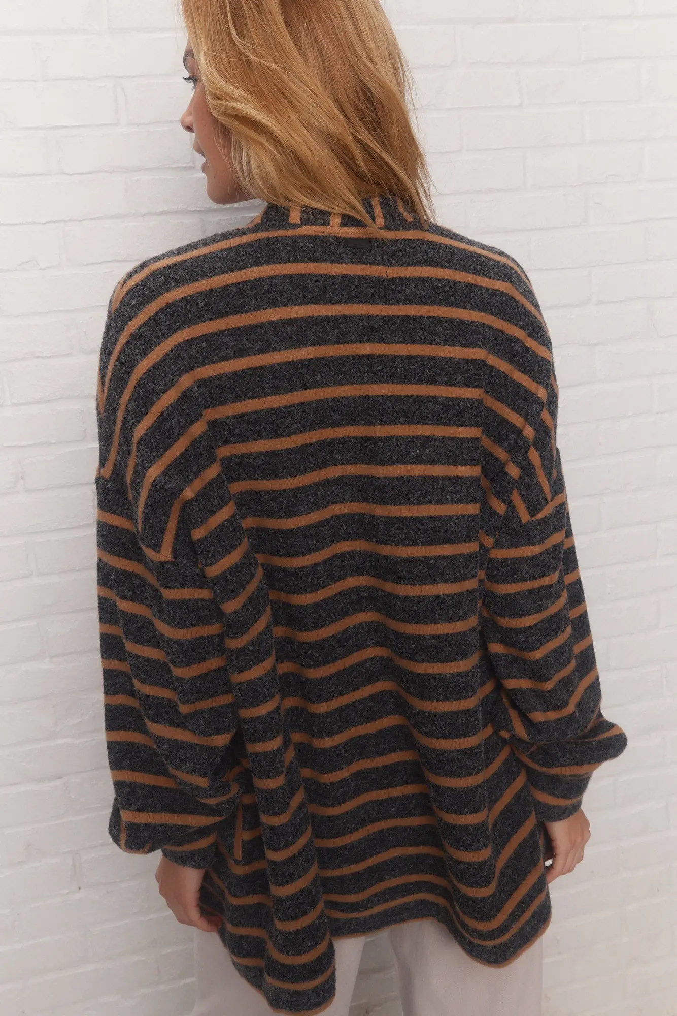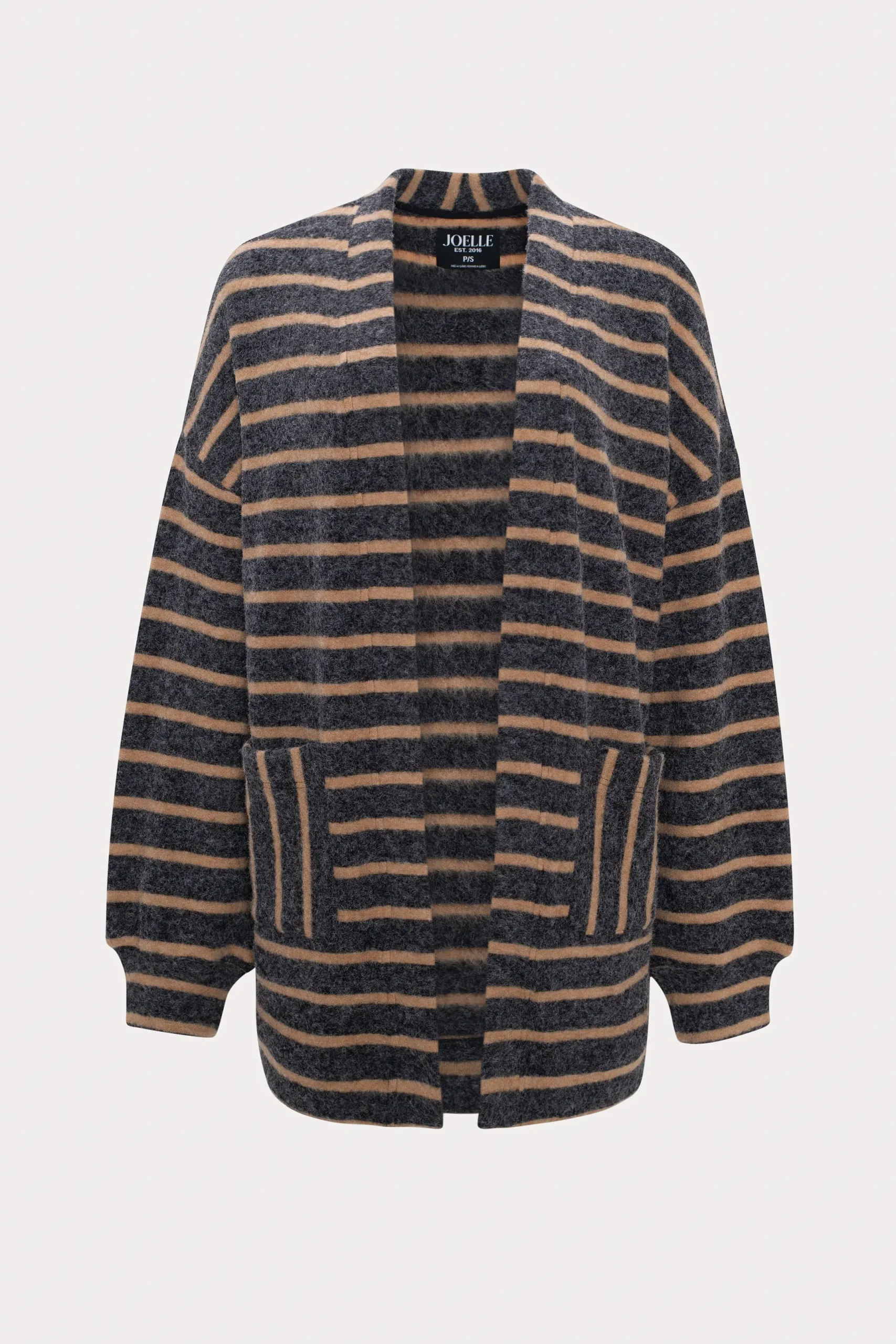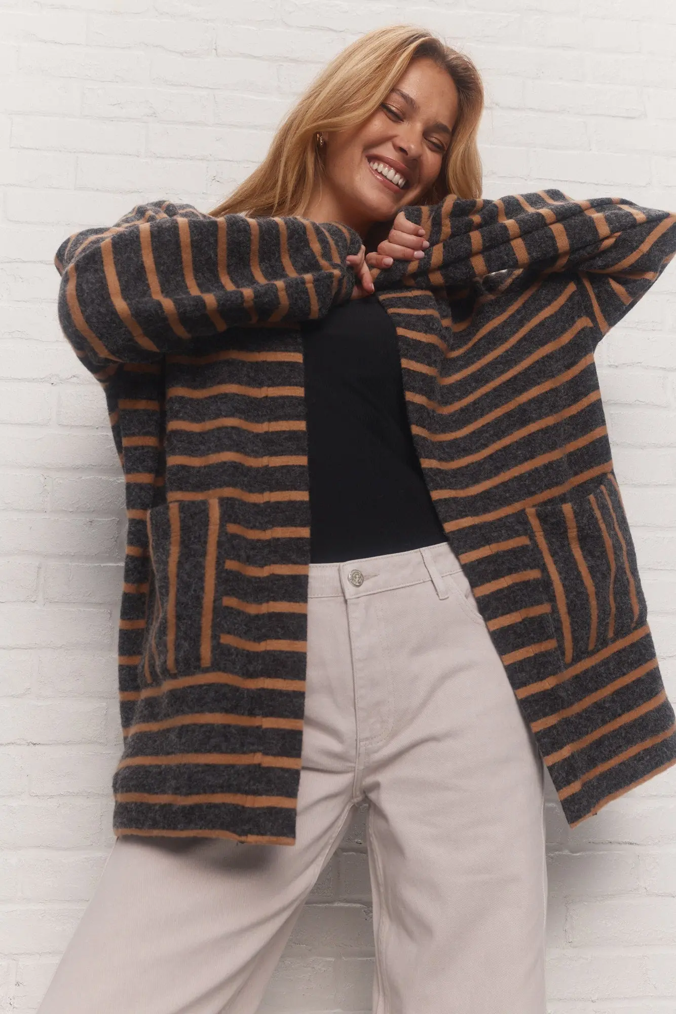Dougan est une veste lignée ample combo gris avec des emmanchures tombantes et une coupe ample pour un look décontracté et moderne. Les poches ajoutent une touche pratique, tandis que le tissu ligné est soyeux et intemporel.