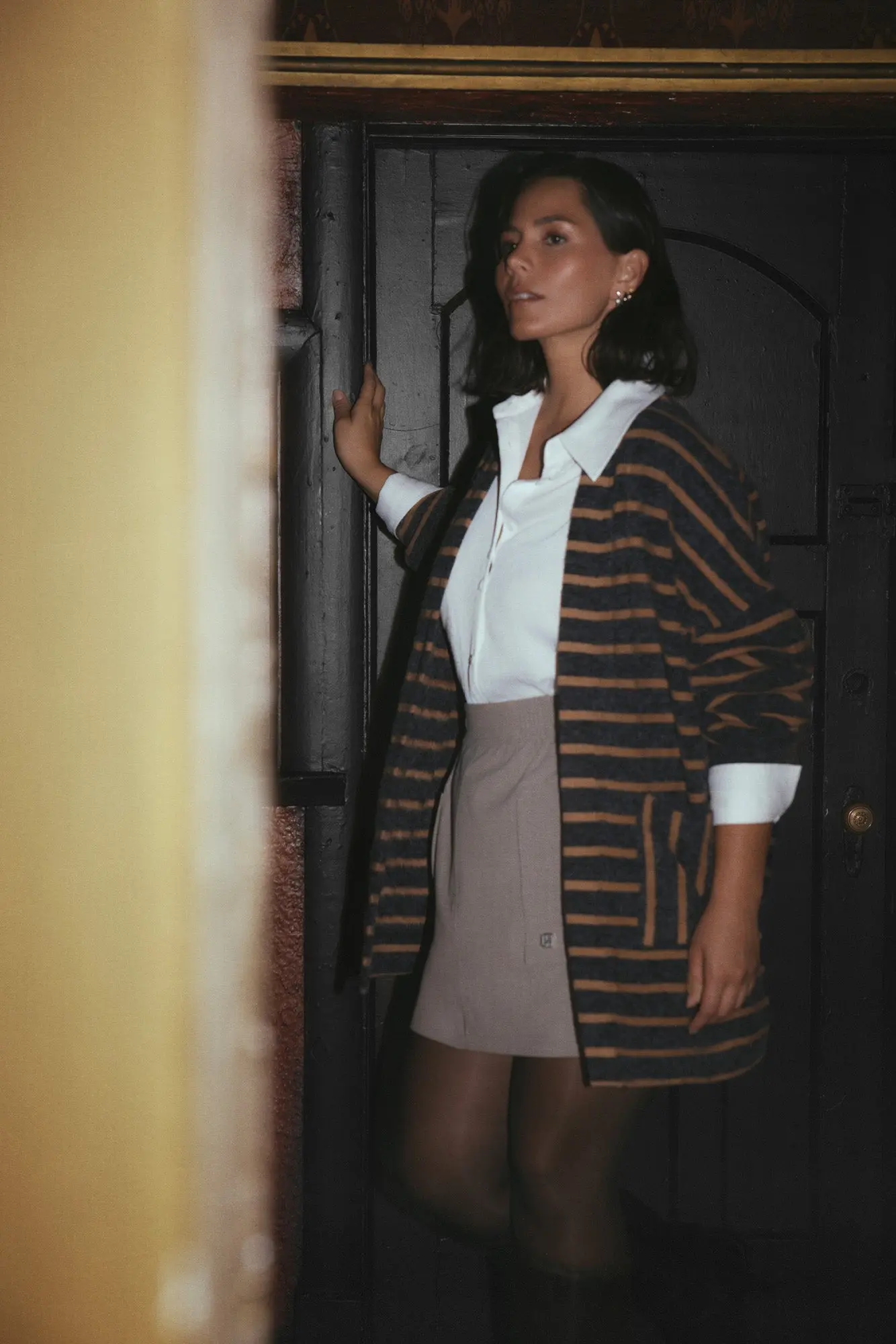 – L’ensemble conseillé par les stylistes JOELLE : la veste lignée ample Dougan, la chemise Douglas et la minijupe Carrie.