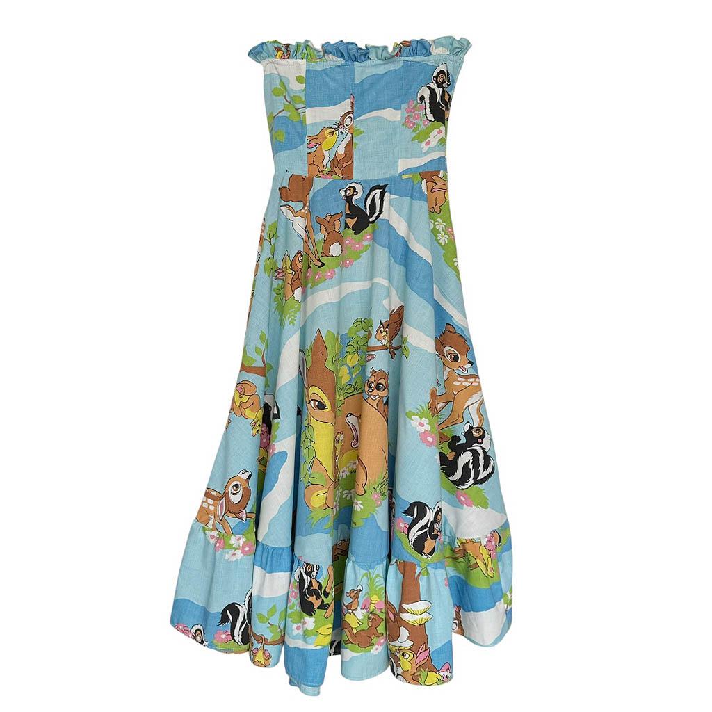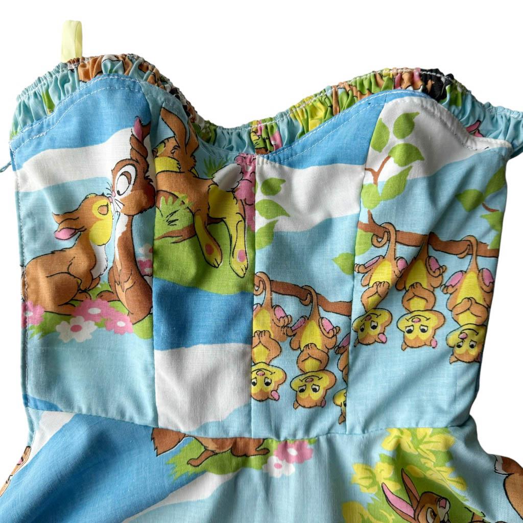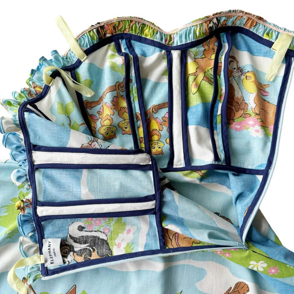 Ensemble bob robe bustier Bambi Elephant Paris Design Upcycling réalisé avec des matériaux anciens, coton imprimé Bambi Walt Disney et zip années 80, finitions biais coton marine, Pièce unique Made in France Mesures à plat : Bob : Tour de tête 60cm, Mesures à plat : Poitrine 38cm, 90B, Taille 32cm, Longueur dos 106cm, Longueur jupe 83cm,Taille 36