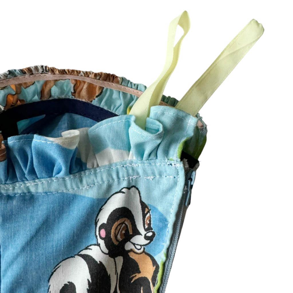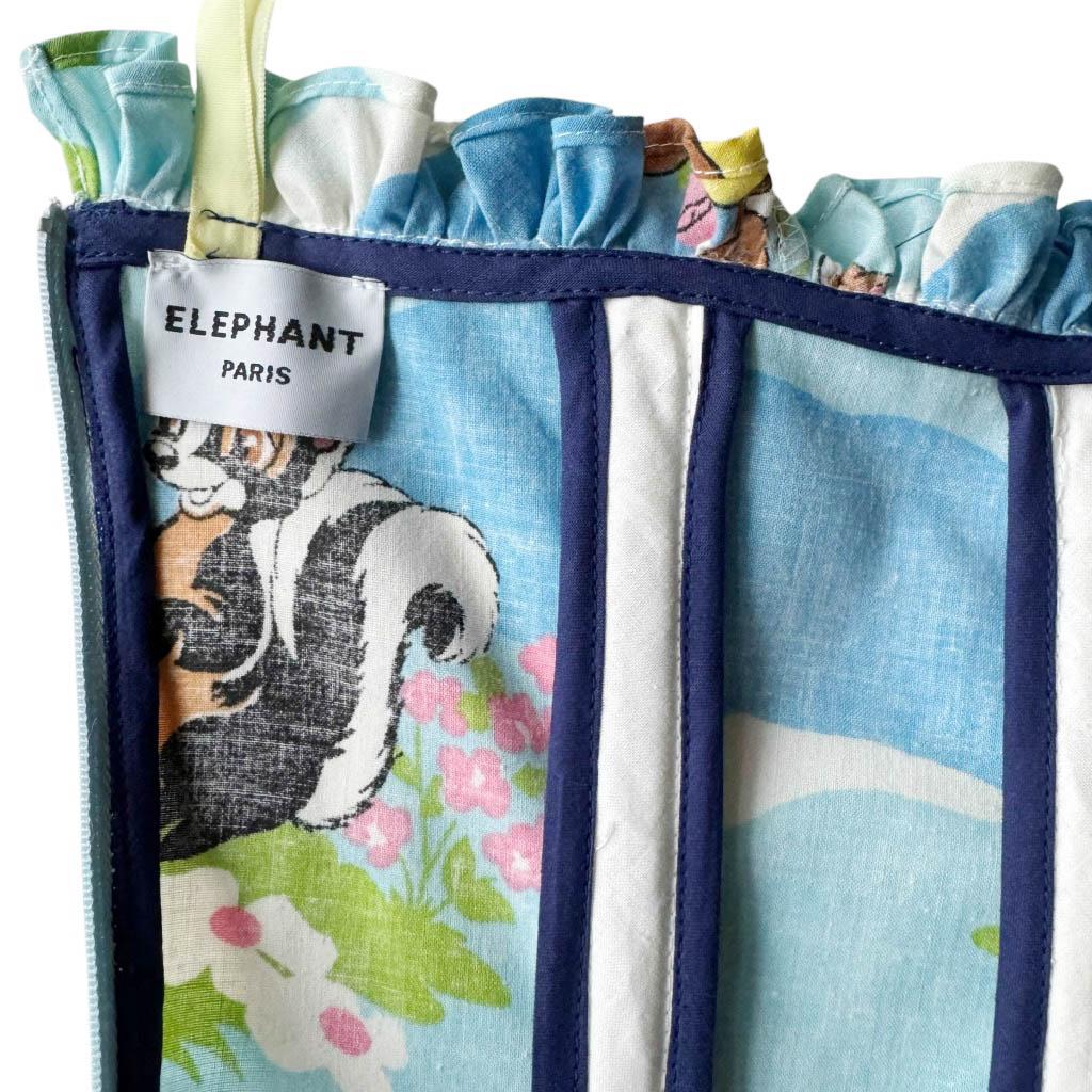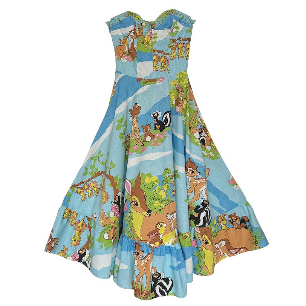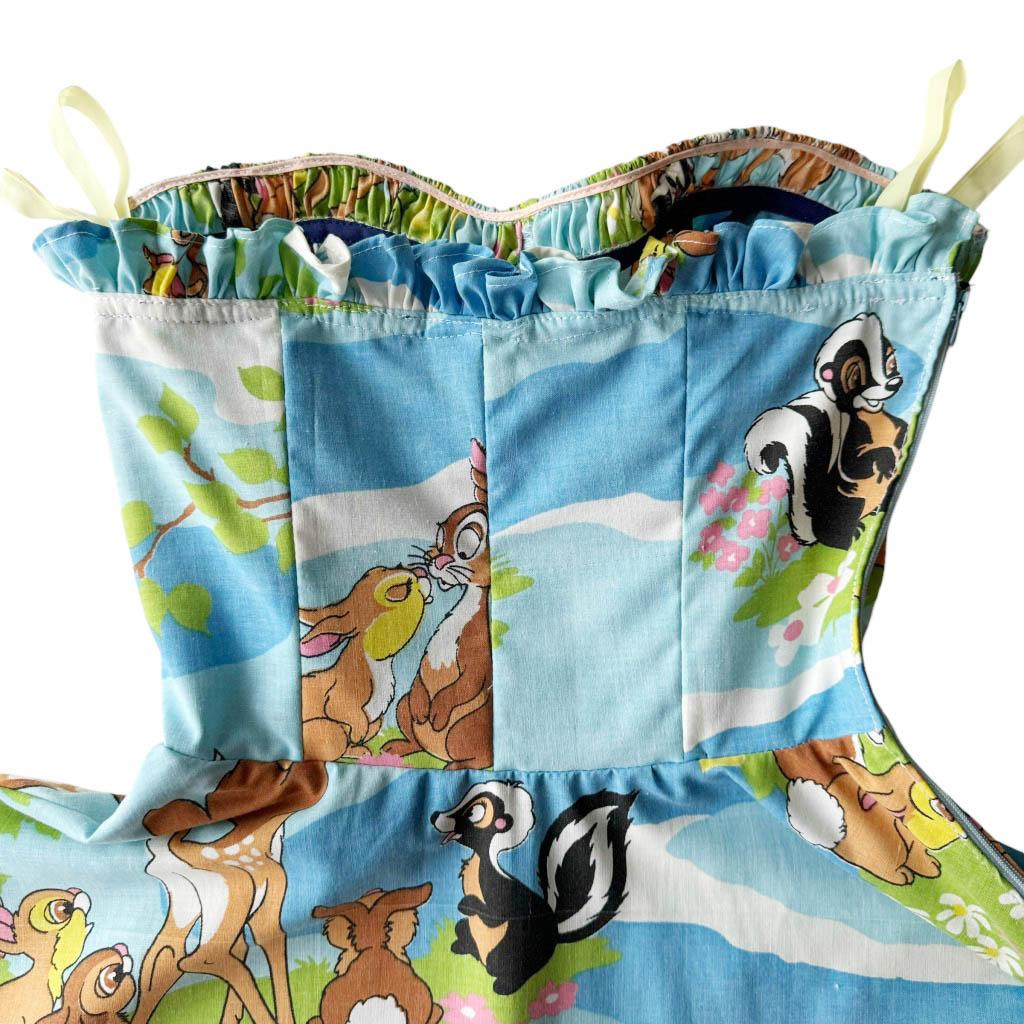 Ensemble bob robe bustier Bambi Elephant Paris Design Upcycling réalisé avec des matériaux anciens, coton imprimé Bambi Walt Disney et zip années 80, finitions biais coton marine, Pièce unique Made in France Mesures à plat : Bob : Tour de tête 60cm, Mesures à plat : Poitrine 38cm, 90B, Taille 32cm, Longueur dos 106cm, Longueur jupe 83cm,Taille 36