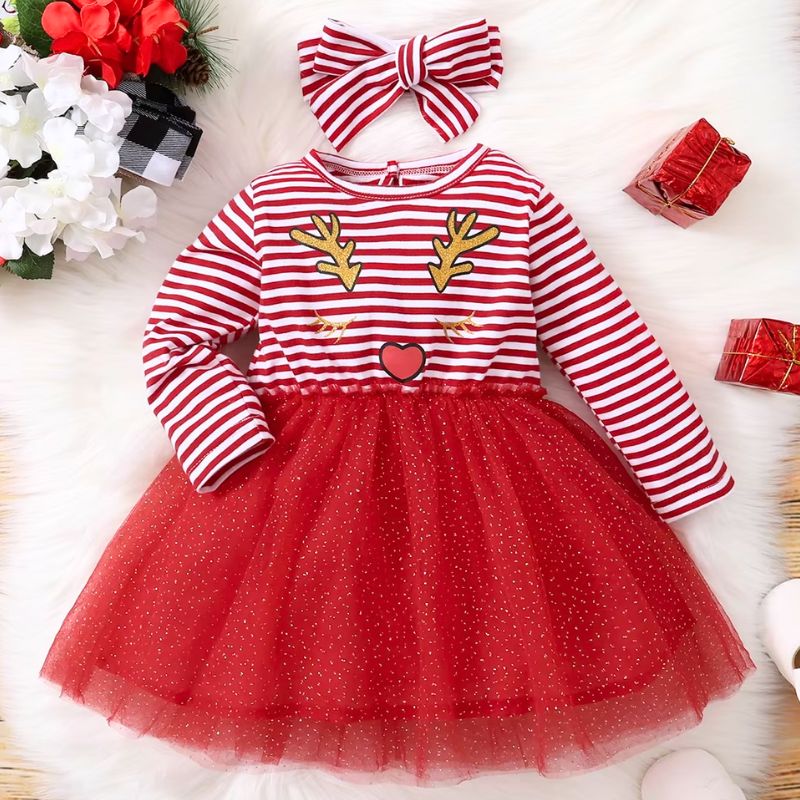 Ensemble Robe Rayée & Bandeau De Noël Pour Fille