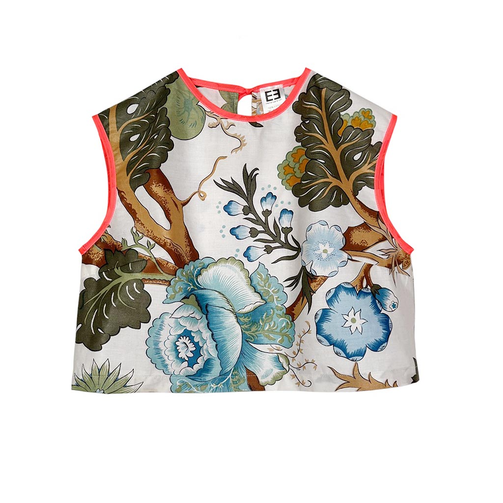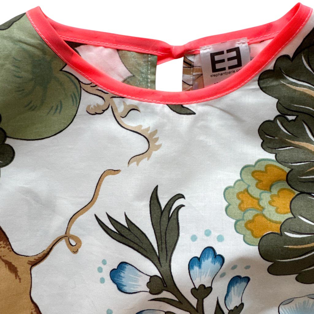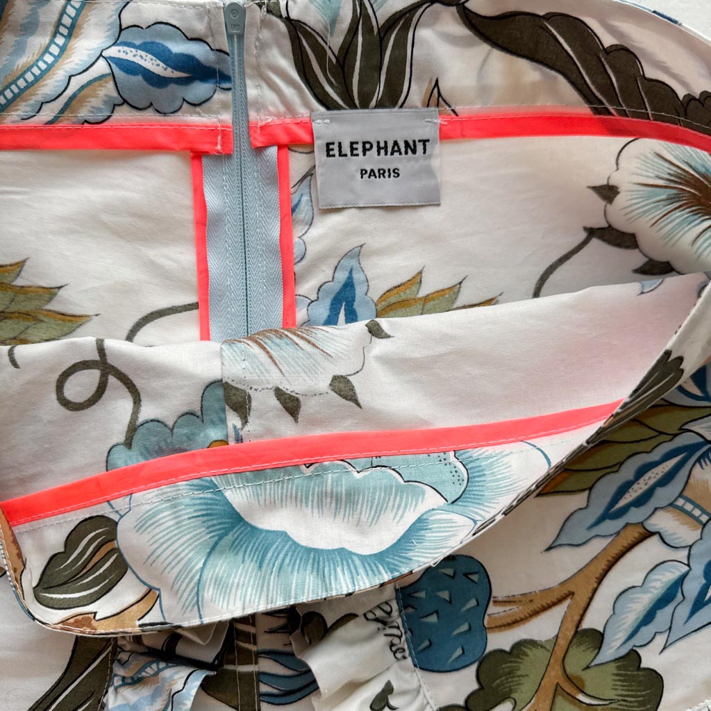 Ensemble top et flare butterfly coton décoratif Elephant Paris Design Ce design est réalisé avec des matériaux anciens, beau drap de coton légèrement enduit d’ameublement, au motif floral décoratif, datant des années 1 9 8 0, finitions gansées au biais de coton orange fluo et coutures anglaises, fermeture à glissière dans le dos neuve d’époque des années 1 9 7 0, les deux poches plaquées à volant sont doublées. Le top est ouvert dans le dos, encolure ronde et absence de manches, finitions gansées au biais de coton orange fluo Mesures prises à plat : Le top : Epaules :…