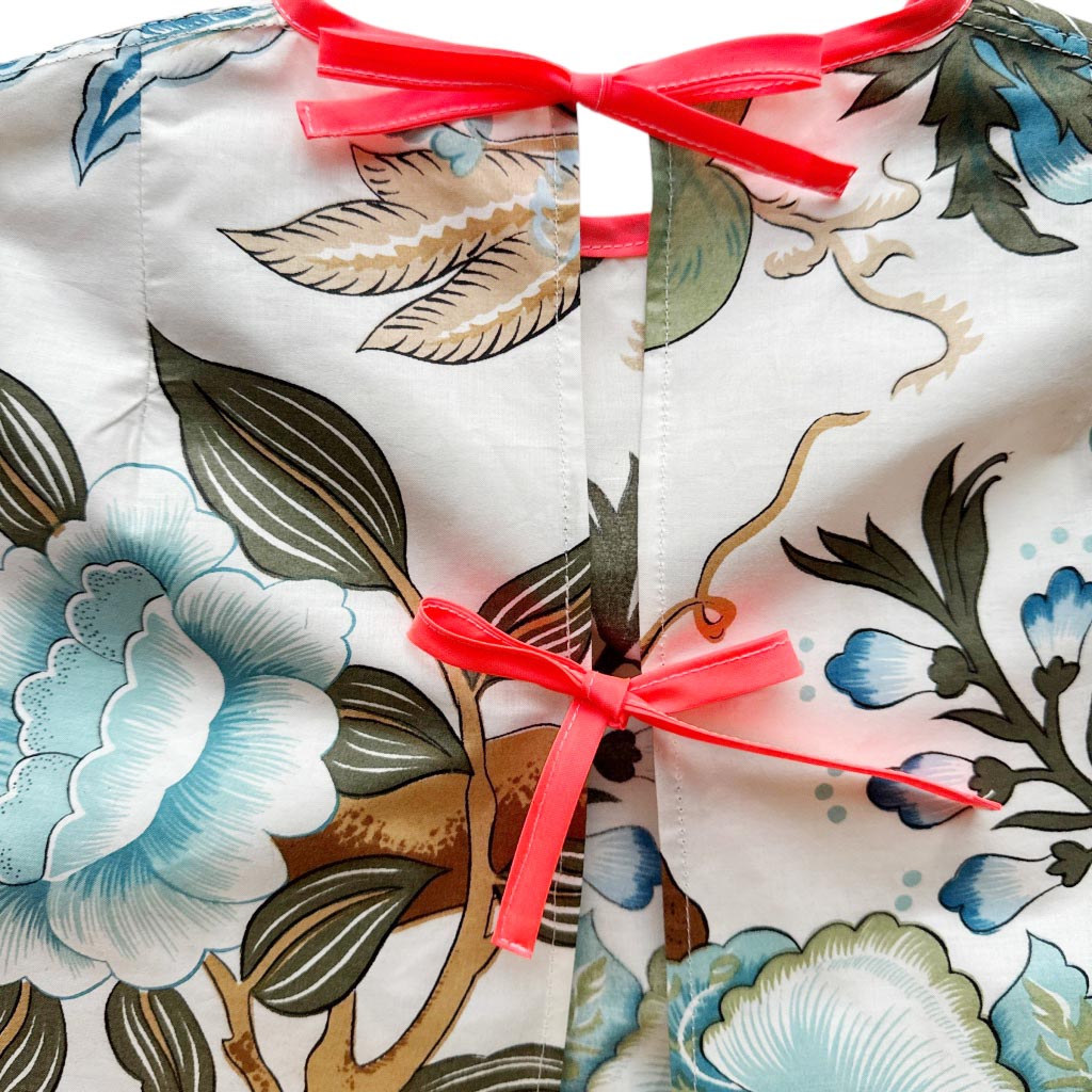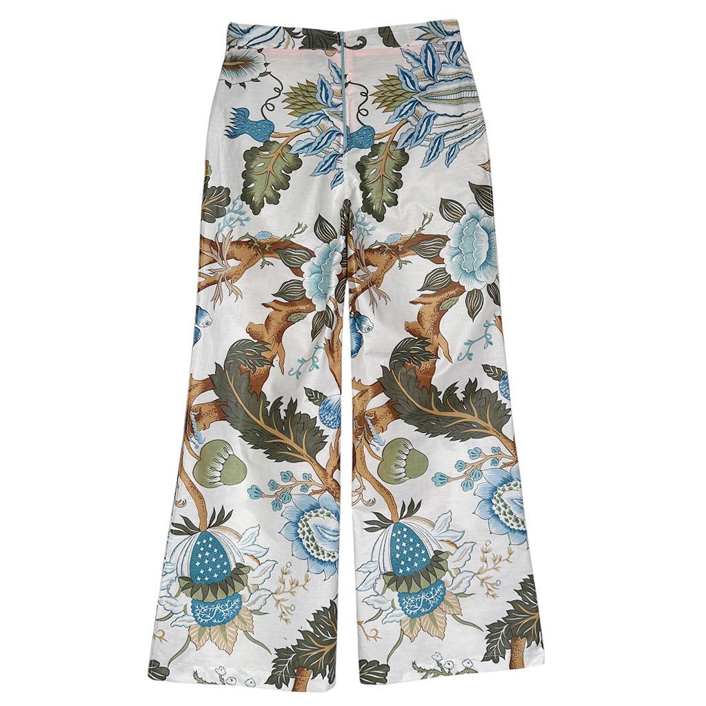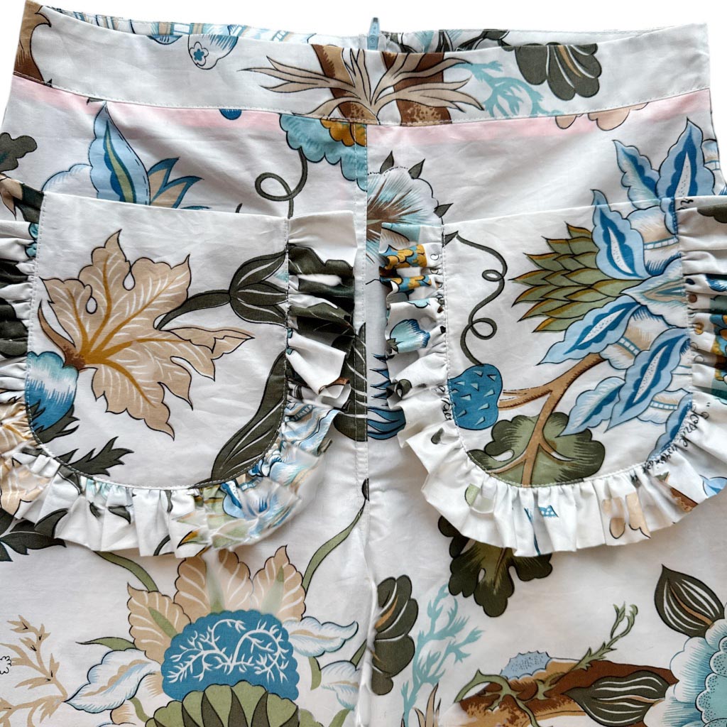 Ensemble top et flare butterfly coton décoratif Elephant Paris Design Ce design est réalisé avec des matériaux anciens, beau drap de coton légèrement enduit d’ameublement, au motif floral décoratif, datant des années 1 9 8 0, finitions gansées au biais de coton orange fluo et coutures anglaises, fermeture à glissière dans le dos neuve d’époque des années 1 9 7 0, les deux poches plaquées à volant sont doublées. Le top est ouvert dans le dos, encolure ronde et absence de manches, finitions gansées au biais de coton orange fluo Mesures prises à plat : Le top : Epaules :…