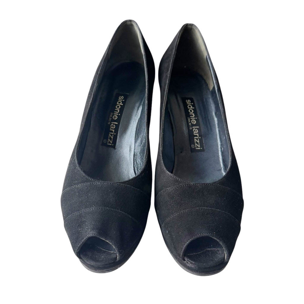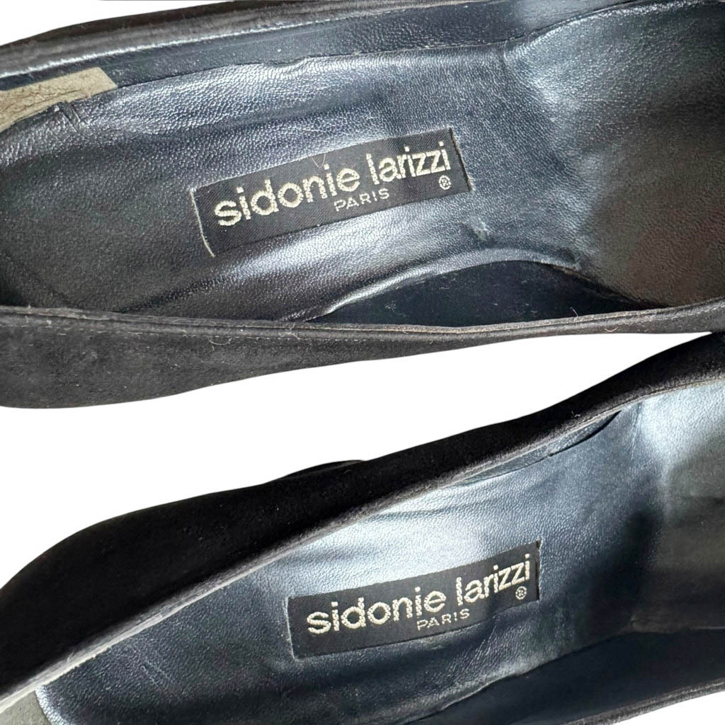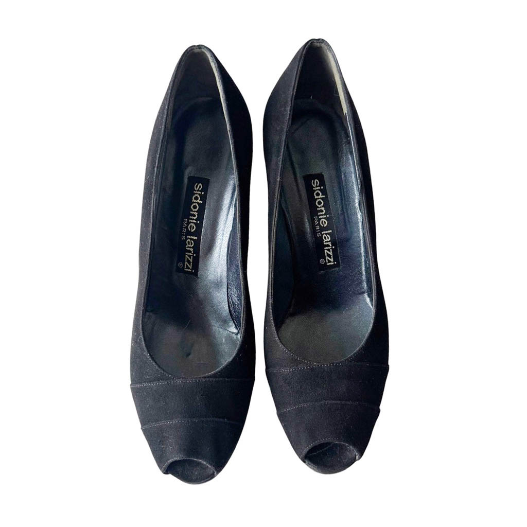 Escarpins daim noir Sidonie Larizzi Elephant Paris vintage Escarpins en daim noir, vintage datant des années 1 9 8 0, Pointure : 3 8, Hauteur du talon 8, 5 c m, Neufs d’époque, semelles intérieures en cuir argenté foncé, semelles élastomère, dessus et talon en daim, fabriquées en France,