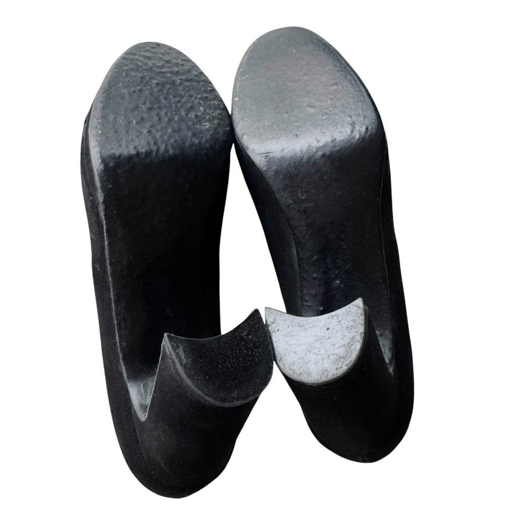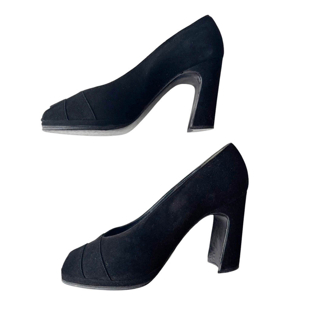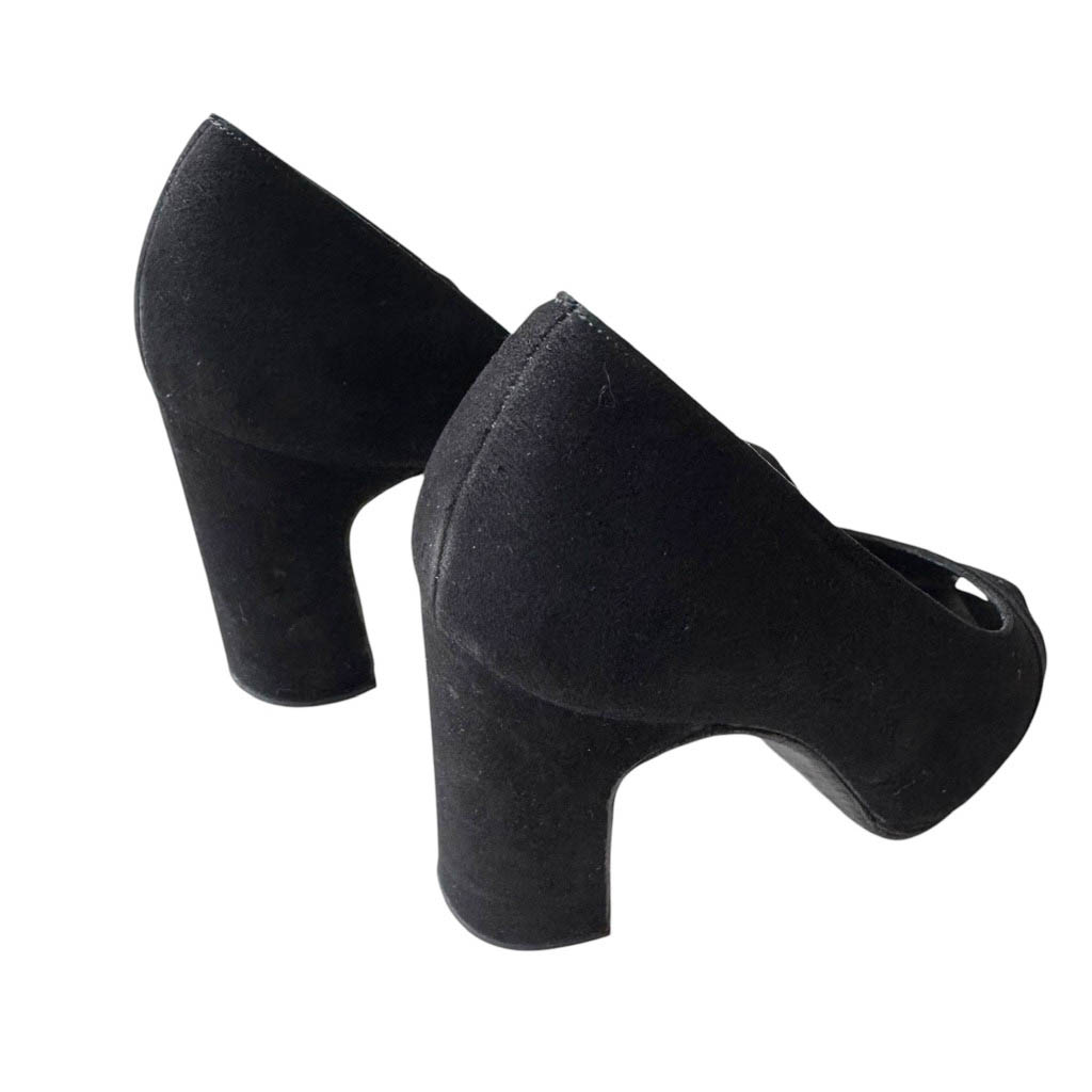 Escarpins daim noir Sidonie Larizzi Elephant Paris vintage Escarpins en daim noir, vintage datant des années 1 9 8 0, Pointure : 3 8, Hauteur du talon 8, 5 c m, Neufs d’époque, semelles intérieures en cuir argenté foncé, semelles élastomère, dessus et talon en daim, fabriquées en France,