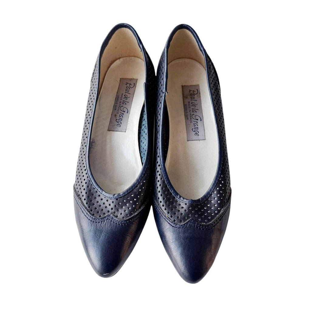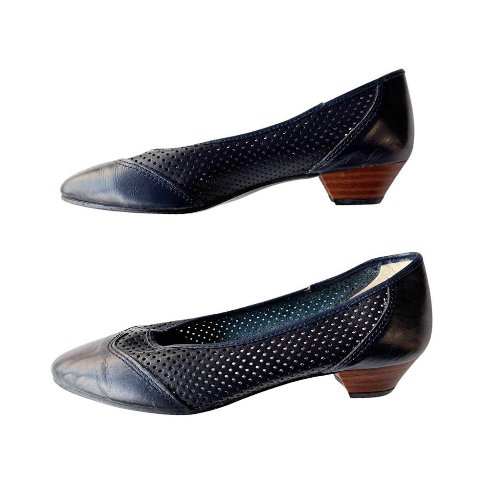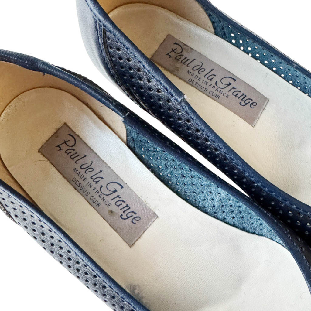 Escarpins Paul de la Grange Elephant Paris Vintage Escarpins en cuir bleu marine vif, vintage début des années 80, Pointure 37 / 38 / 4, Hauteur du talon en bois 3 cm, Neuves d’époque, semelles cuir, dessus cuir ajouré, doublées vinyl, semelles intérieures vinyl, fabriquées en France