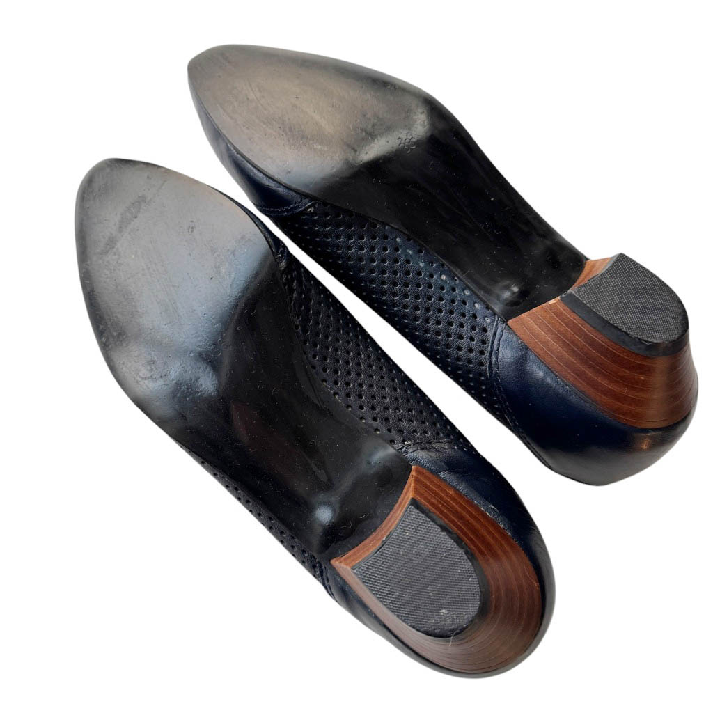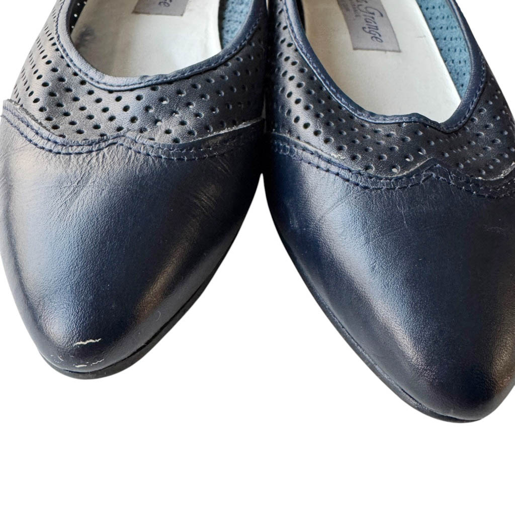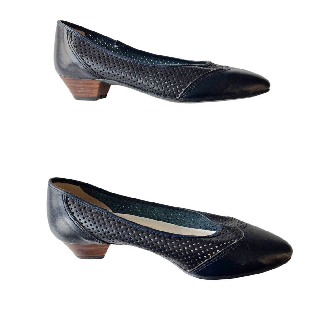 Escarpins Paul de la Grange Elephant Paris Vintage Escarpins en cuir bleu marine vif, vintage début des années 80, Pointure 37 / 38 / 4, Hauteur du talon en bois 3 cm, Neuves d’époque, semelles cuir, dessus cuir ajouré, doublées vinyl, semelles intérieures vinyl, fabriquées en France
