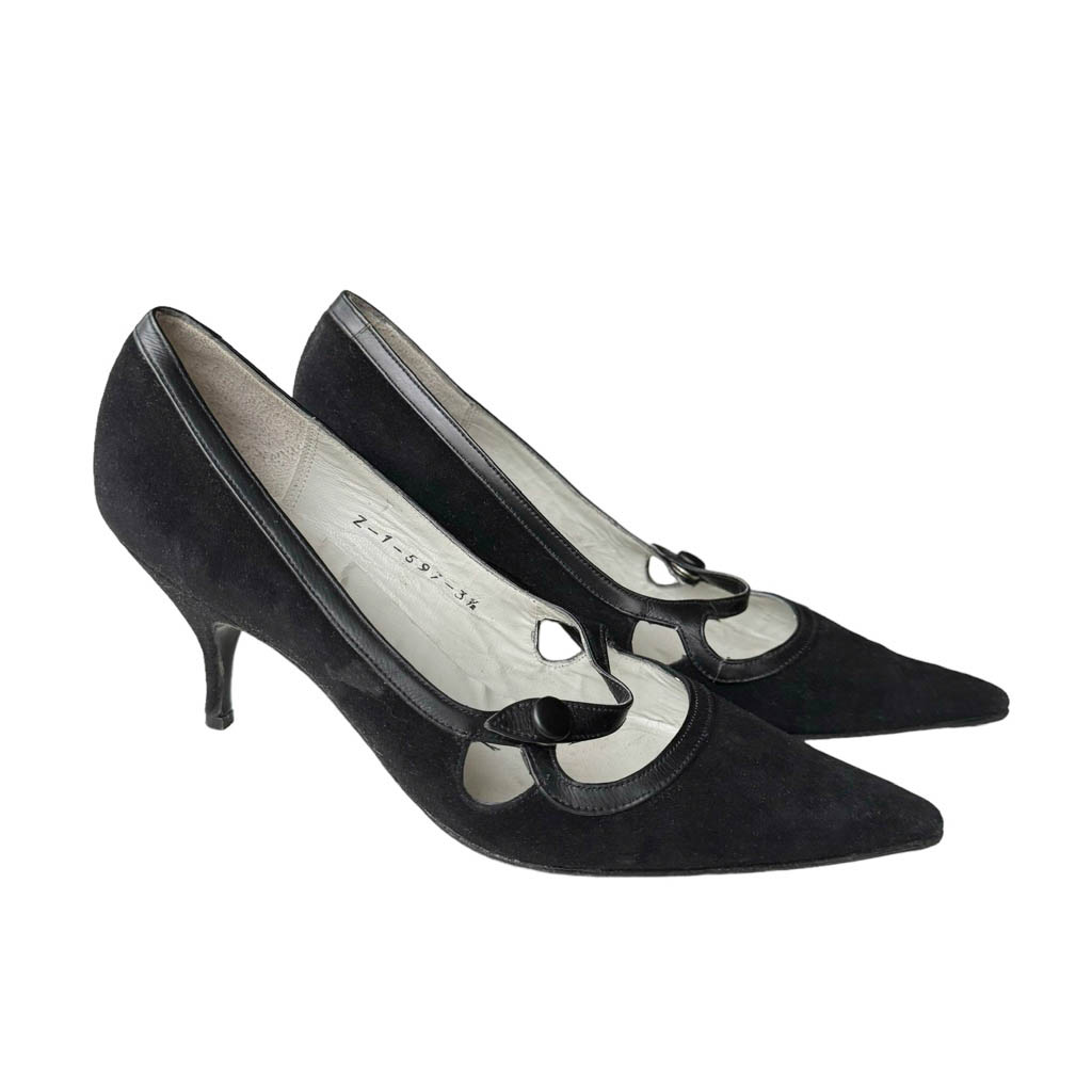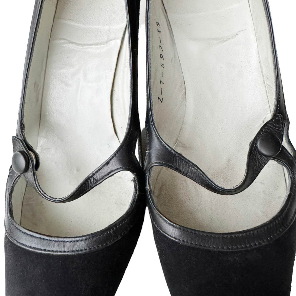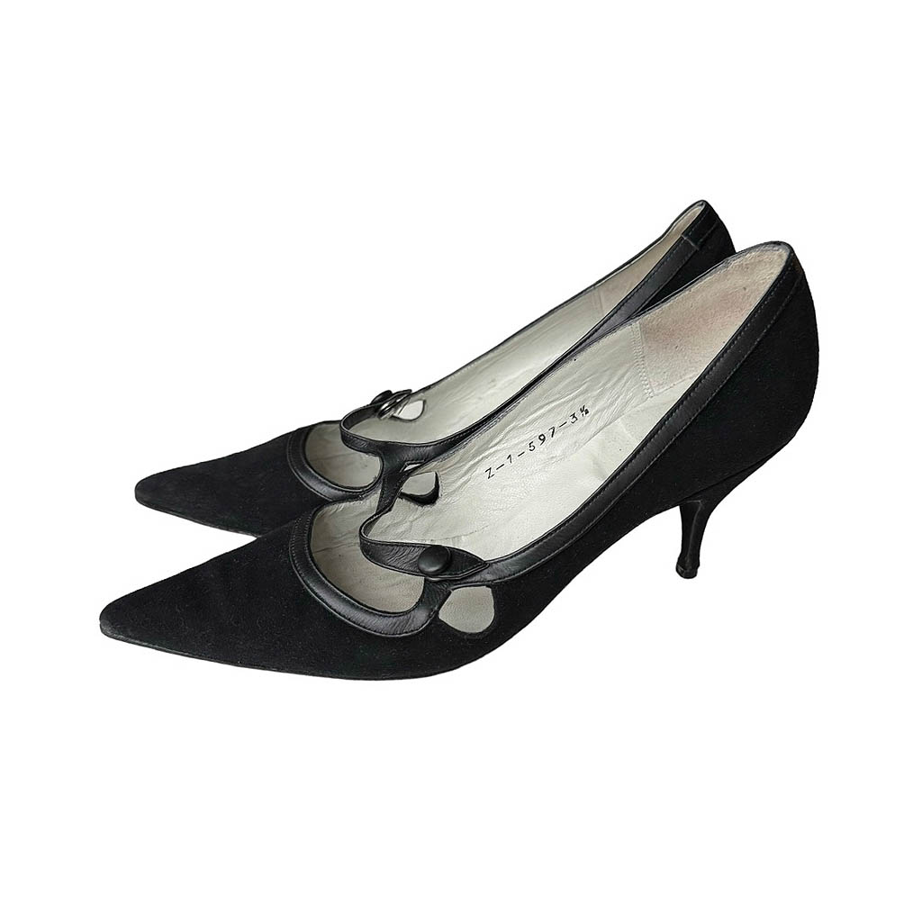 Escarpins Souple Chic 50s en daim et cuir Elephant Paris vintage Pointure 3/5, 35/36, Longueur semelle 21cm, Hauteur talon ferré 7cm