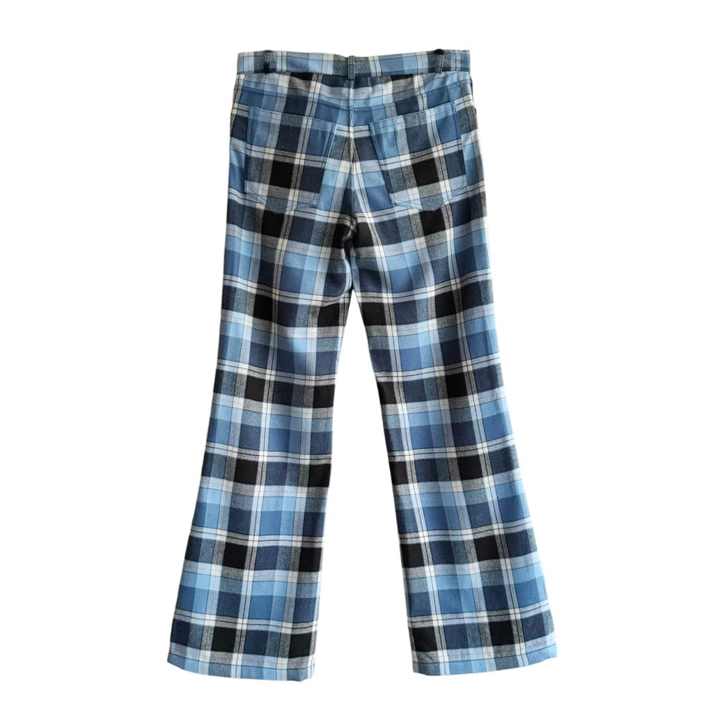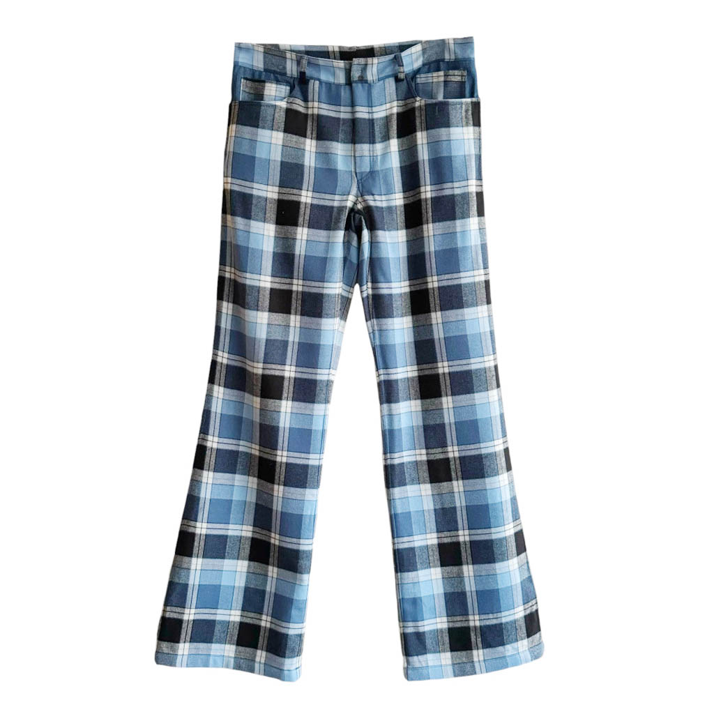 Flare 6 poches écossais bleu Elephant Paris Design Réalisé avec des matériaux anciens écossais mélangé lainage, Pièce unique Made in France, Taille 45cm, Hanches 50cm, Longueur entrejambes depuis la taille 28cm, Longueur depuis la taille avec la ceinture 111cm, Longueur jambe depuis la fourche 85cm, Taille 42