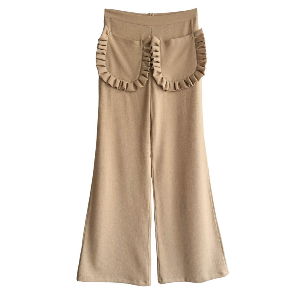 Pantalon pattes d’éléphant poches plaquées à volants, réalisé en crêpe de chine, poches plaquées, fermeture dos, coutures anglaises et finitions biais