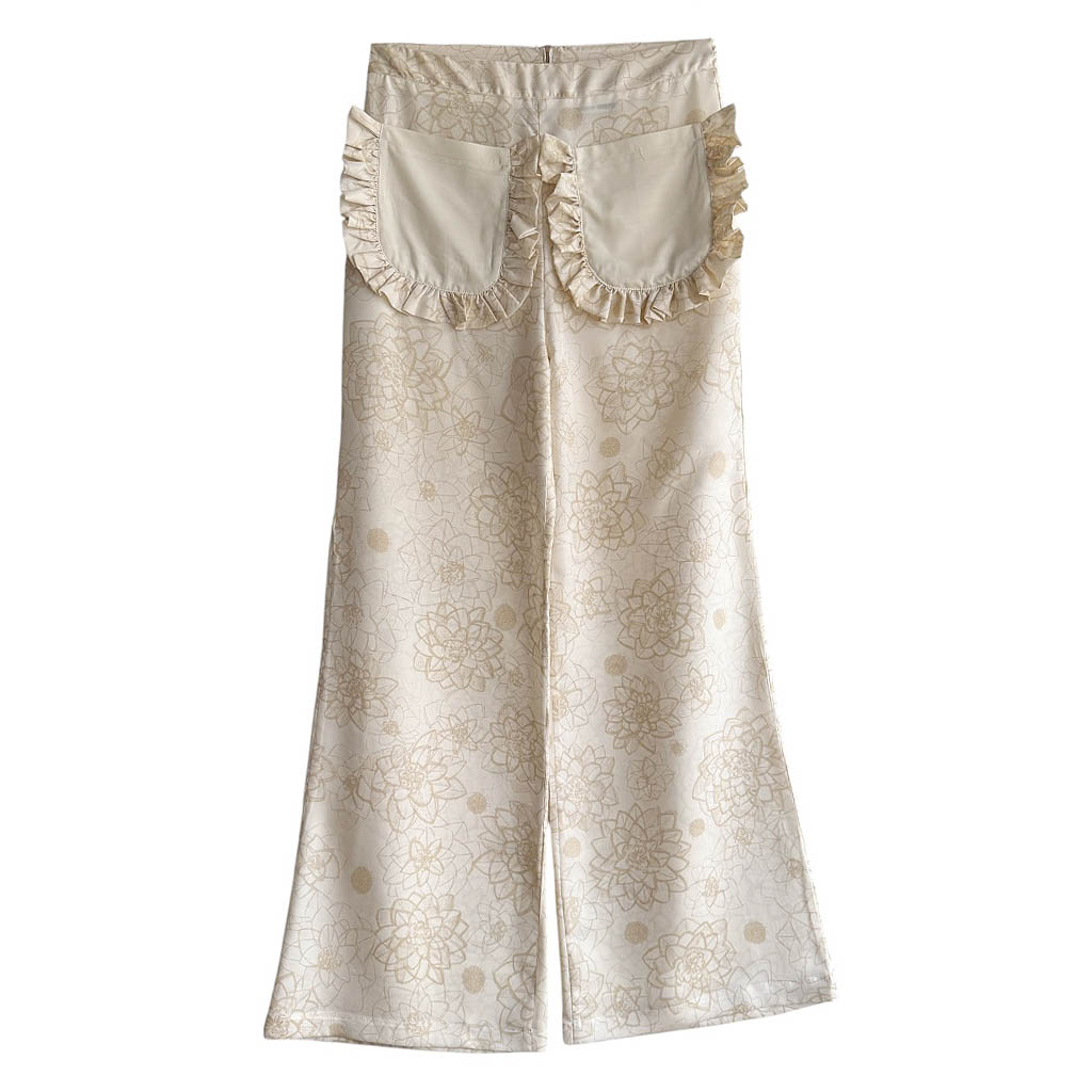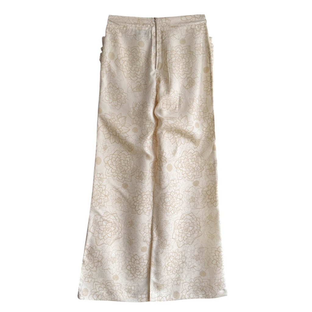 Flare Butterfly Silk Elephant Paris Design Ce design est réalisé avec des matériaux anciens, coupon de soie imprimée de grosses fleurs et signée Nina Ricci, datant des années 1 9 7 0, finitions gansées au biais de coton beige clair et.coutures anglaises, fermeture à glissière dans le dos neuve d’époque des années 1 9 7 0, les deux poches plaquées à volant sont doublées Cette pièce est unique et entièrement fabriquée à Paris Mesures prises à plat : Taille haute : 3 7 c m, Hanches 4 5 c m, Longueur entrejambes depuis la taille 3 0 c m, Longueur…