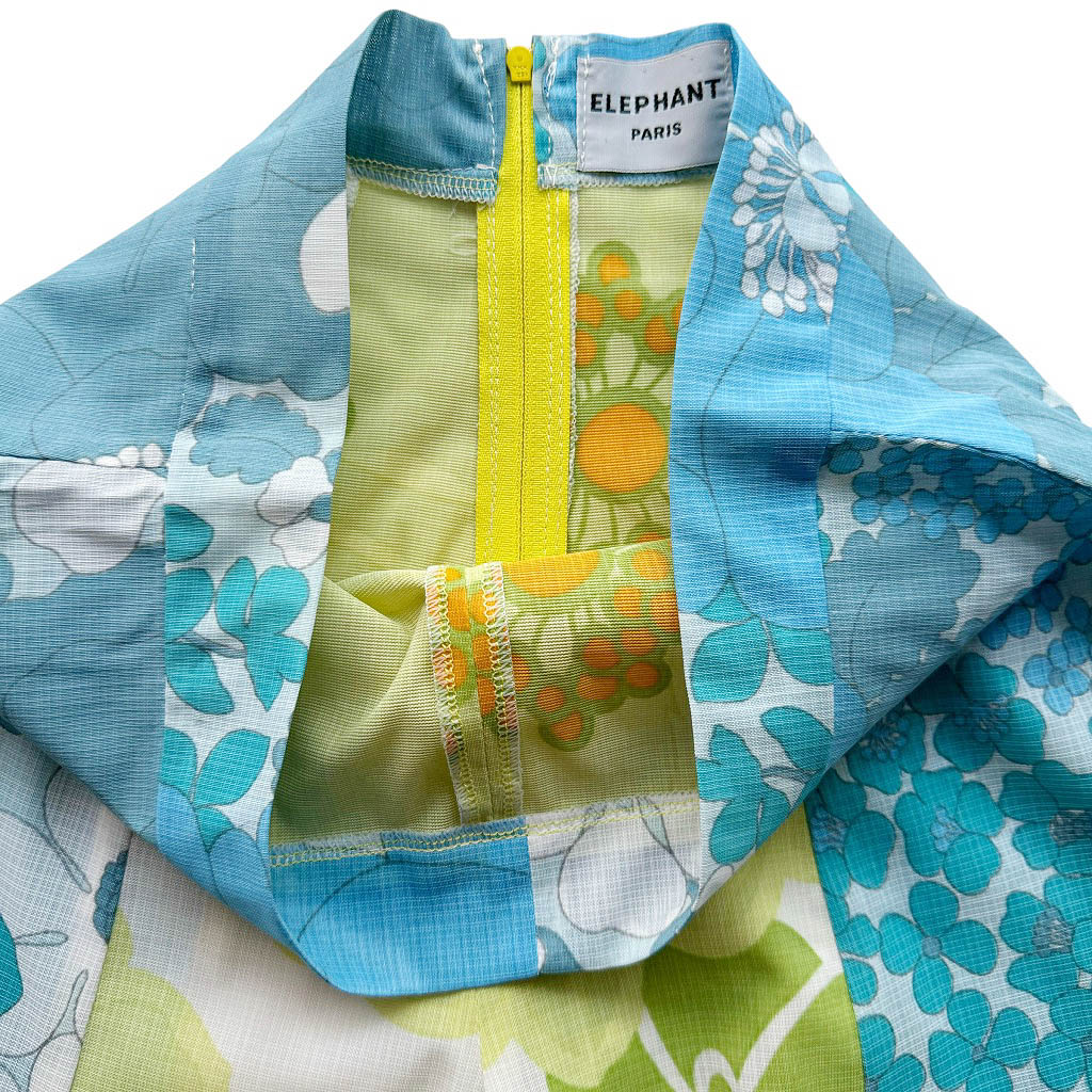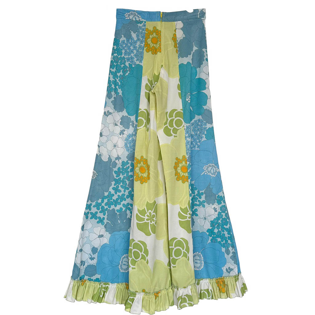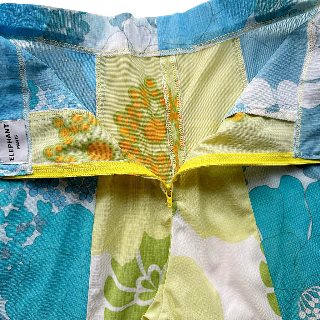 Flare Chantilly vert bleu Elephant Paris Design Réalisé avec des matériaux anciens, nylons fluides et légèrement transparents des années 70, Pièce unique Made in France, Taille haute 35cm, Hanches 45cm, Longueur entrejambes depuis la taille 30cm, Longueur 111cm, Taille 34/36, S