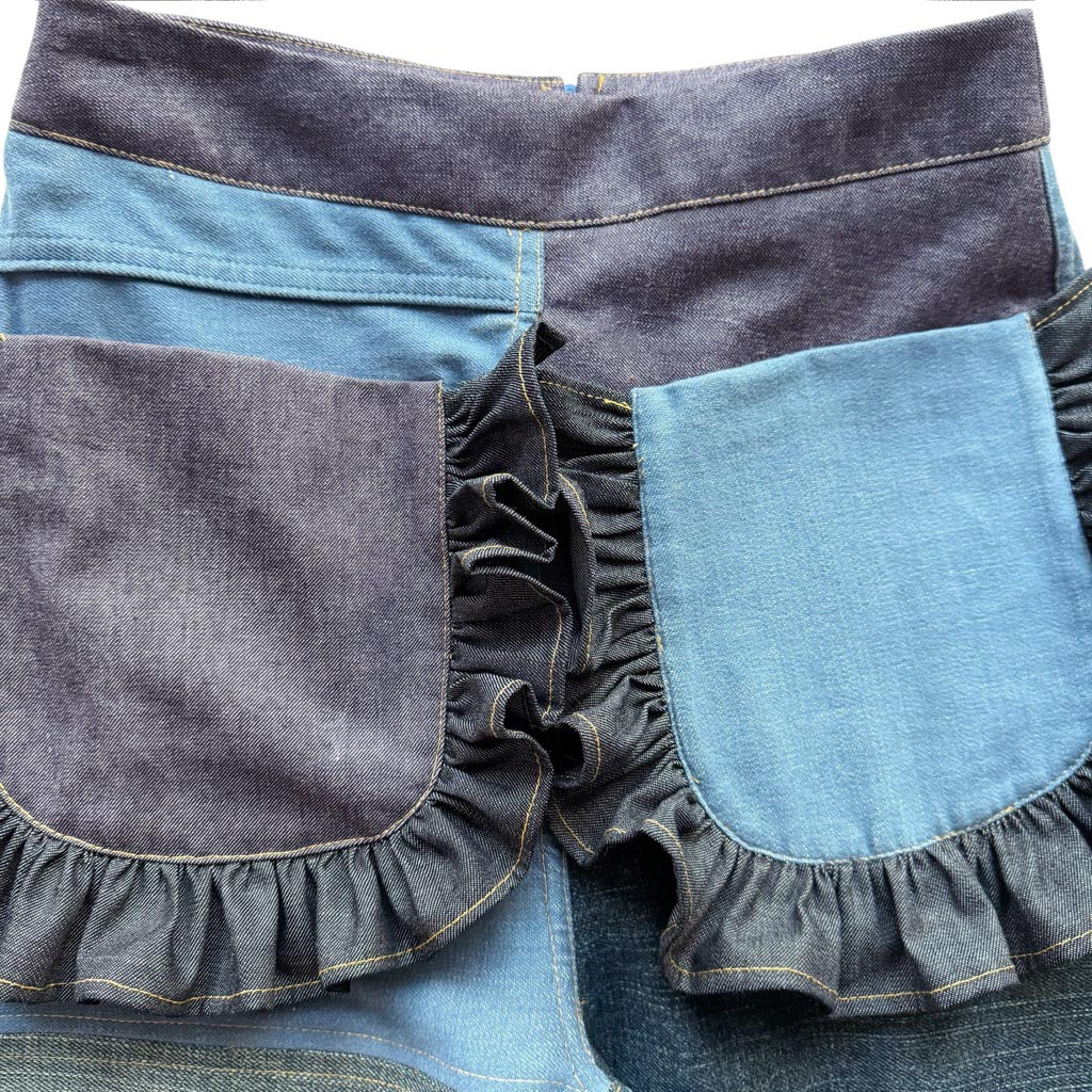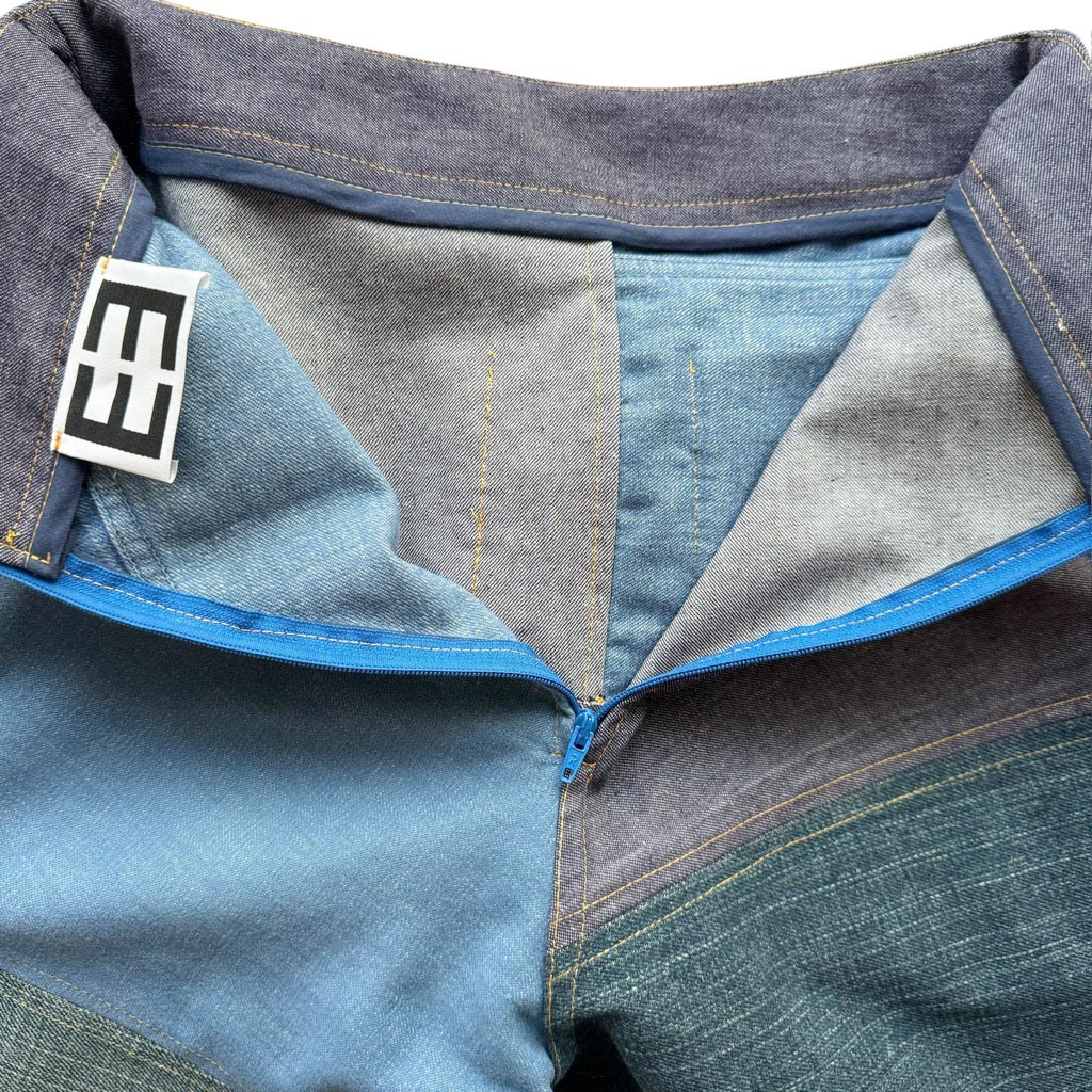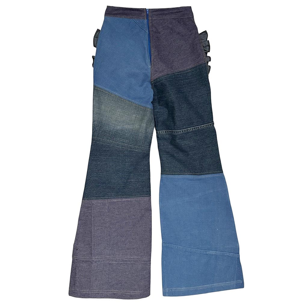 Flare Denim Patchwork Butterfly Elephant Paris Design Ce design est réalisé avec des toiles de jean semi-élasthanes et denims de coton datant des années 2000, coutures jeans,, finitions gansées au biais de coton marine, fermeture à glissière dans le dos neuve d’époque des années 1 9 7 0, les deux poches plaquées à volant sont doublées en coton Cette pièce est unique et entièrement fabriquée à Paris Mesures prises à plat : Taille haute : 3 2 c m, Hanches 4 2 c m, Longueur entrejambes depuis la taille 3 1 c m, Longueur depuis la taille avec la ceinture…