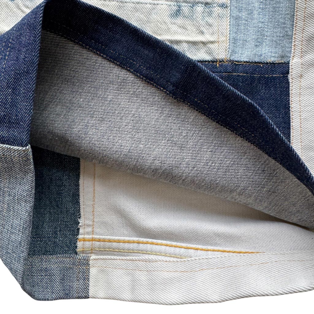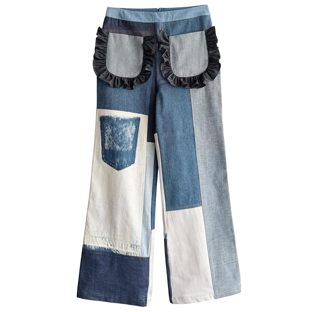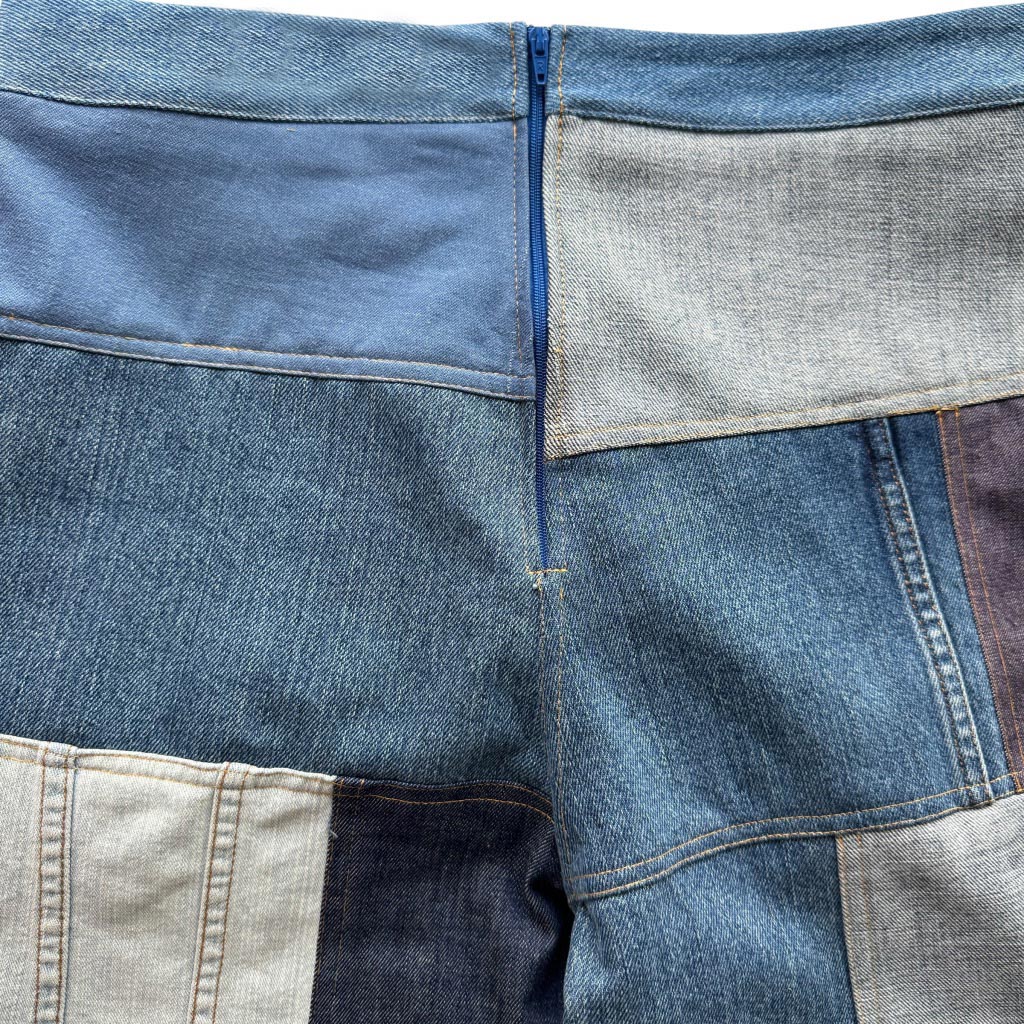 Flare Denim Patchwork Butterfly Elephant Paris Design Design réalisé avec un mélange de toiles de jeans et denims anciennes des années 80 et 2000, coutures jeans, Pièce unique Made in Paris, fermeture à glissière dans le dos, poches à volant frontales doublées en coton Taille haute 37 cm, Hanches 47 cm, Longueur entrejambes depuis la taille 31 cm, Longueur 105 cm, Longueur jambe depuis la fourche 77 cm, Taille 40 / 42 / XL