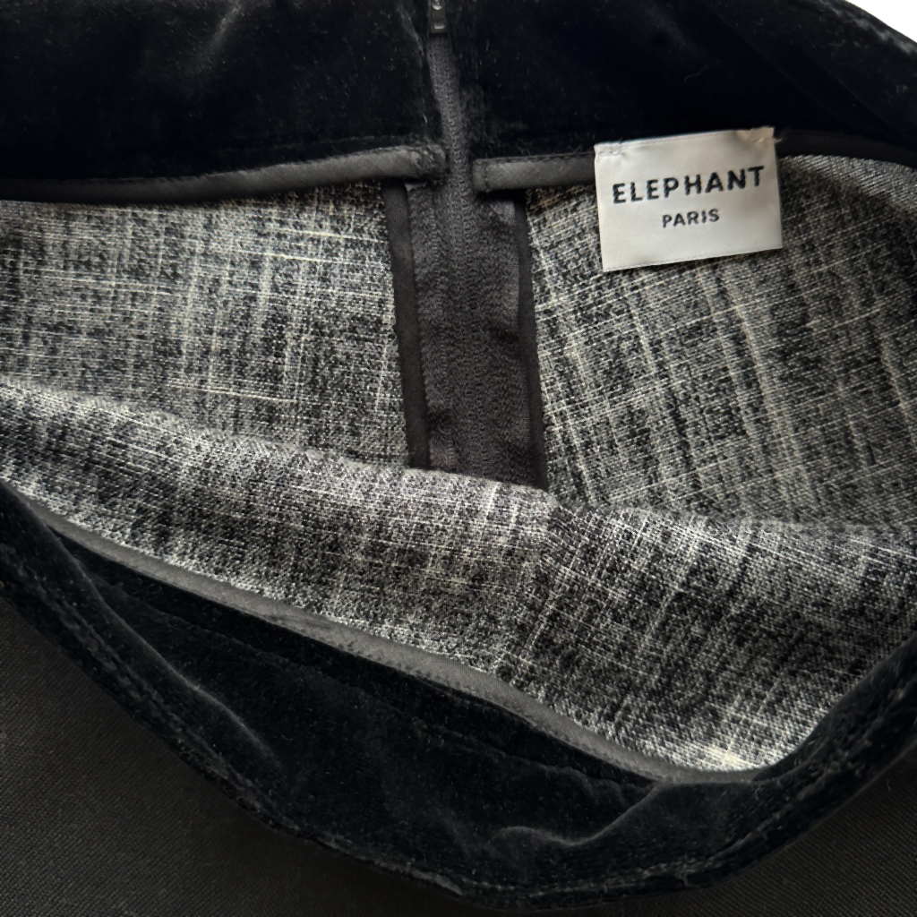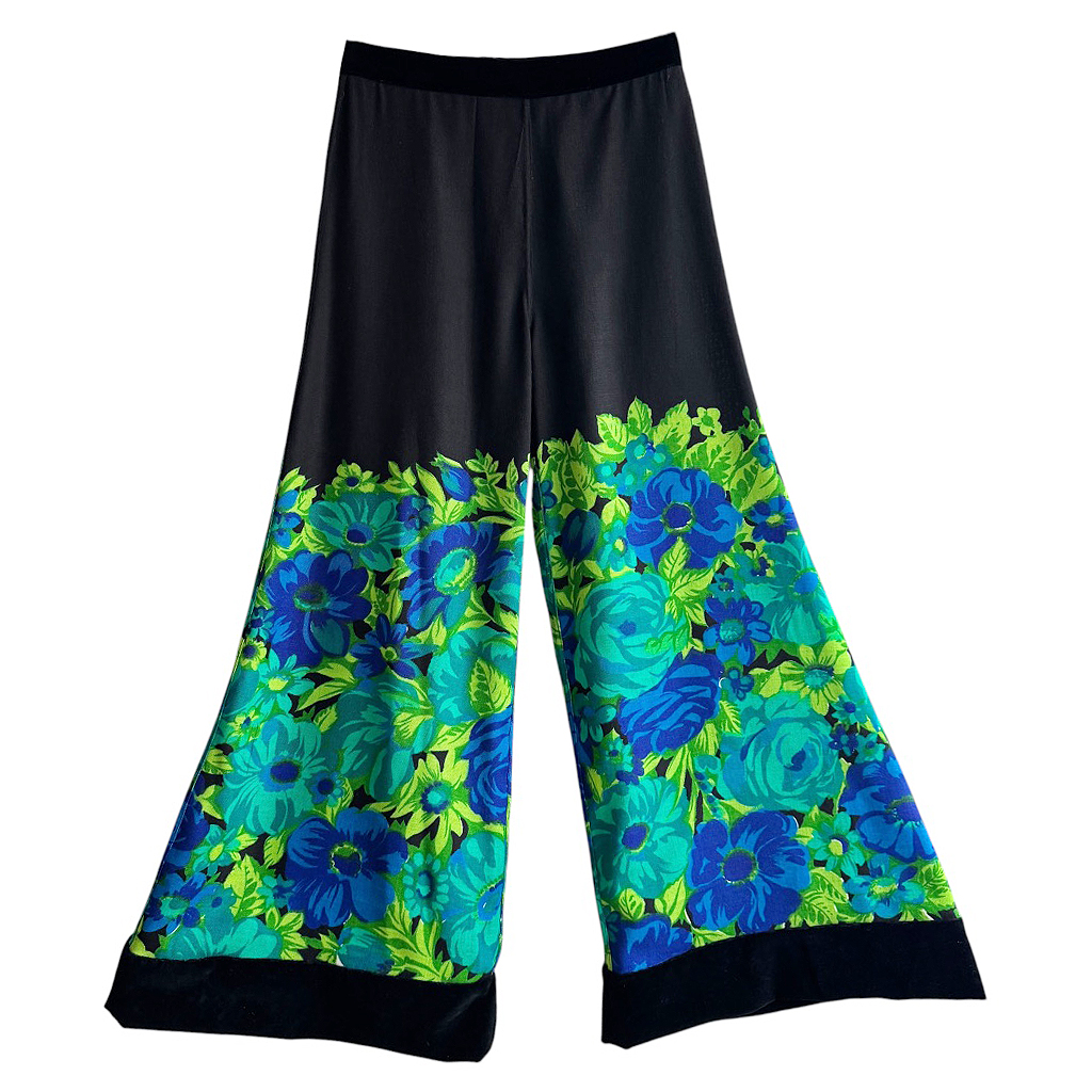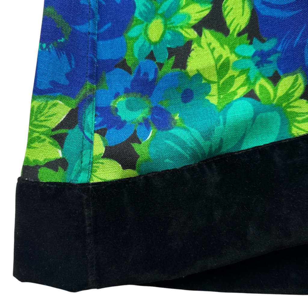 Flare velours lisse et lin fleuri Elephant Paris Design Design réalisé avec des matériaux anciens, velours de coton noir et lin coton à fleurs des années 70, coutures jeans Pièce unique Made in France, Taille haute 37cm, Hanches 45cm, Longueur entrejambes depuis la taille 31cm, Longueur 104cm, Longueur jambe depuis la fourche 75cm, Taille 36/38