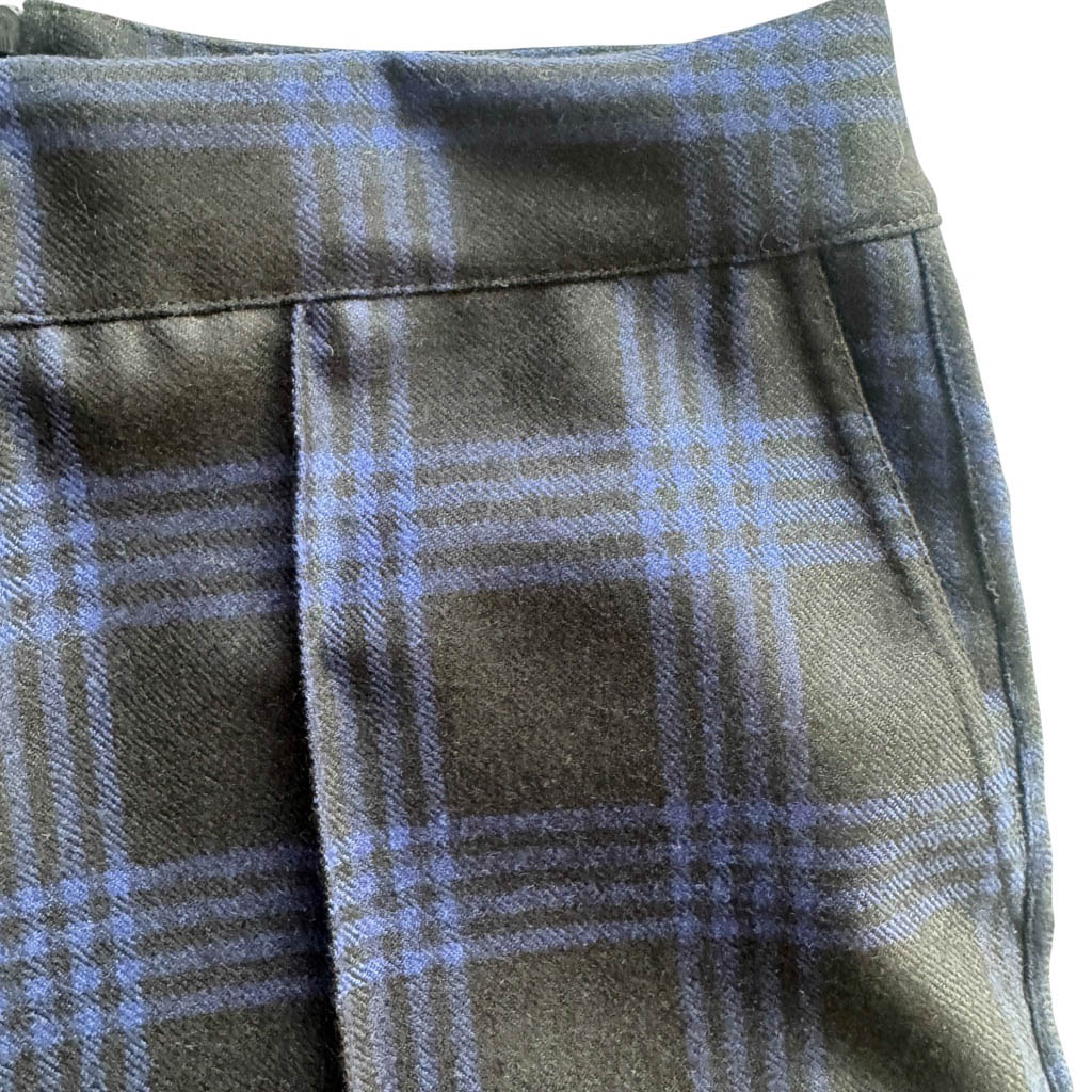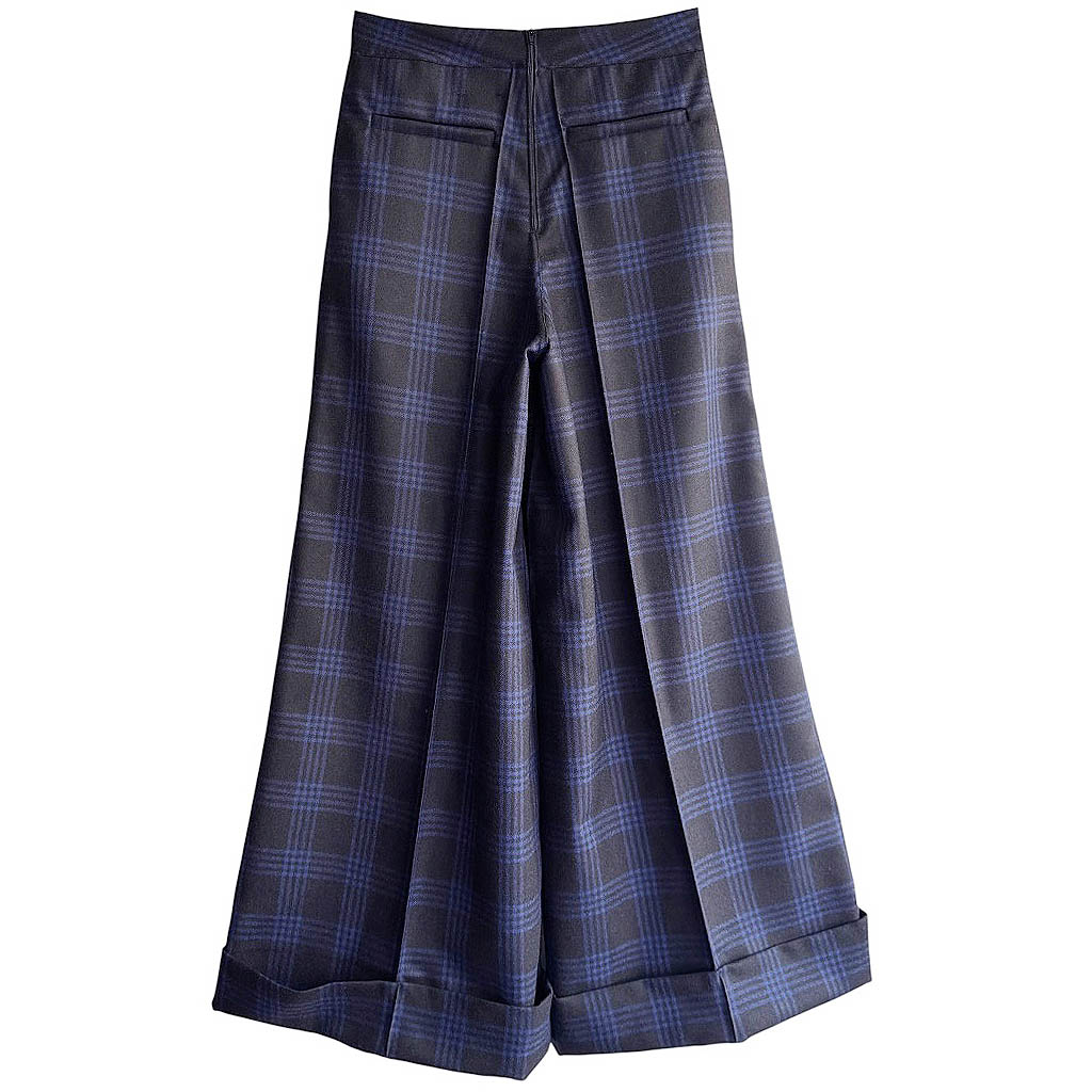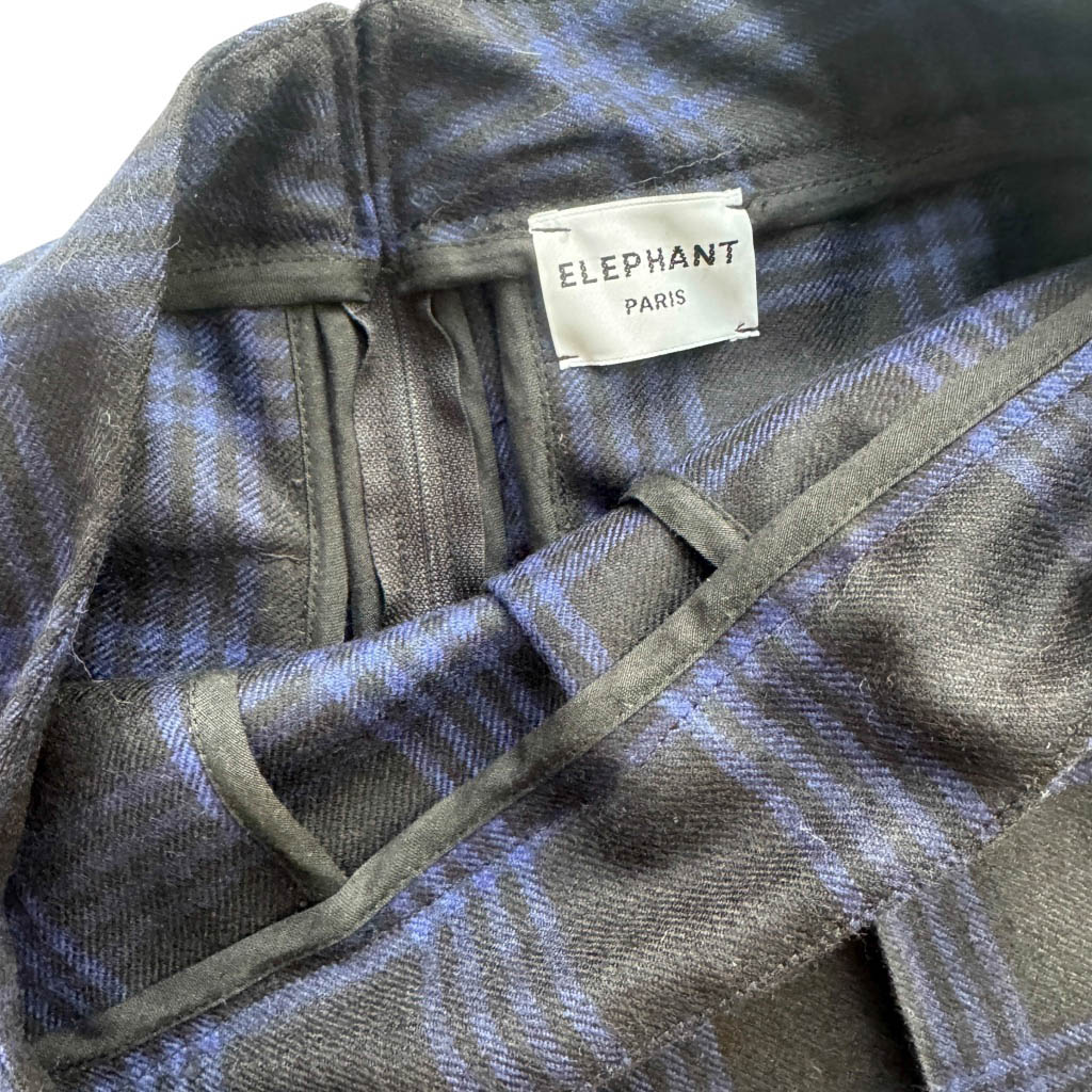 Flare Wild laine tartan noir bleu Elephant Paris Design Ce pantalon flare Elephant Paris est une pièce unique, entièrement conçue et fabriquée à Paris à partir de matériaux anciens d’exception.Son tissu principal, un Tartan fin et léger en pure laine, provient d’un stock neuf d’époque des années 1 9 8 0. Le zip arrière, lui aussi vintage neuf d’époque des années 1 9 7 0, complète ce design au charme intemporel. La taille très haute structure la silhouette, tandis que les poches italiennes à l’avant et les poches passe-poilées au dos apportent une allure soignée et pratique.Les énormes revers au bas de la jambe et la surpiqûre centrale devant et derrière allongent visuellement la…