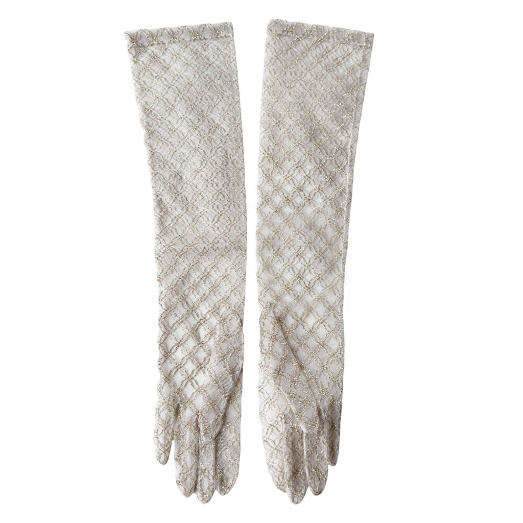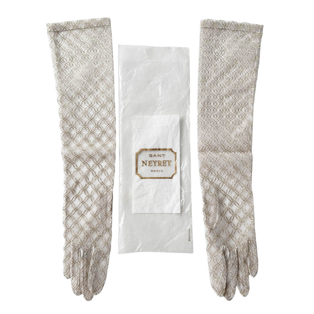 Gants lurex or voile blanc Neyret Elephant Paris Vintage Gants longs vintages des années 1960, de la marque Neyret, connue aussi pour sa lingerie, en lurex et nylon légèrement extensible, neufs d’époque dans leur emballage, taille 6/5, Longueur du bout des doigts au sommet 47 cm, fabriqués en France