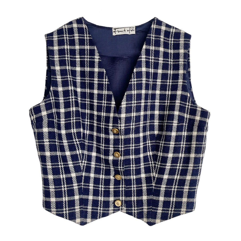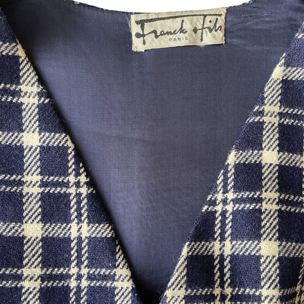 Gilet tartan Franck et Fils Gilet en lainage tartan Franck et Fils Elephant Paris Vintage cintré, fermé par cinq boutons en métal doré, doublé, Taille S/M Mesures à plat : Epaules 35cm, Poitrine 47cm, Longueur dos 41cm, Taille 38/40
