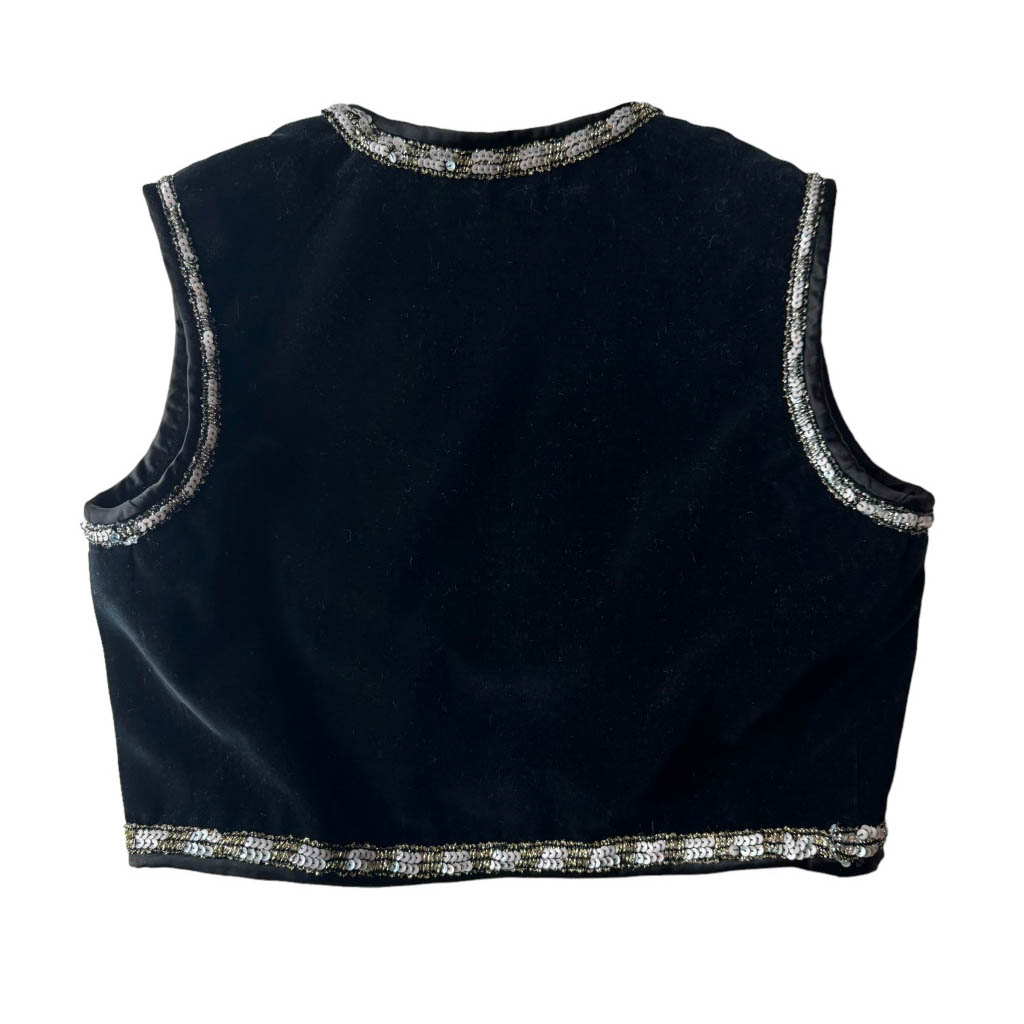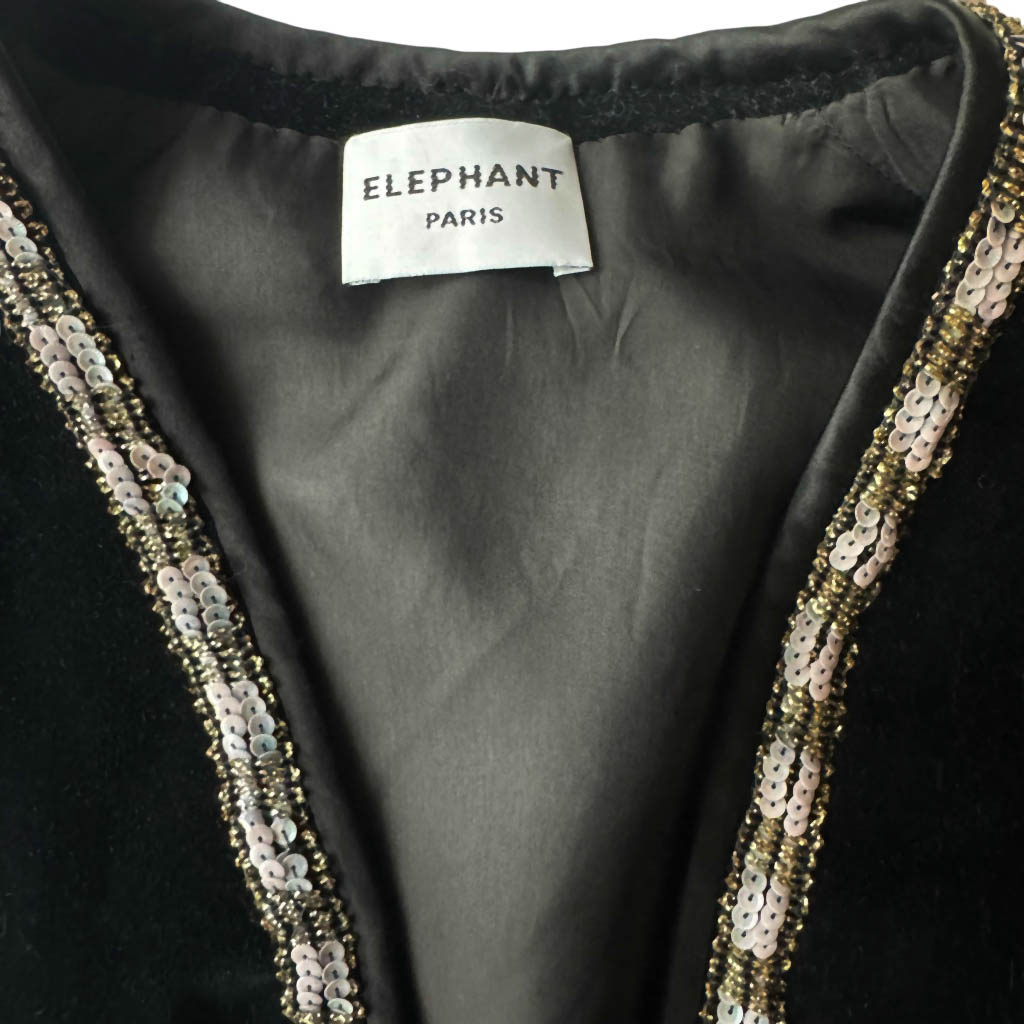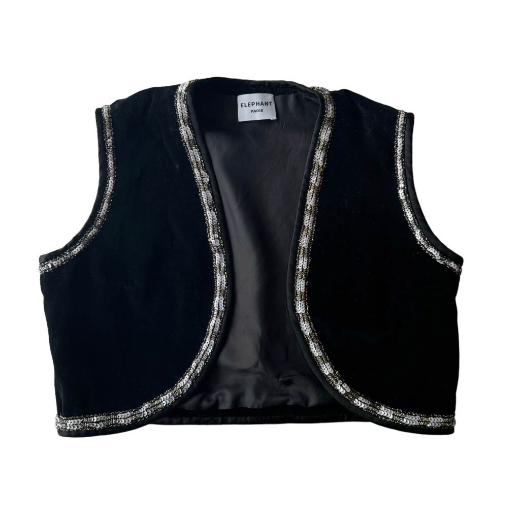 Gilet velours noir paillettes Elephant Paris Design Travail d’upcycling et de couture à la main réalisé sur un gilet en velours lisse ancien des années 70, sequins et doublure cousus à la main Pièce unique Made in France, Longueur dos 40cm, Taille XS/S
