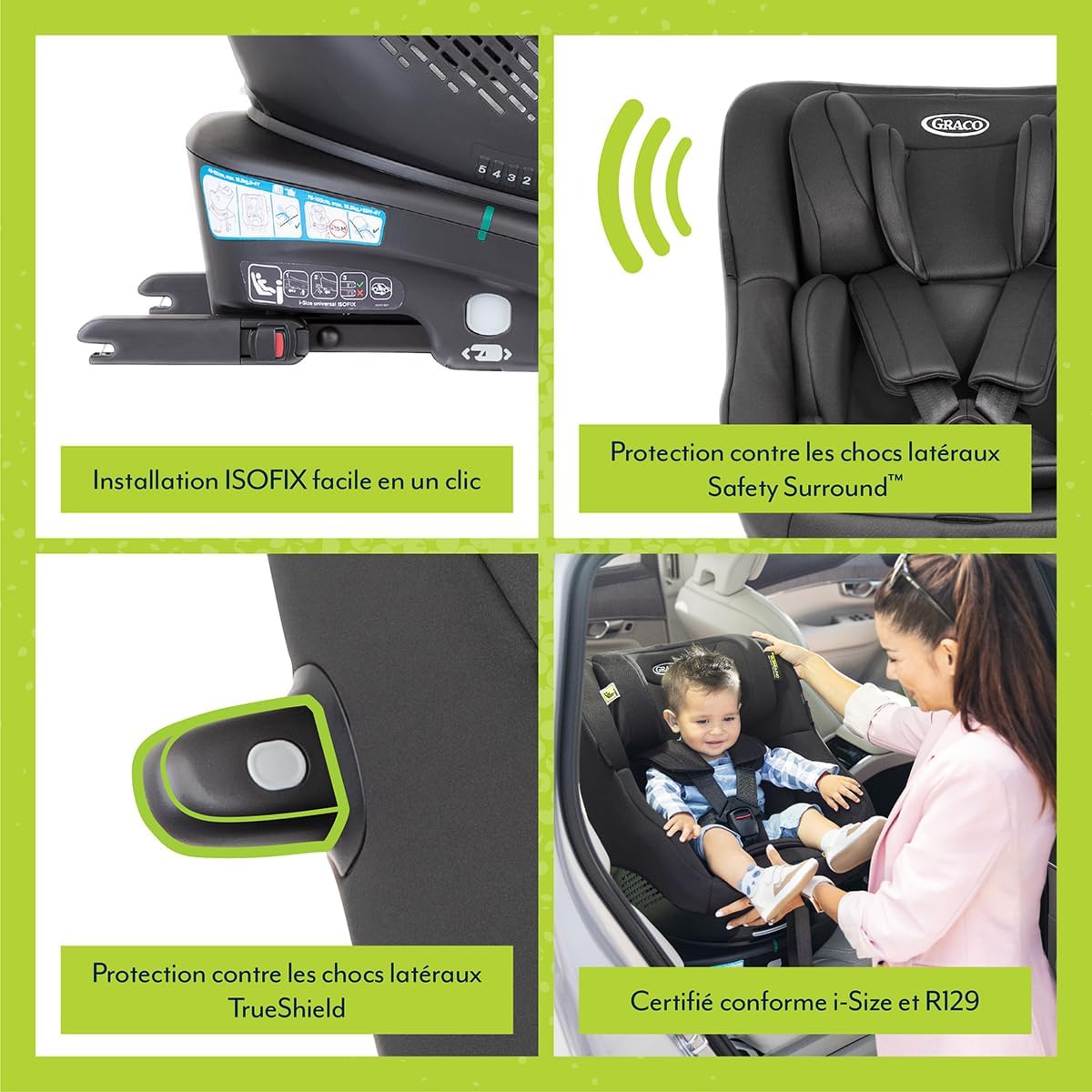 Offrez à votre enfant une sécurité optimale avec le Graco Turn2Me i-Size R129, un siège auto rotatif à 360° qui allie confort et innovation, garantissant des trajets sereins de la naissance à 4 ans.