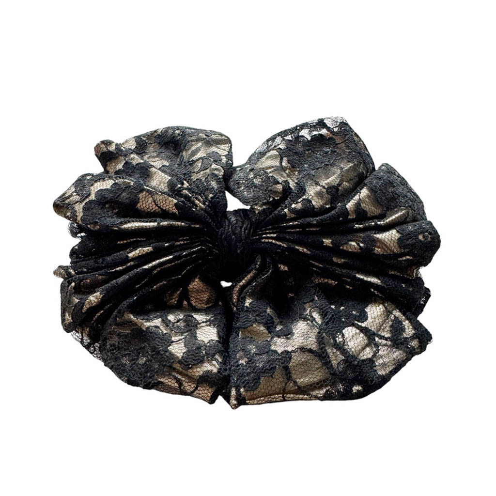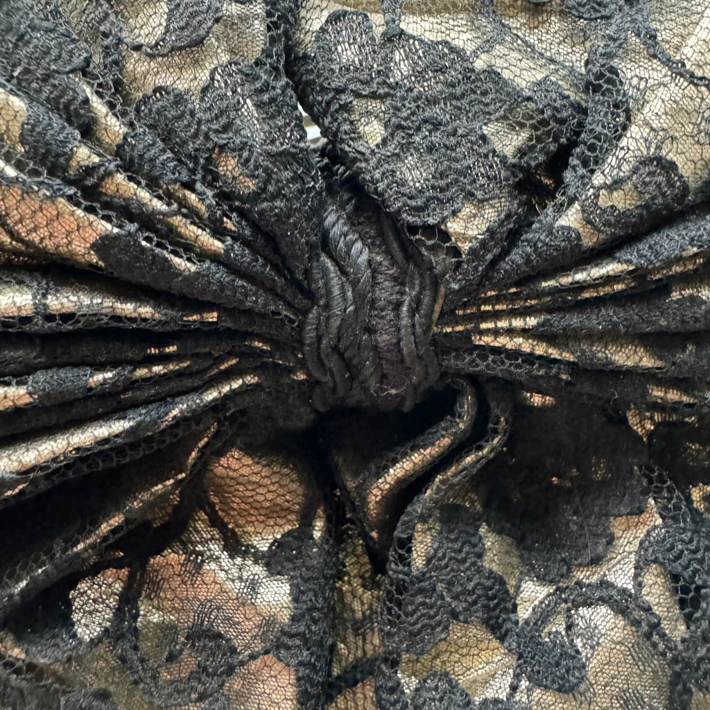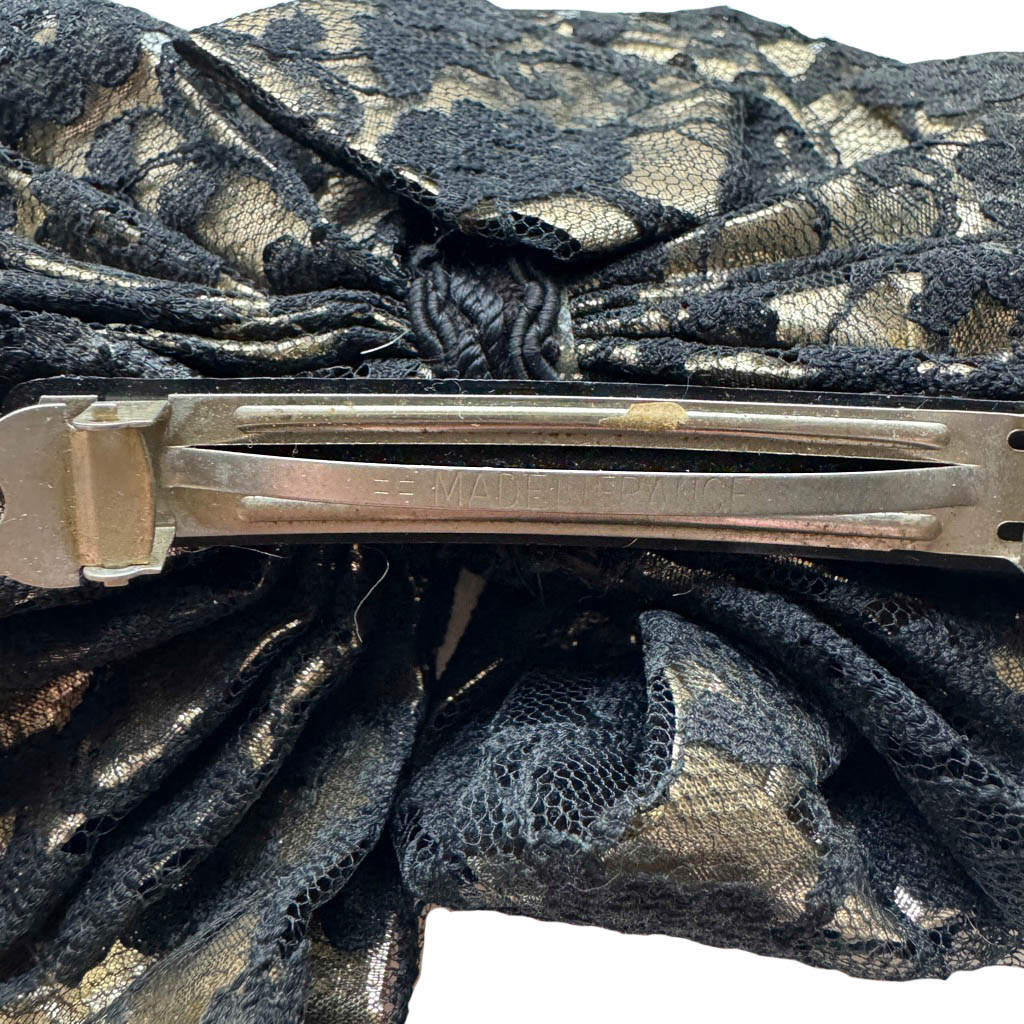 Grosse barette or et dentelle Elephant Paris Vintage Très bel accessoire pour cheveux vintage et emblématique des années 1 9 8 0 en lurex doré superposé de dentelle noire, froncé et drapé comme une fleur de tissus, taille unique, made in France, montée sur une barrette en métal, très beau bijoux pour sublimer une coiffure, bon état général Dimensions : 1 6 cm X 1 3 cm