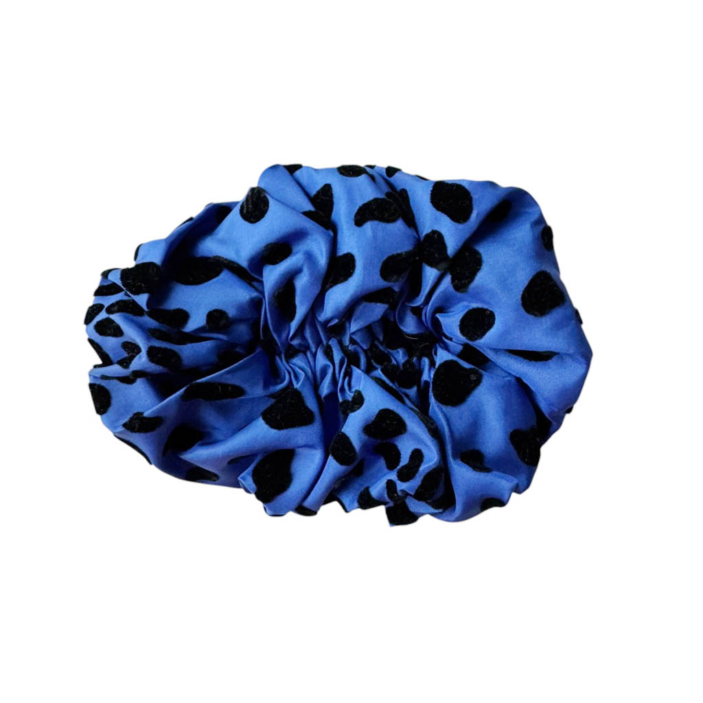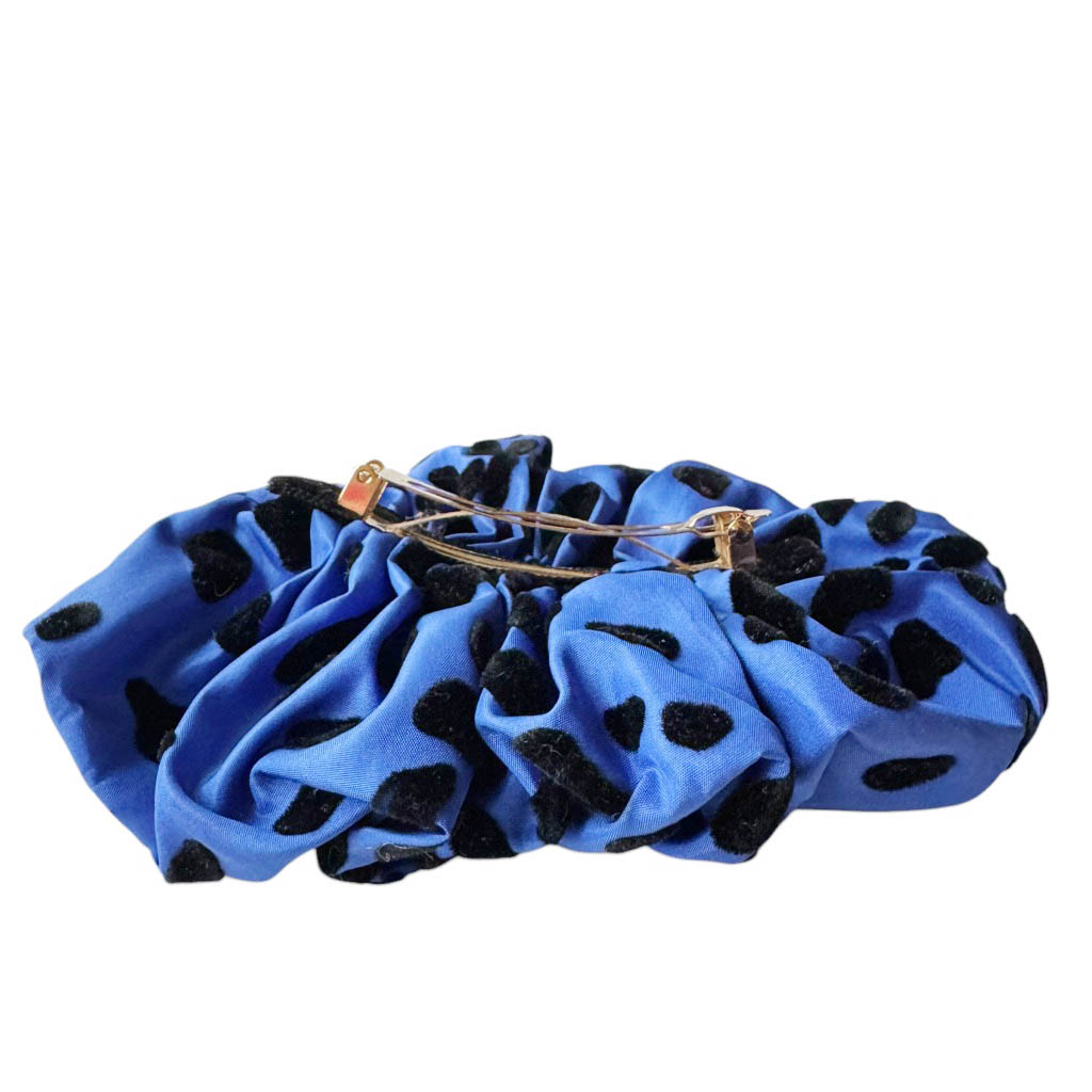 Grosse barrette cheveux taffetas bleu noir Elephant Paris Vintage Très bel accessoire pour cheveux neuf d’Ă©poque vintage et typique des annĂ©es 80 en taffetas et pois en velours mat, froncĂ© et drapĂ© comme une fleur de tissus, taille unique, made in France, montĂ©e sur une barrette en mĂ©tal dorĂ©, très beau bijoux pour sublimer une coiffure Dimensions : 10 cm X 6 cm