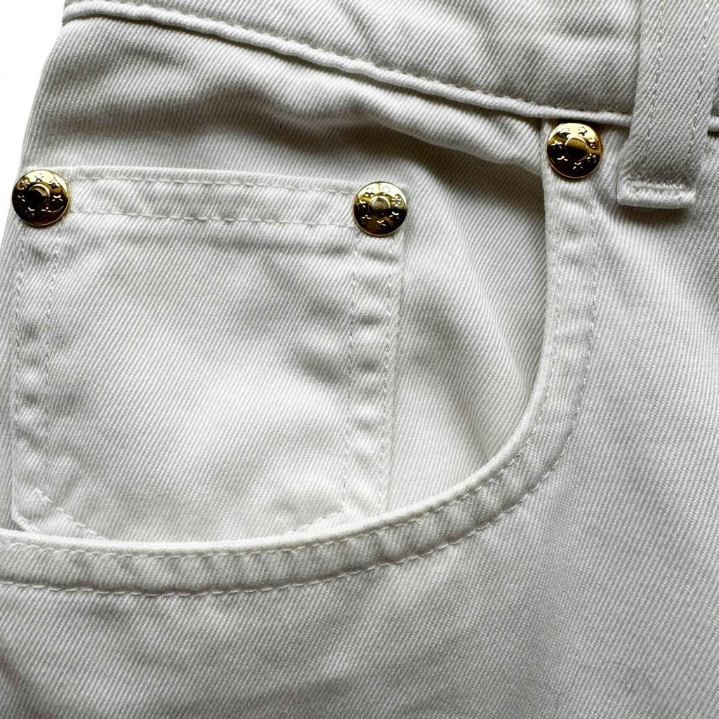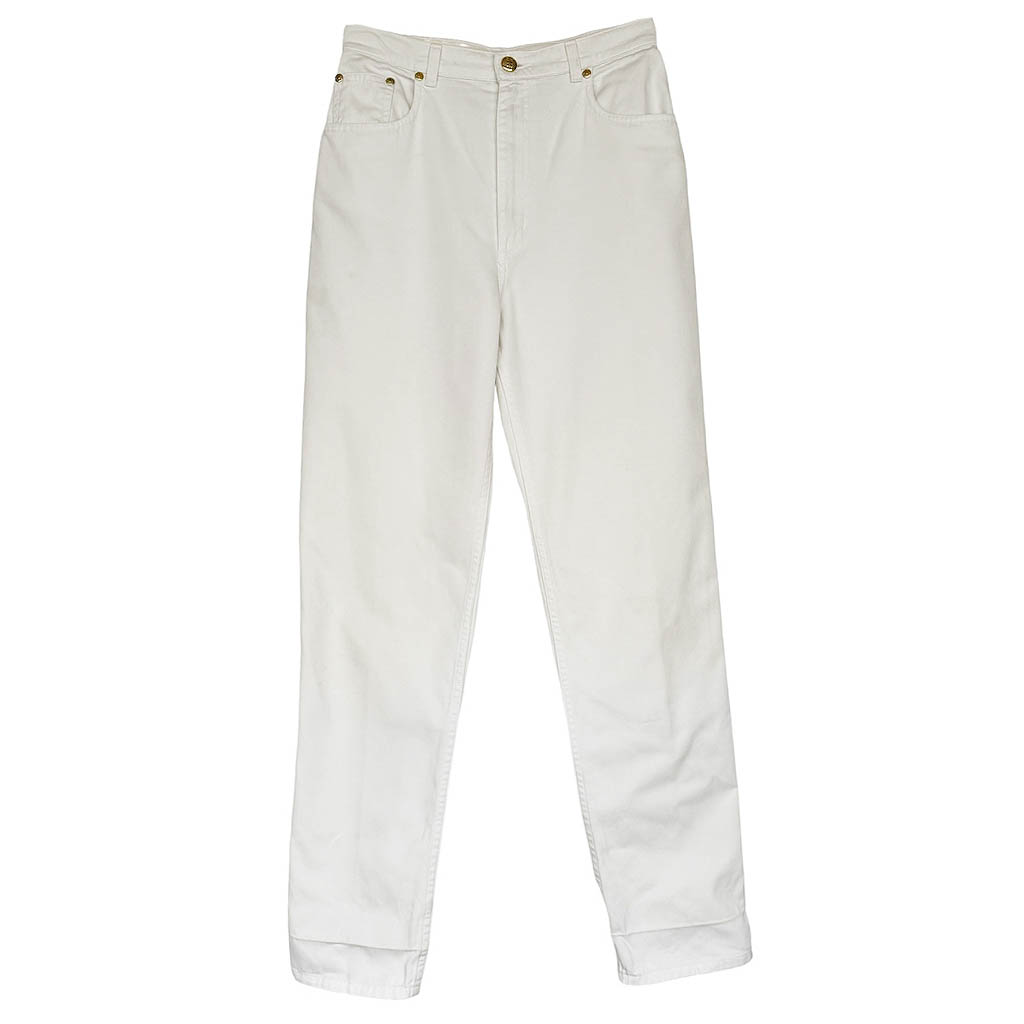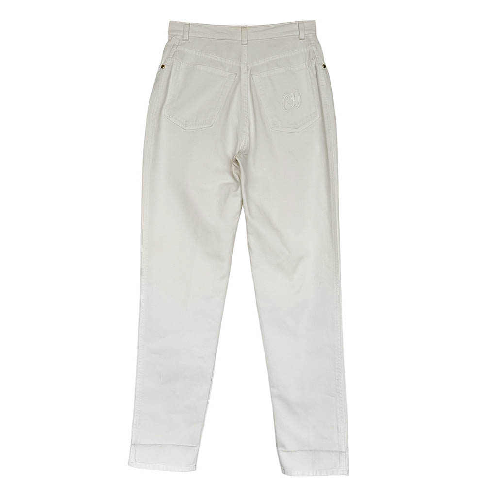 Jean blanc Christian Dior Elephant Paris vintage Années 80, coton et stretch, Mesures à plat : Taille haute 35cm, Longueur entrejambes depuis la taille 31cm, Hanches : 43cm, Longueur 103cm