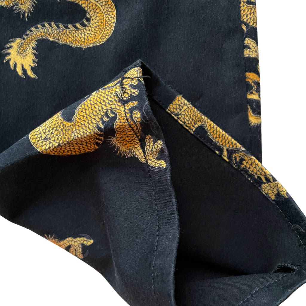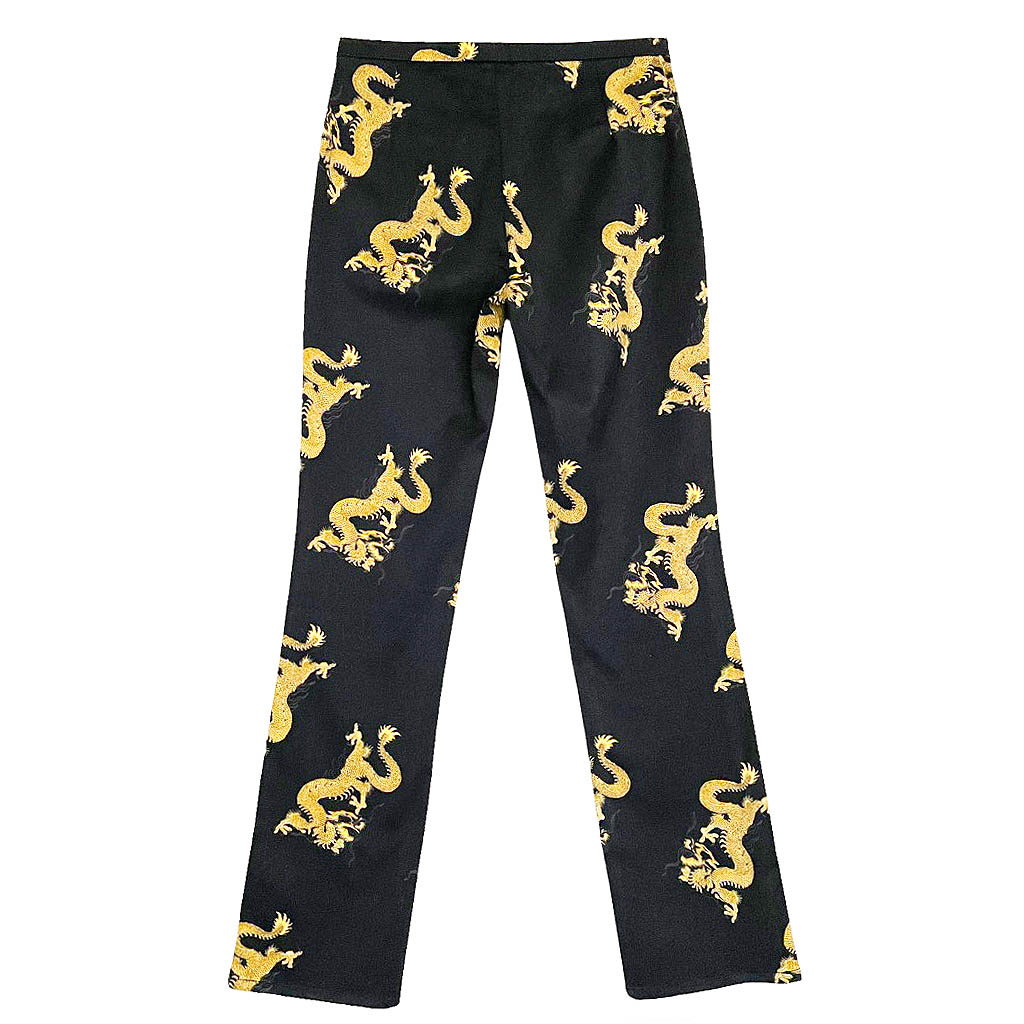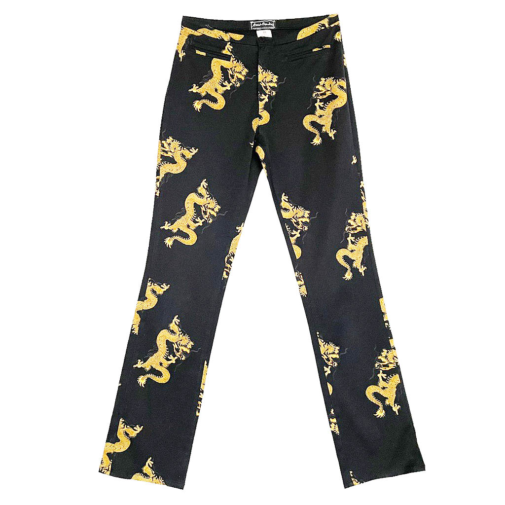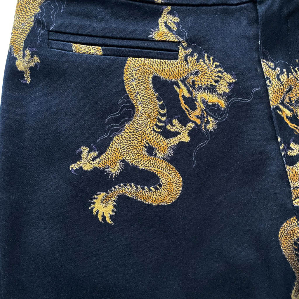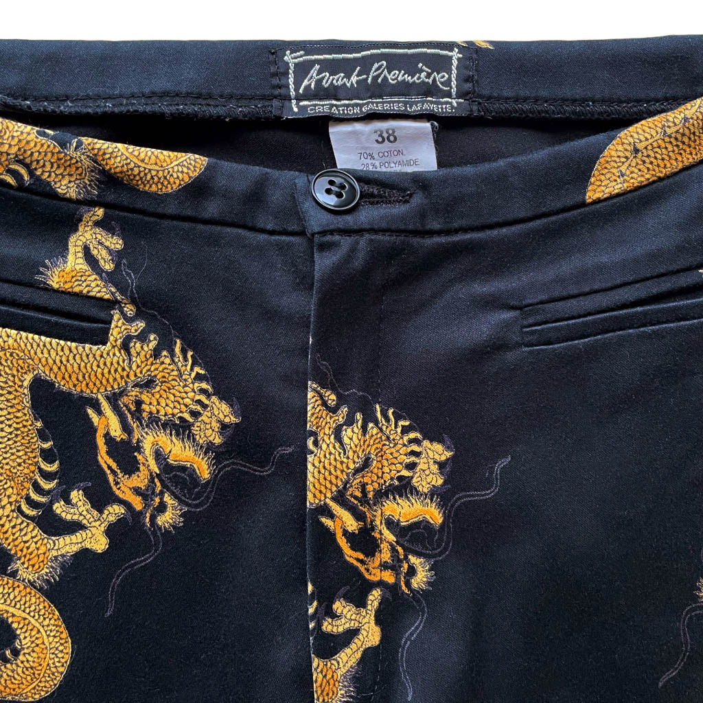 Jeans dragons Galeries Lafayette Jeans en coton et lycra noir imprimé de dragons dorés, deux vraies poches devant à découdre, Avant Premiere Galeries Lafayette Elephant Paris vintage Mesures à plat : Taille 34/37cm, Hanches 46/50cm, Longueur entrejambes 23cm, Longueur 96cm, Taille 38