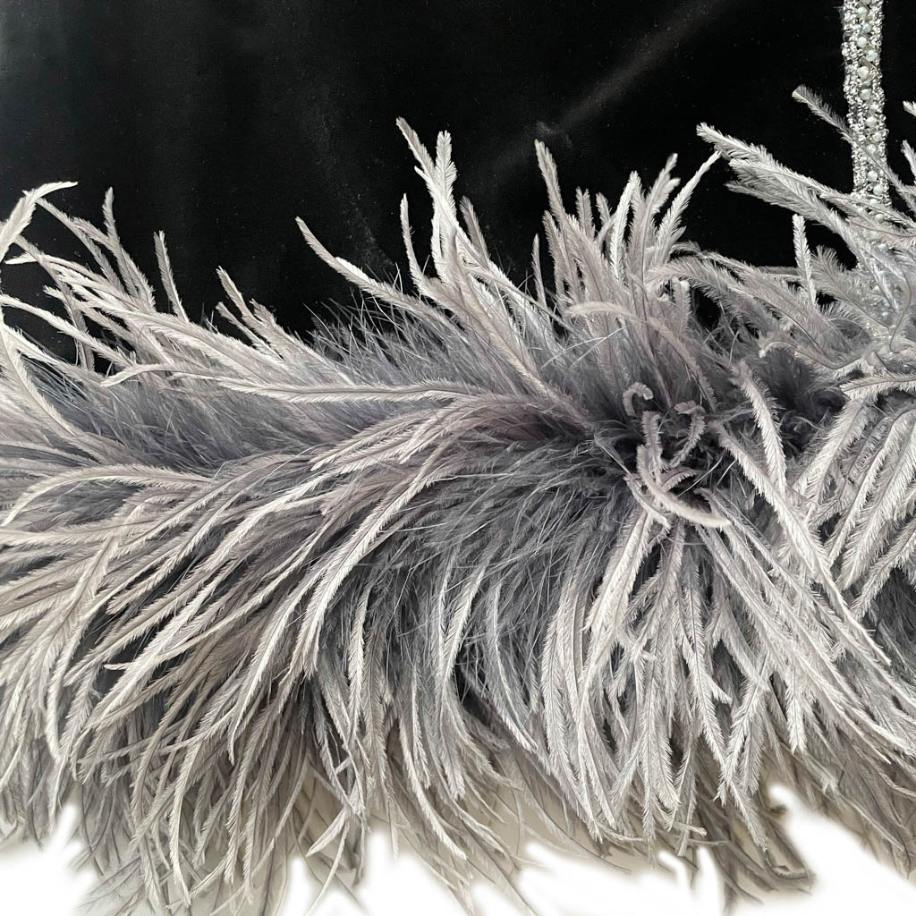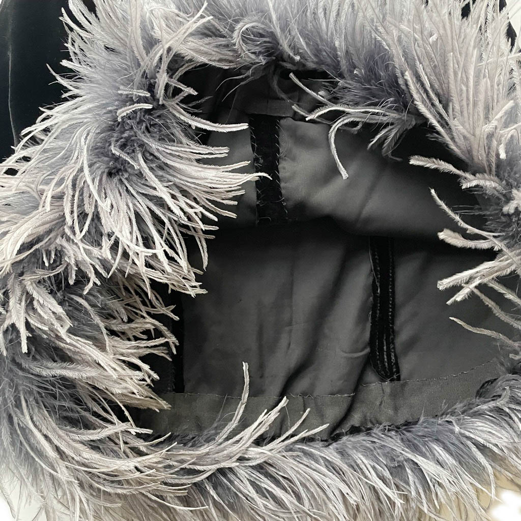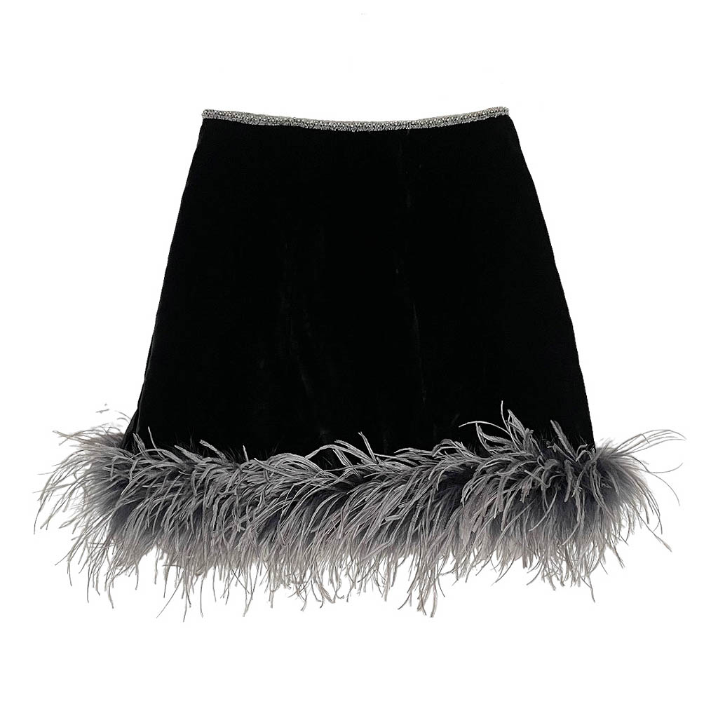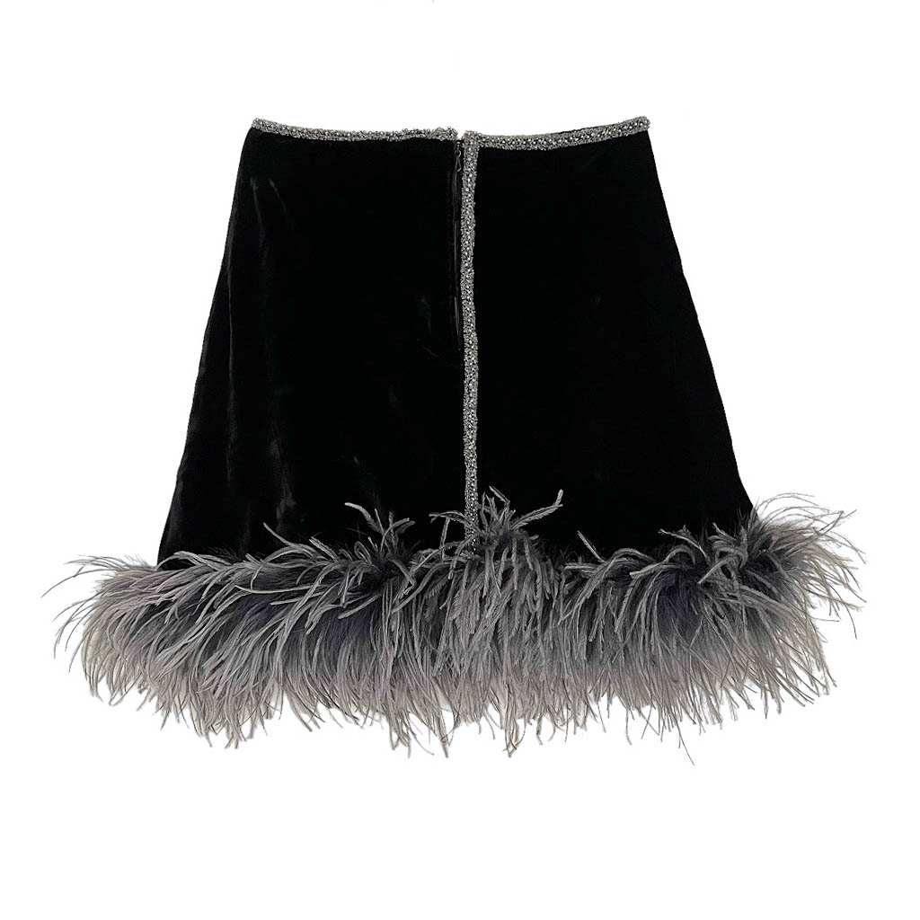 Jupe velours soie plumes et verroterie, velours de soie Palatine plumes d’autruches et verroterie ancienne Elephant Paris Couture Design réalisé avec des matériaux anciens, Pièce unique Made in France Mesures à plat : Taille 34cm, Hanches 46cm, Longueur 42cm, Taille 36
