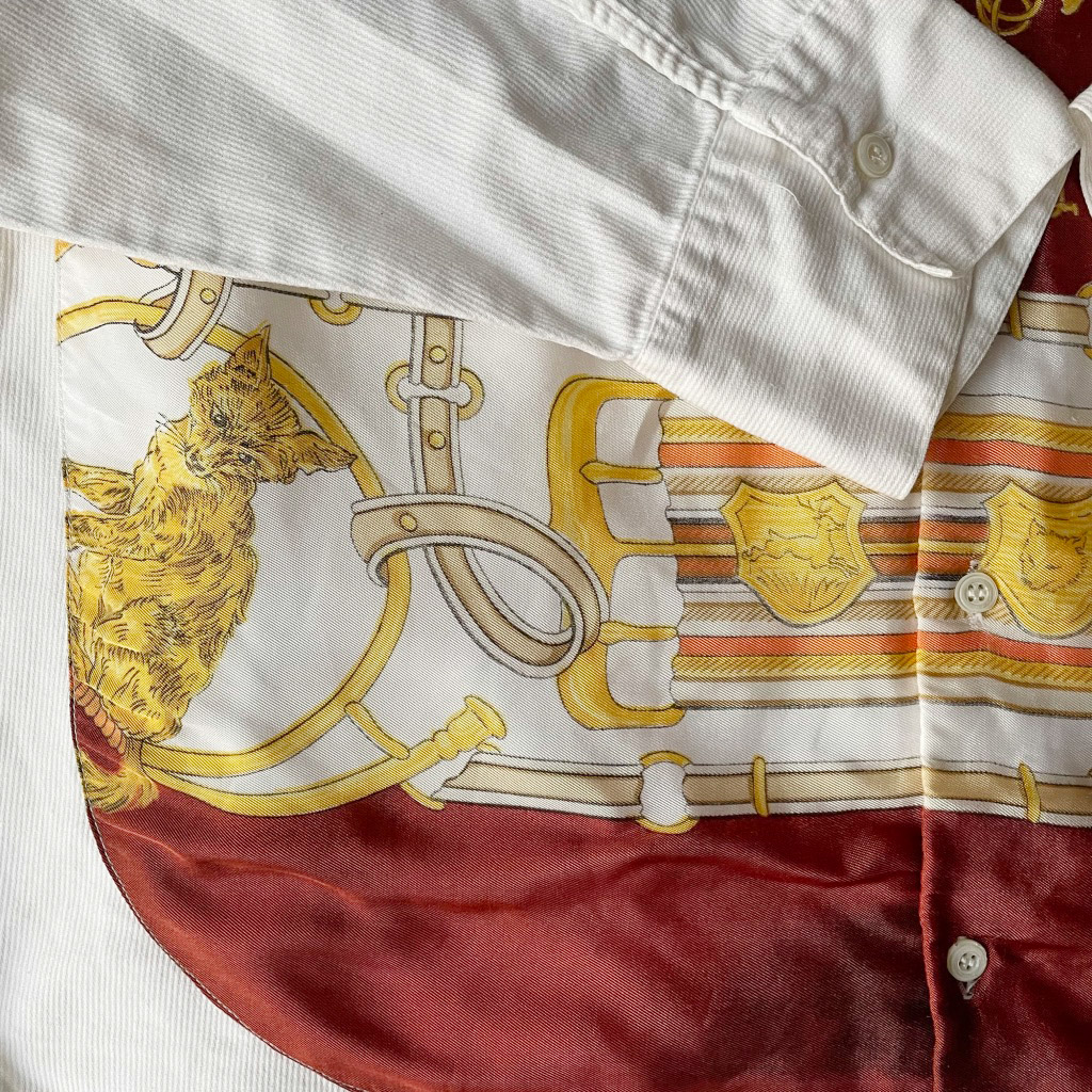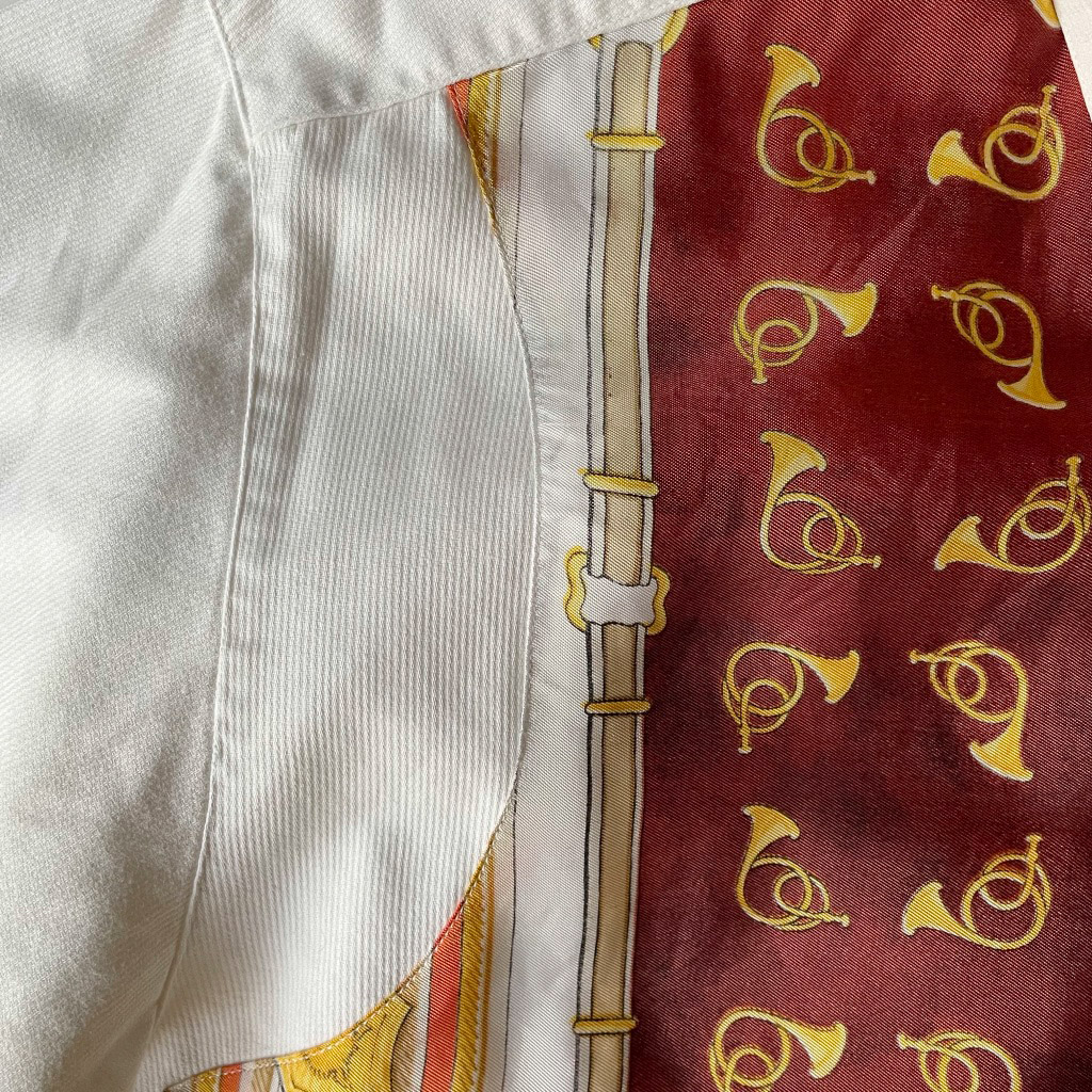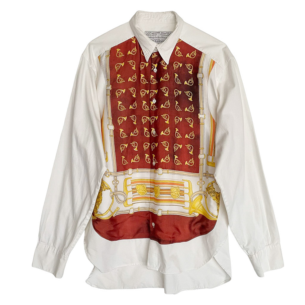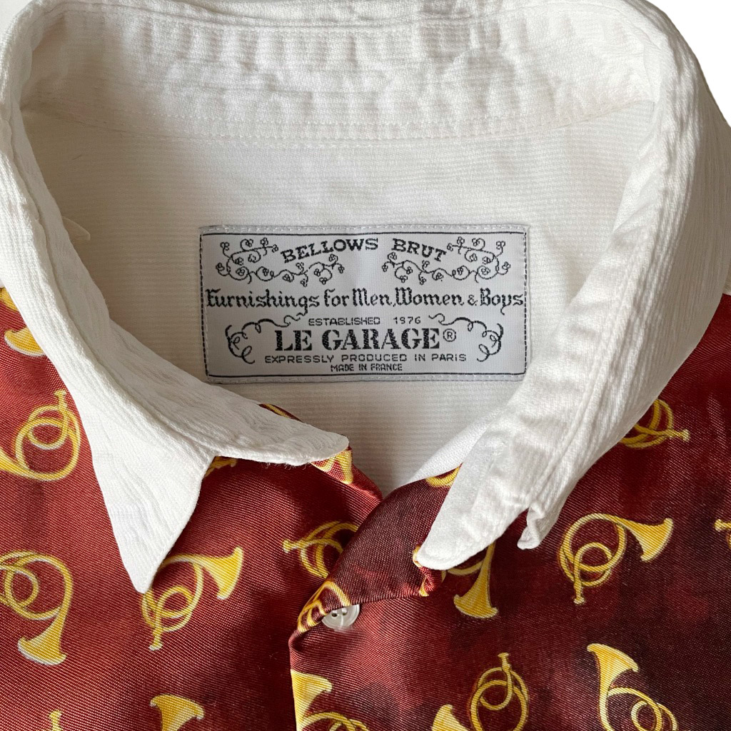 Chemise blanche en coton à plastron de soie Le Garage, cor de chasse, vintage années 80 Elephant Paris Vintage Mesures à plat : Epaules 45cm, Poitrine 56cm, Longueur dos 81cm, Taille globale 38/40