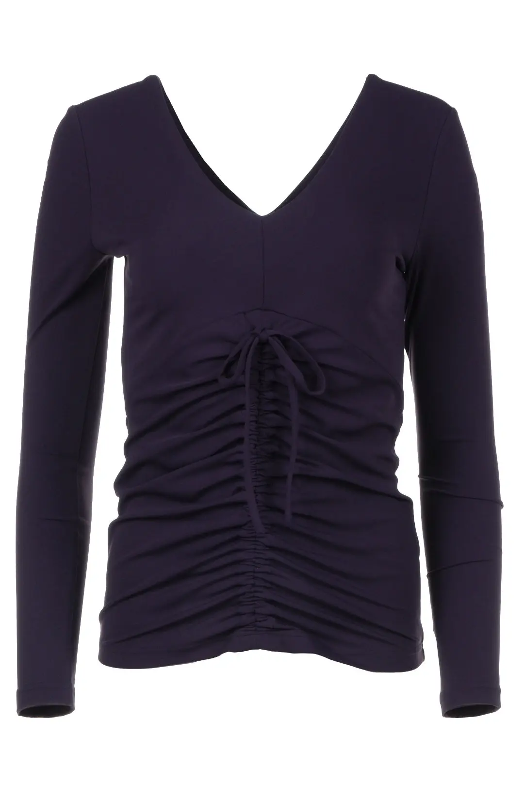 Extensible et doux comme tout, voici Lina, le chandail mauve foncé. Telle une seconde peau, sa coupe galbante est parfaitement ajustée et son col en V au-devant et au dos crée un effet séduisant. Sans oublier la touche finale : les fronces pour flatter la silhouette.
