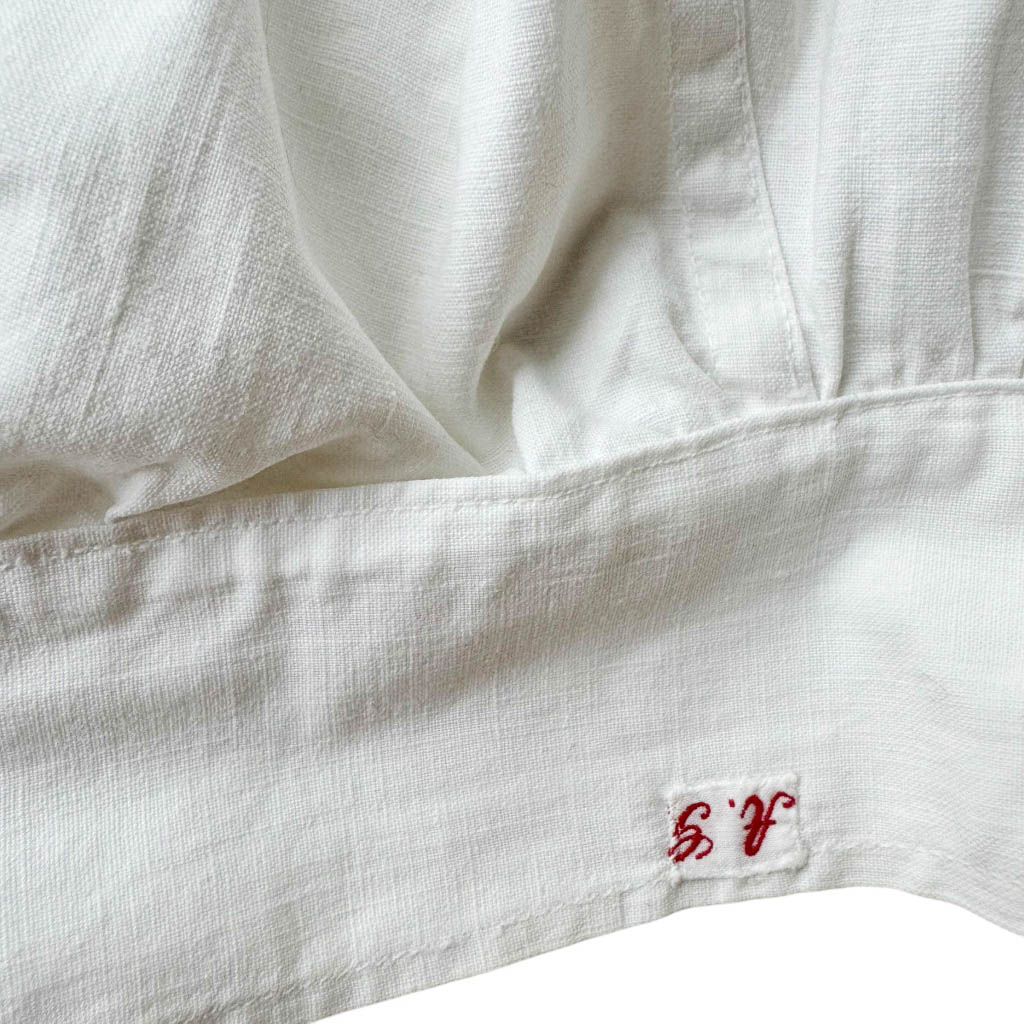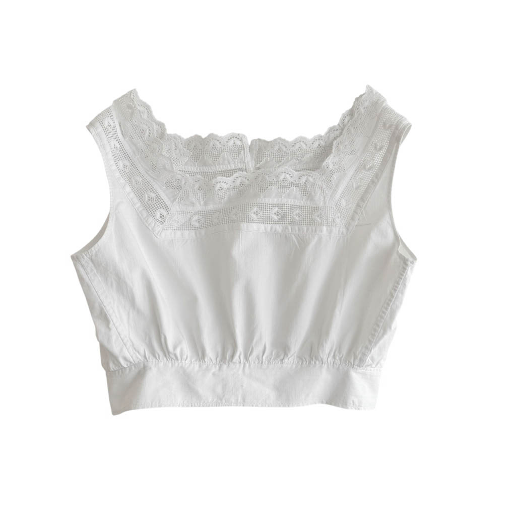 Lingerie 1905 crop top brassière AG Elephant Paris Vintage Ravissant top sans manches en pur coton et dentelle, brodé à la main AG au fil rouge d’époque 1 9 0 0, les finitions et les boutonnières sont cousues à la main Très bel état général, boutonnage se fait dans le dos, la taille haute est marquée, Taille globale X S – 3 4 / 3 6