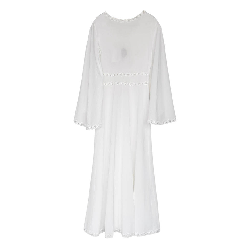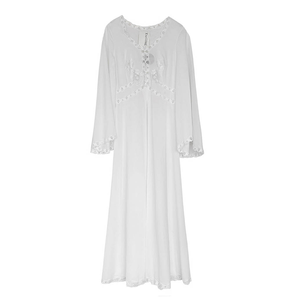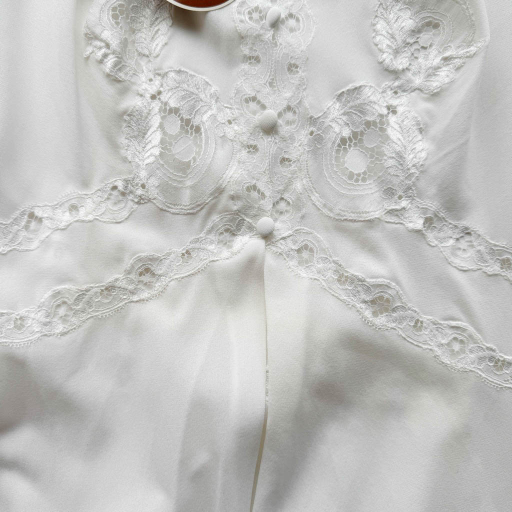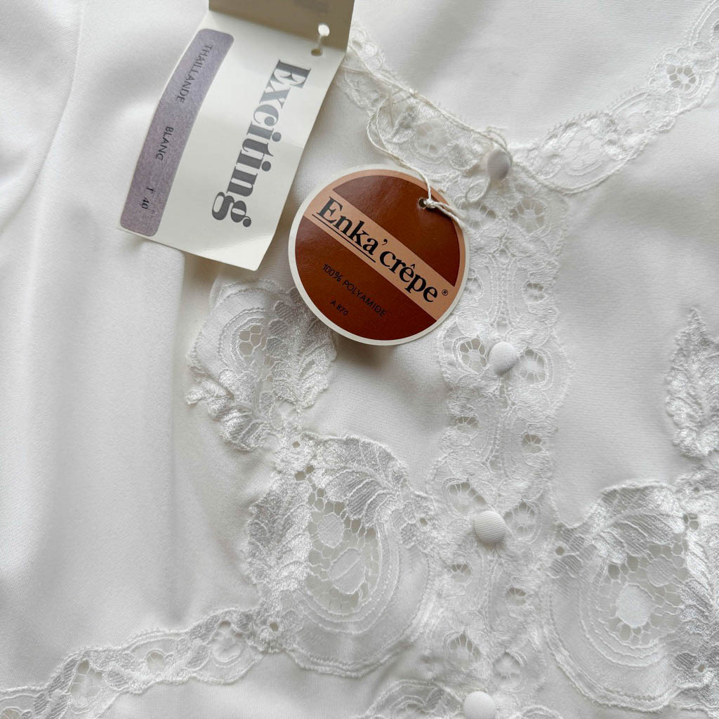Long déshabillé blanc Exciting Elephant Paris Vintage Joli déshabillé en nylon de belle qualité, légèrement transparent et fluide, vintage datant des années 1 9 7 0, petit boutonnage devant par quatre boutons, sur taille style empire et orné de dentelle, marquant bien le buste et la taille, ajustée, manches longues pagodes, neuf d’époque, 1 0 0 % polyamide Mesures prises à plat : Epaules : 3 7 c m, Poitrine : 4 2 c m, Taille : 3 5 c m, Longueur dos : 1 2 4 c m, Taille globale : S – 36 / 38
