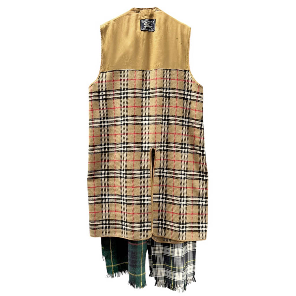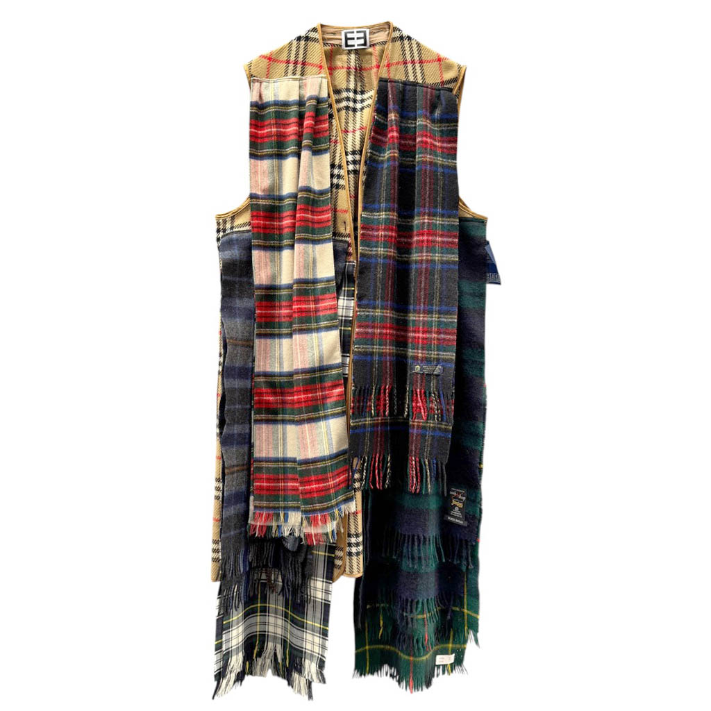 Manteau écharpes Burberrys upcycling N1 Elephant Paris Design Pièce unique fabriquée à Paris Travail d’upcycling réalisé à partir d’une doublure de trench coat classique et vintage, Burberry’s en pure laine. Ce manteau gilet sans manches réinvente l’élégance britannique à travers un assemblage minutieux de six écharpes en pure laine tartan écossais et mohair écossais.Il offre une texture riche, un tombé souple et un confort incomparable. Très chaud et très agréable à porter, il accompagne la silhouette tout en laissant une grande liberté de mouvement. Ouvert devant, sans boutonnage, fendu au dos à mi-hauteur, pour une allure fluide et contemporaine. Il…