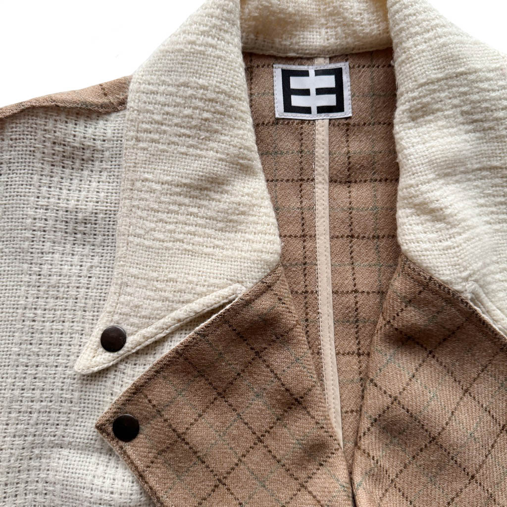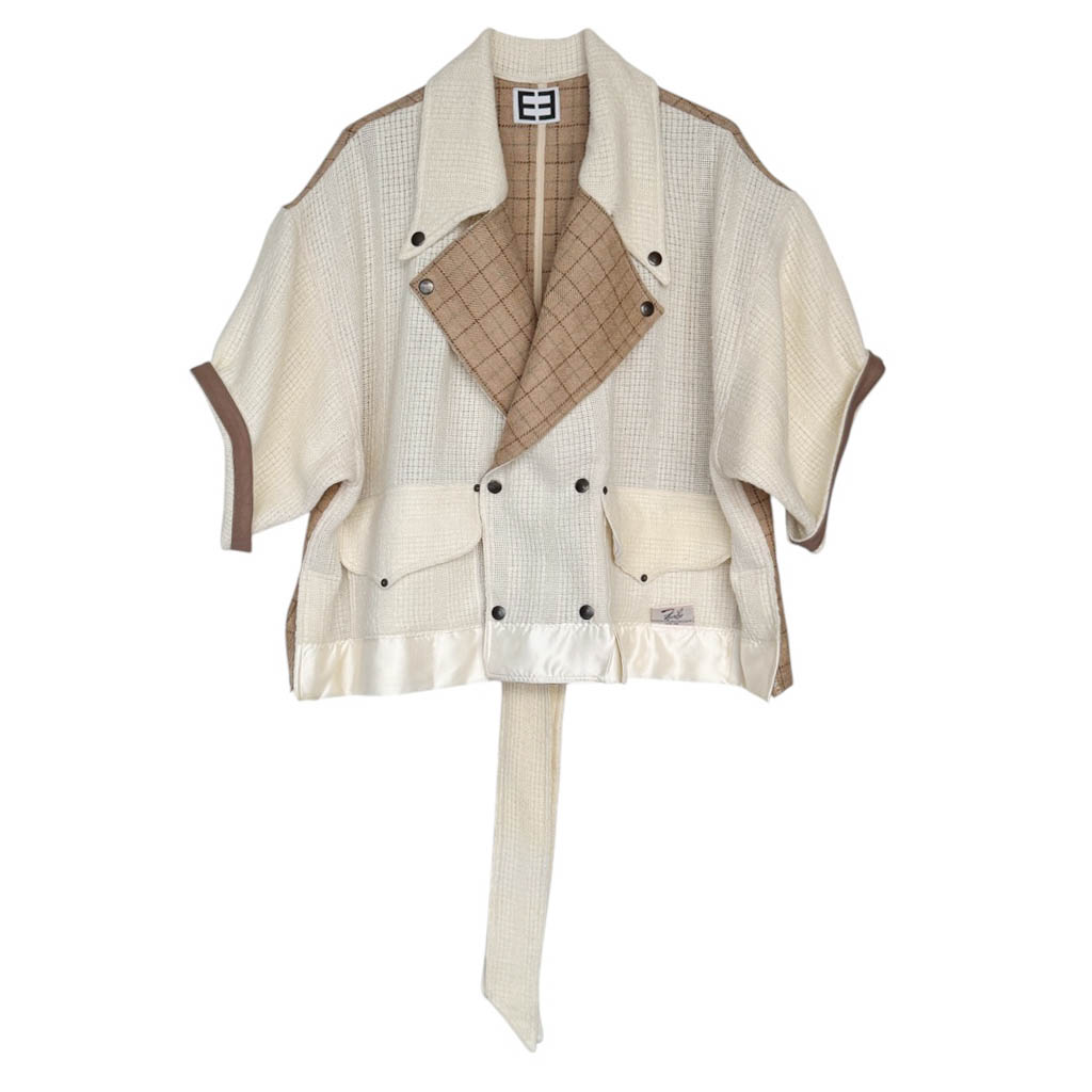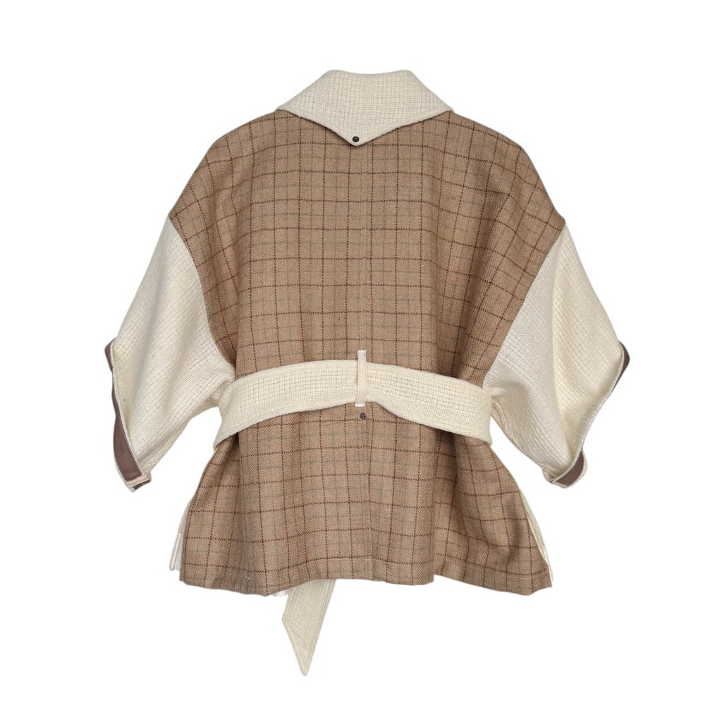 Manteau OV Owl Crop Wool N2 Elephant Paris Design Manteau OV Owl Crop 1 0 0 % pure laine – Taille Unique – Oversize Pièce unique fabriquée à Paris, le manteau O W L incarne l’esprit d’Elephant Paris : des créations singulières réalisées à partir de matériaux anciens et nobles, soigneusement sélectionnés pour leur caractère et leur histoire. Ce modèle est confectionné avec un lainage doux et léger, légèrement ajouré, provenant d’une couverture américaine vintage neuve d’époque, datant des années 1 9 7 0, au tombé dense et structuré. Et le dos est composé d’un tartan pure laine couleur beige.…