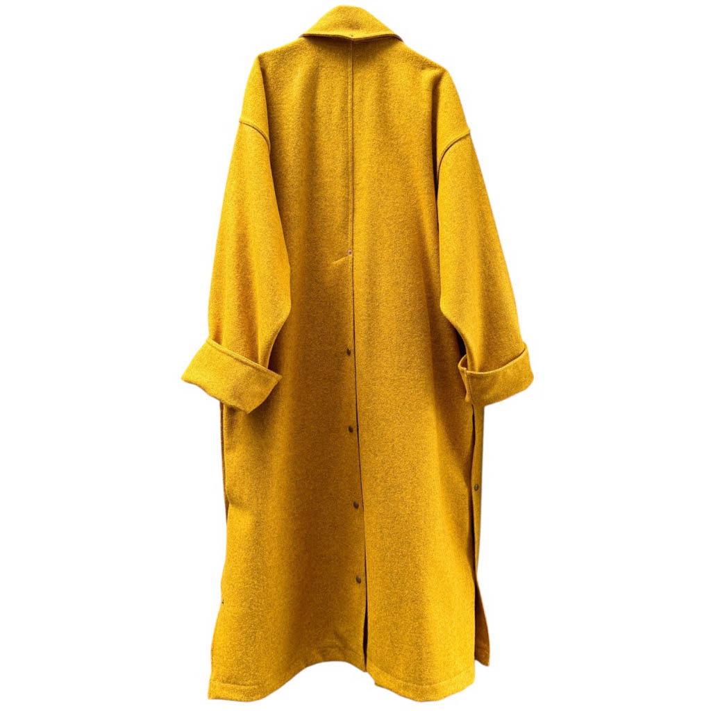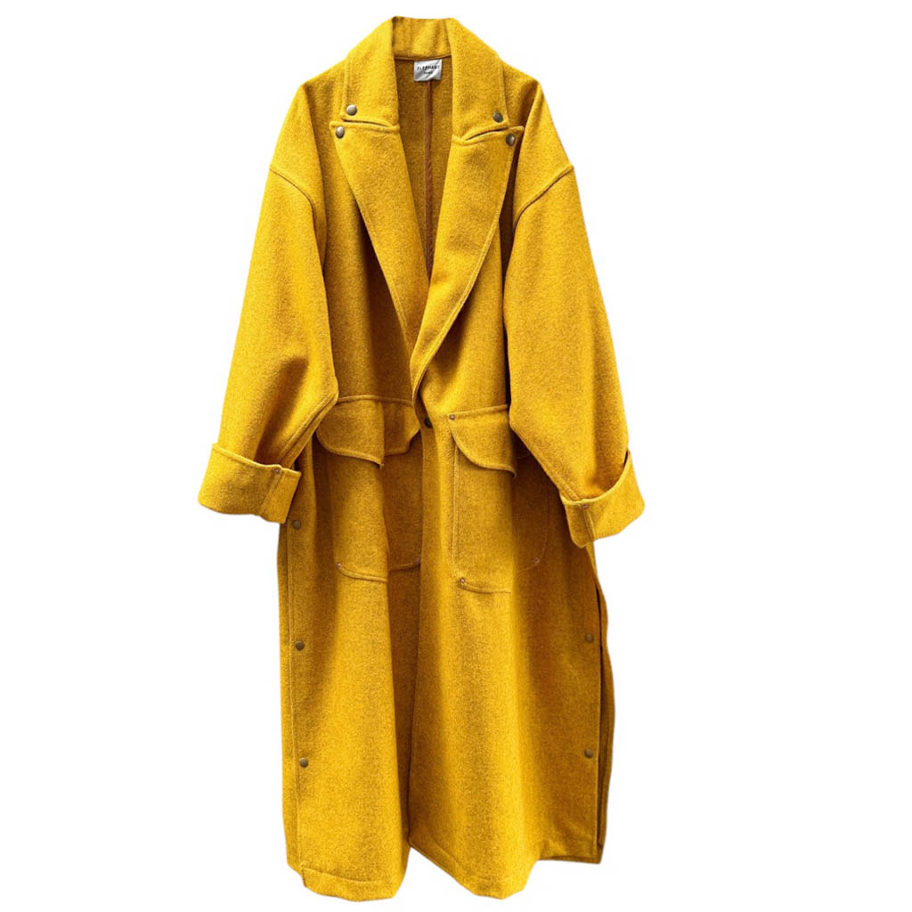 Manteau OV Owl laine moutarde Elephant Paris Design Ce design est réalisé avec des matériaux anciens, drap de laine épais neuf d’époque des années 1 9 8 0, couleur moutarde, grandes poches doublées en soie imprimée Italienne, les finitions sont gansées au biais de coton couleur camel, coutures anglaises Cette pièce unique est entièrement fabriquée à Paris, les rivets et les pressions en métal argenté sont faites en Italie et posées à la main à Paris Mesures prises à plat : Epaules : 6 4 c m, Poitrine : 7 8 c m, Longueur dos : 1 3 6 c…
