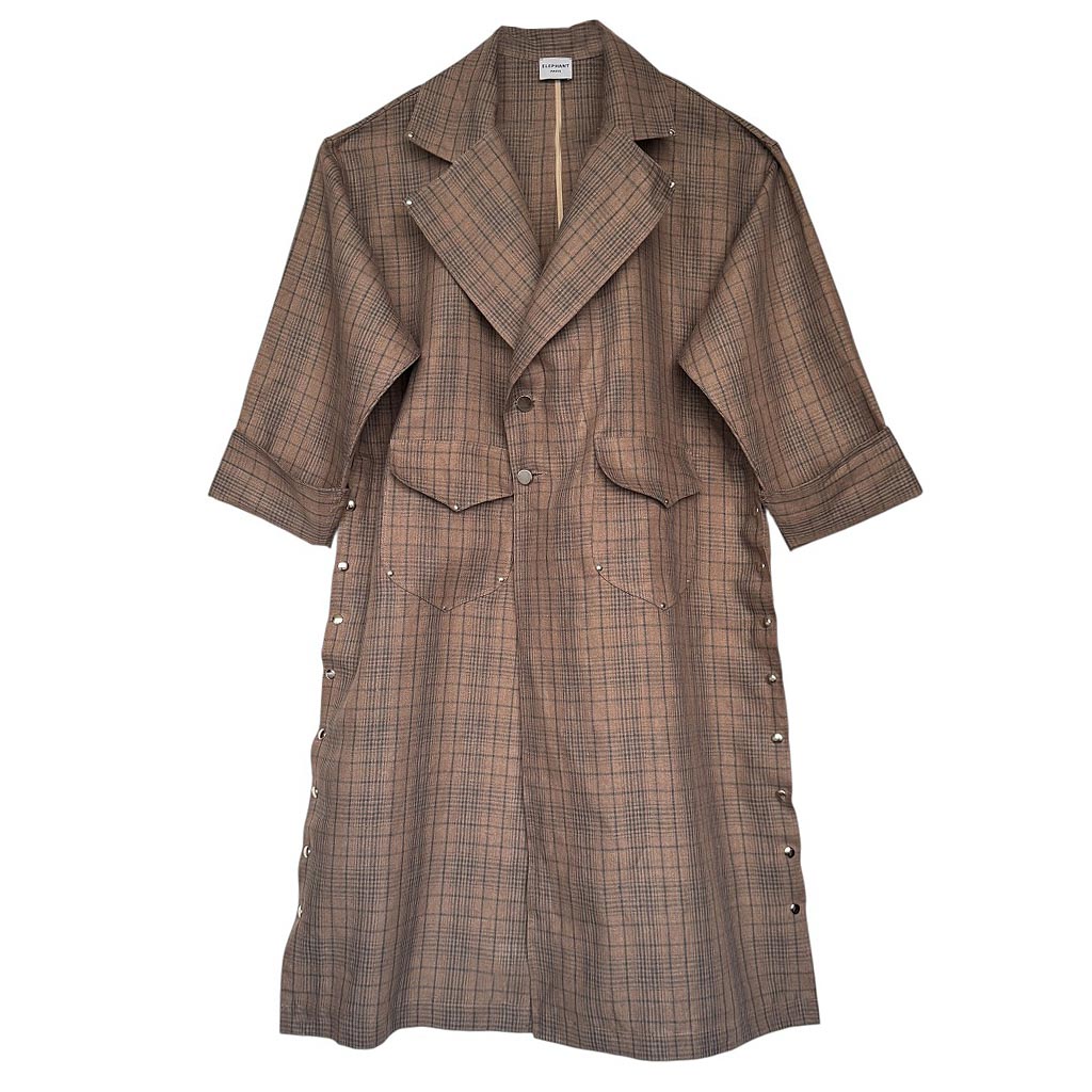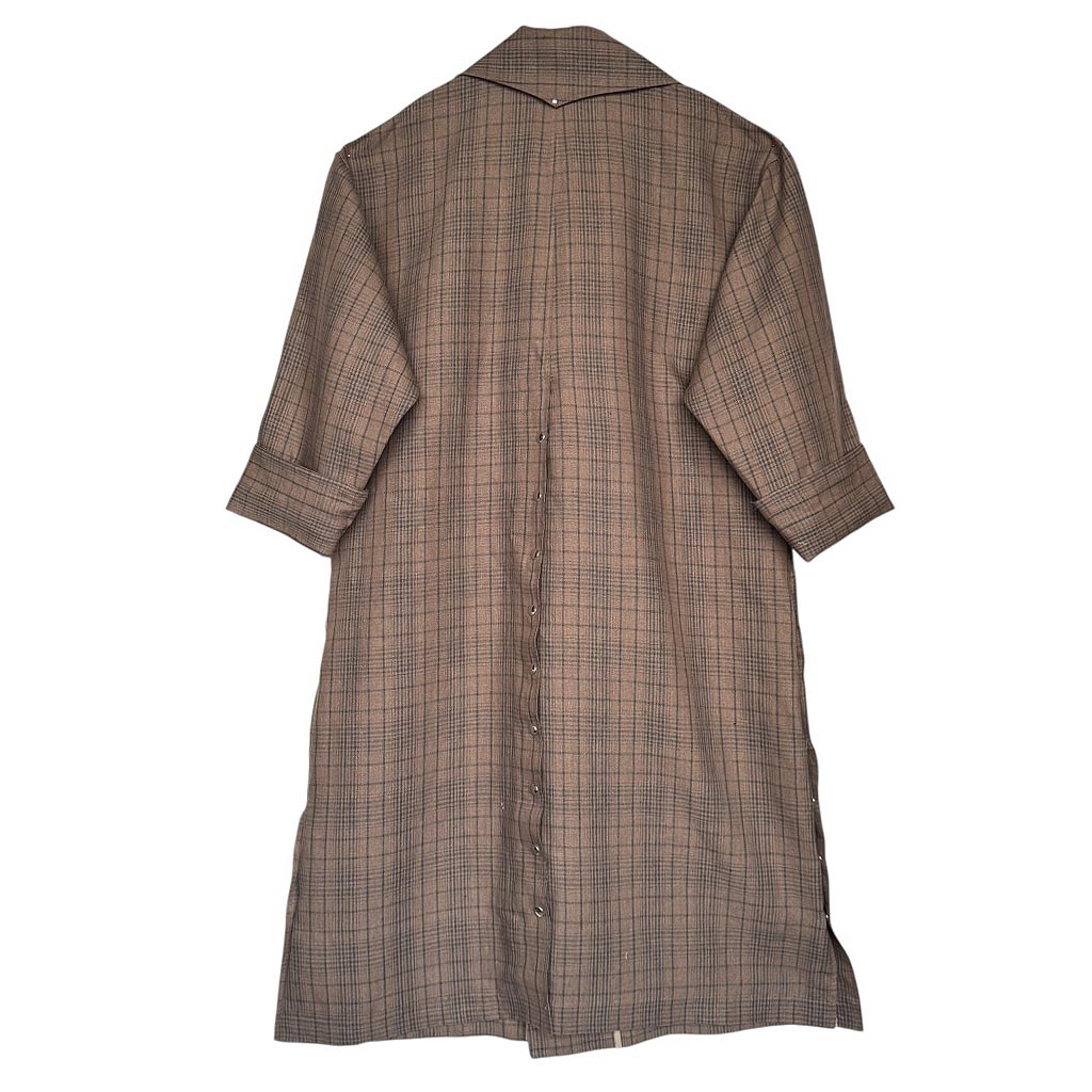 Manteau oversize lin marron glacé TU Elephant Paris Design Ce design est réalisé avec des matériaux anciens, tissus neufs d’époque des années 1 9 8 0, lin à carreaux, les finitions sont gansées au biais de coton couleur beige, fendu sur les côtés et dans le dos, deux grandes poches plaquées à rabat devant Mesures prises à plat : Epaules : 6 4 c m, Poitrine : 7 8 c m, Longueur dos : 1 3 6 c m, Taille oversize / Taille unique / Mixte Cette pièce unique est entièrement fabriquée à Paris, les rivets et les pressions en…