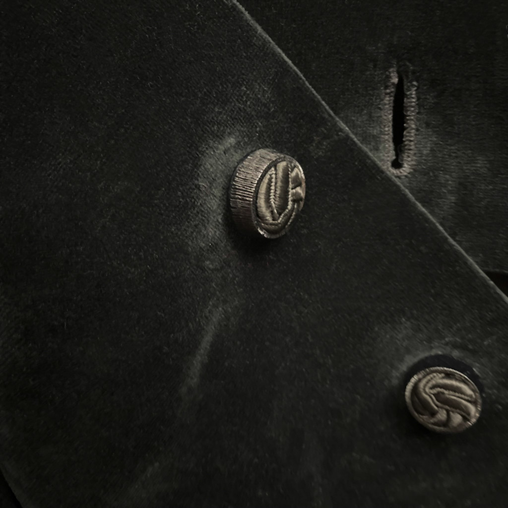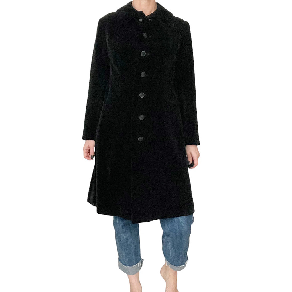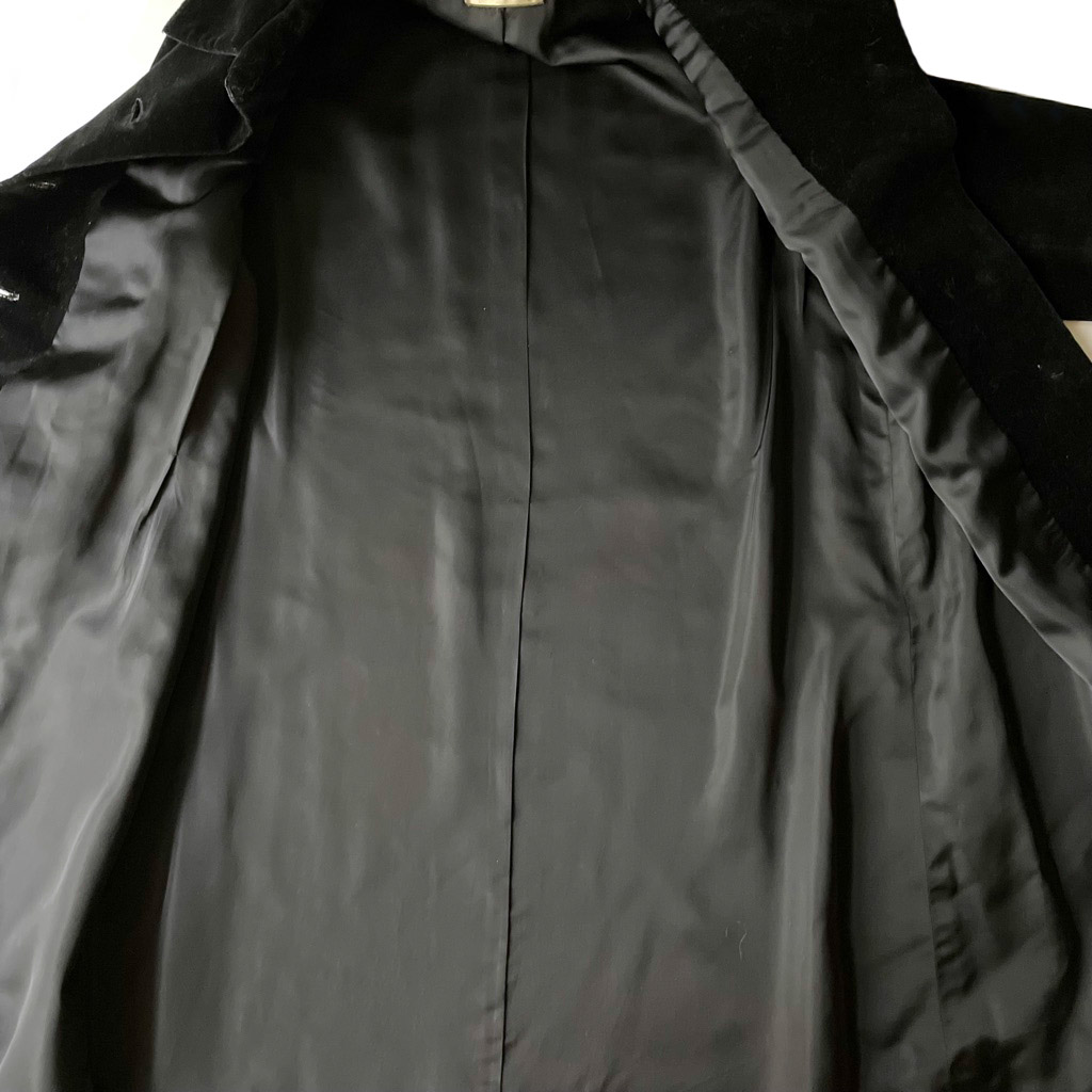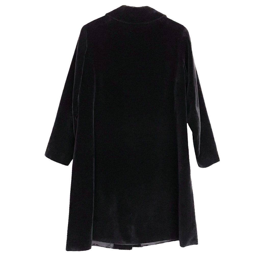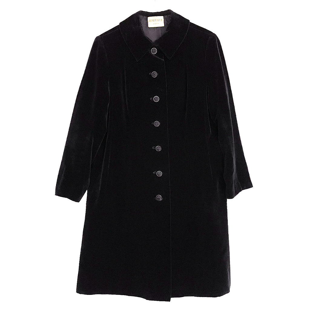 Manteau velours noir L’Empereur Manteau droit en velours de coton vintage années 70, boutons en passementerie, doublé en soie Elephant Paris Vintage Mesures à plat : Epaules 40cm, Poitrine 47cm, Longueur dos 96cm, Taille globale 36