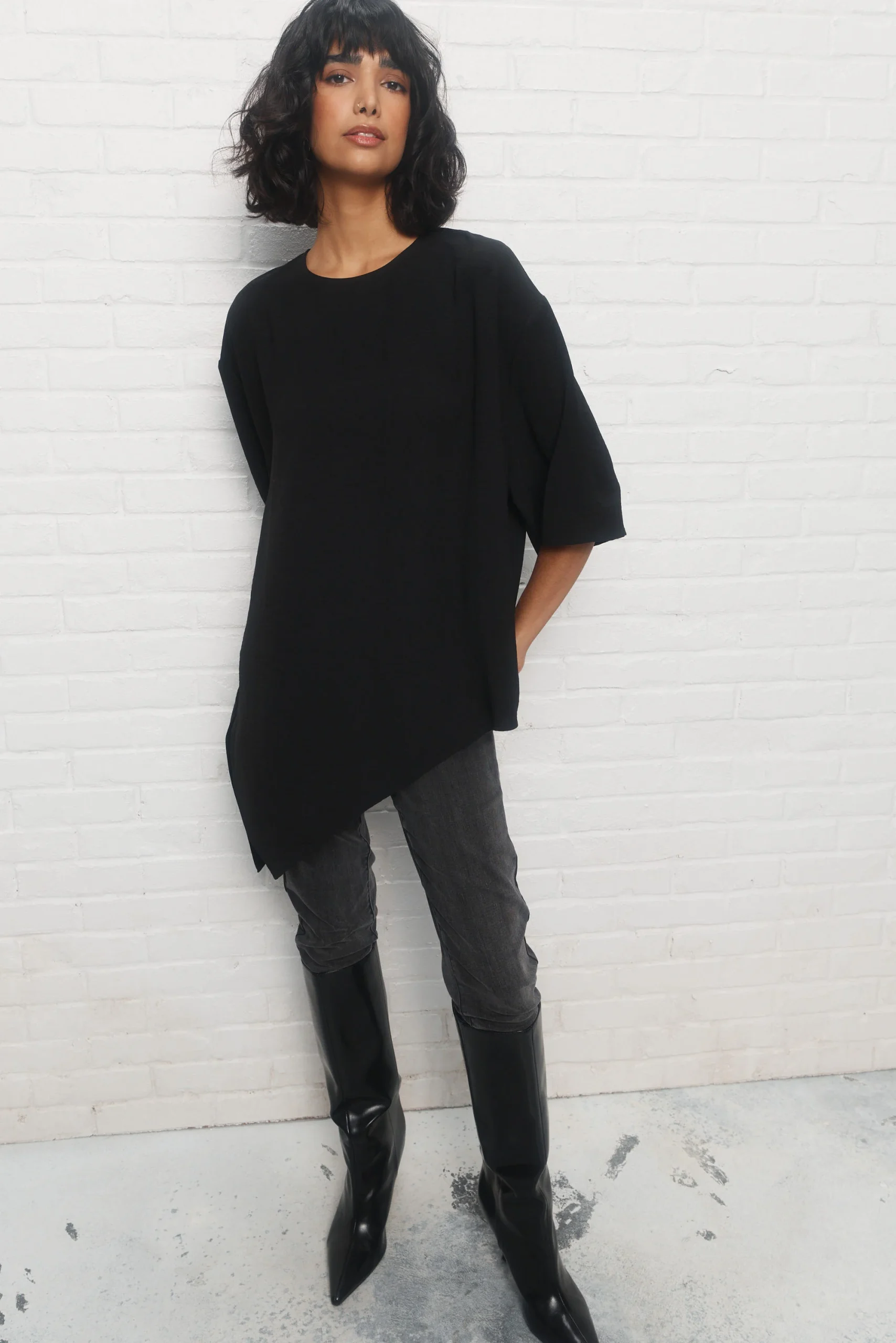 - Longueur asymétrique : jusqu’au haut de la cuisse à gauche, jusqu’au haut du genou à droite