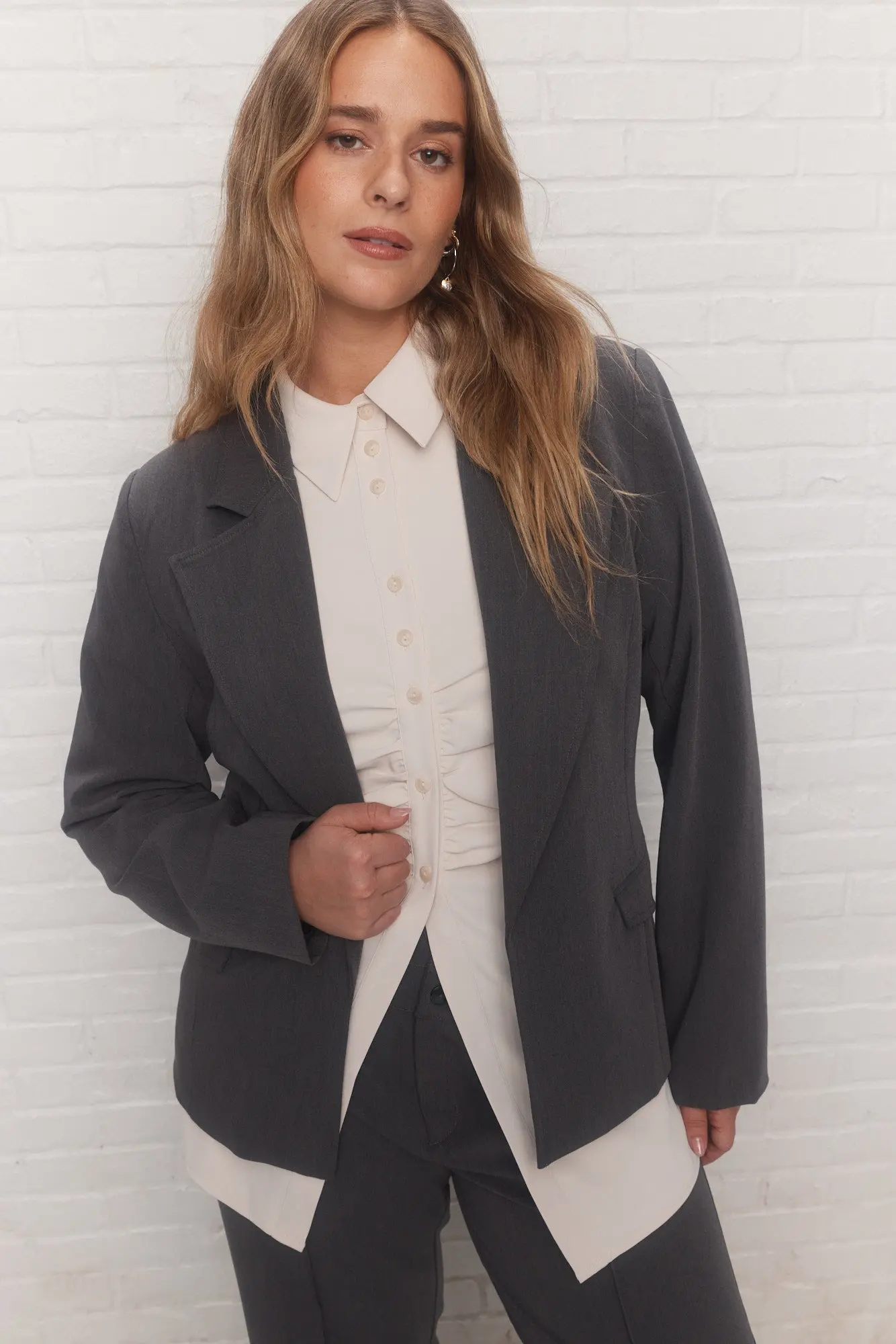 Mered est un veston gris ajusté classique, à la fois masculin avec ses lignes épurées et féminin avec sa coupe près du corps et sa longueur aux hanches. Sans bouton au-devant, portez-le comme une veste plus chic.
