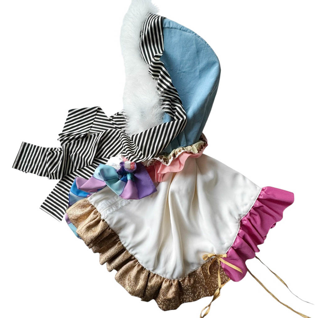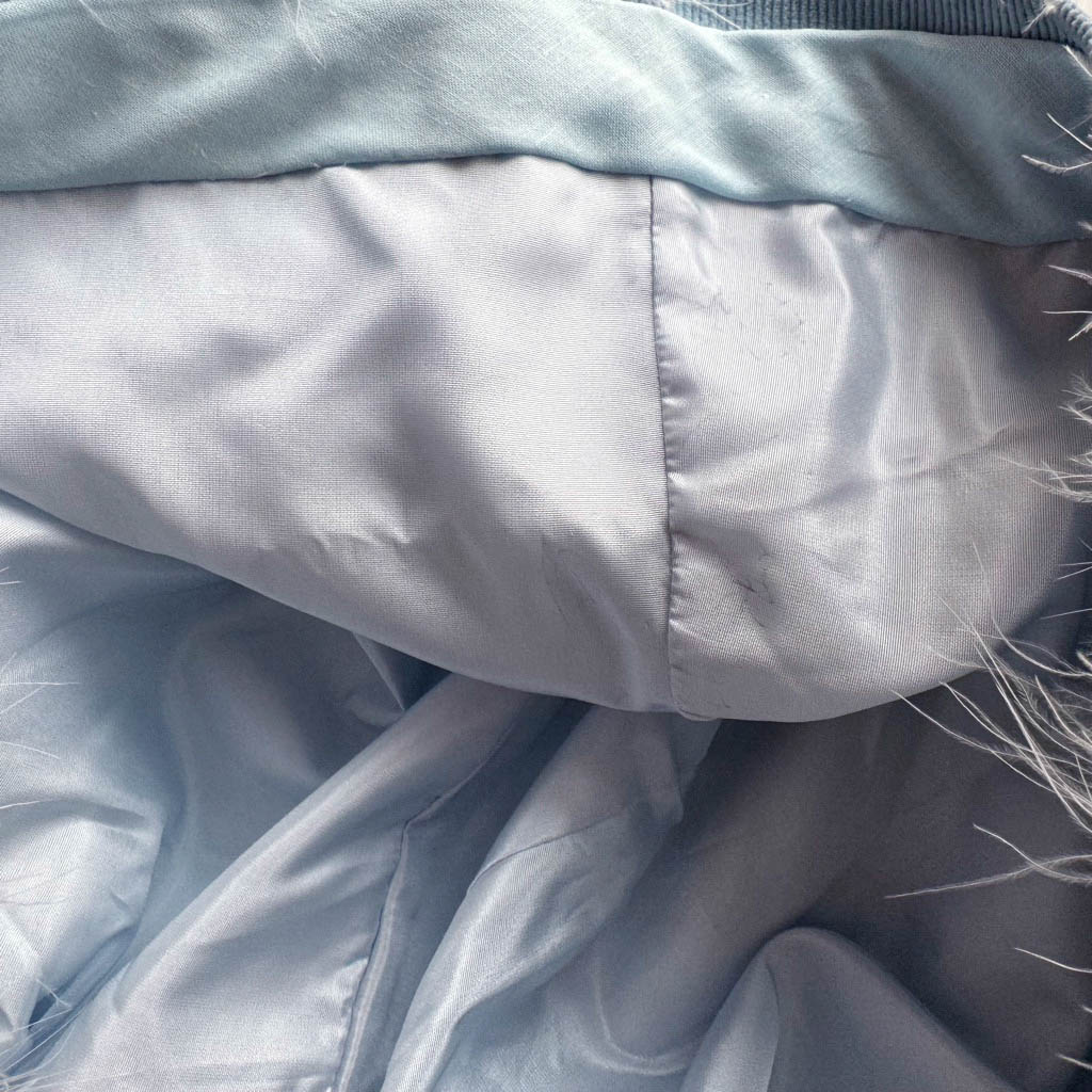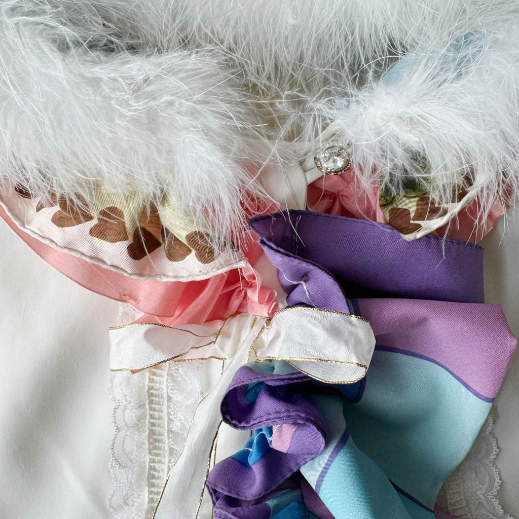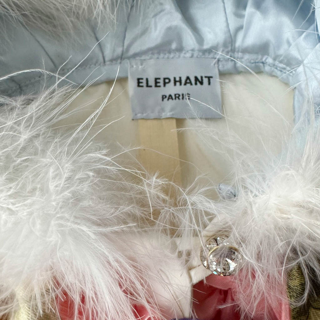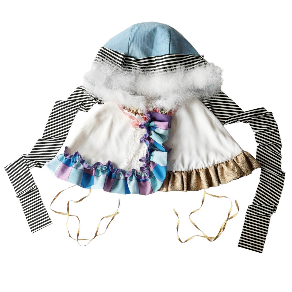 Mini cape Zan pastel Elephant Paris Design Travail d’pcycling réalisé avec des matériaux anciens, sur une mini-cape années 60 en satin nylon, sur laquelle nous avons monté une capuche en velours bleu ciel côtelé et plumes blanches, agrémentée de passementerie fils d’or, rubans, lamé, nylon et jerseys, Pièce unique Made in France, Longueur dos78cm, Taille unique, S
