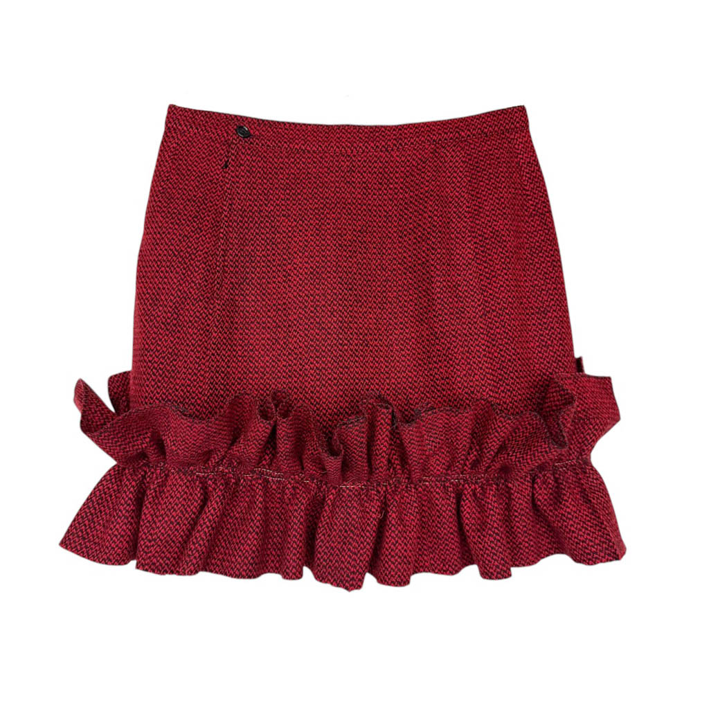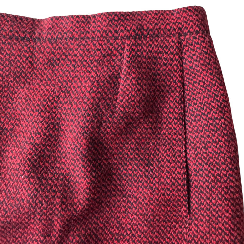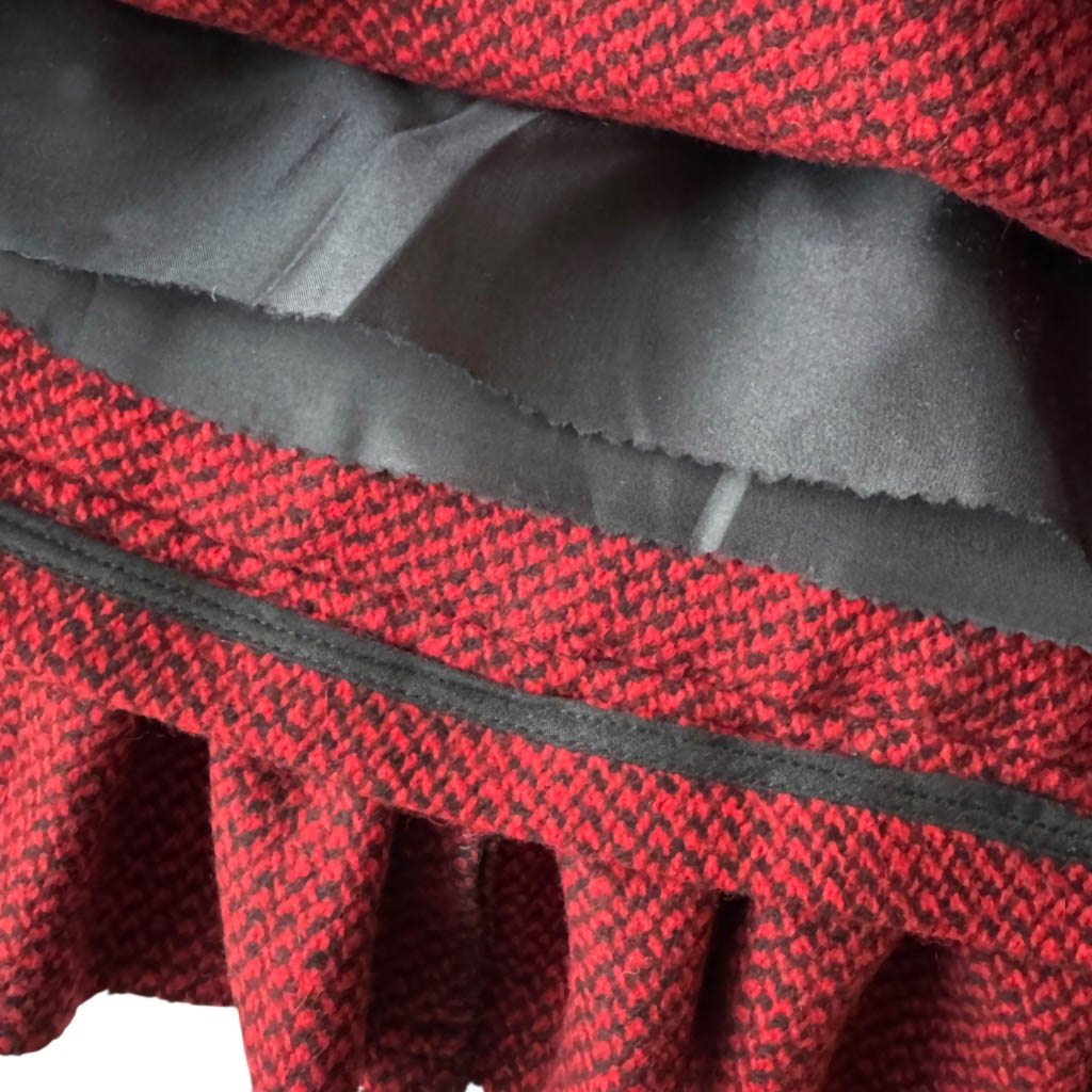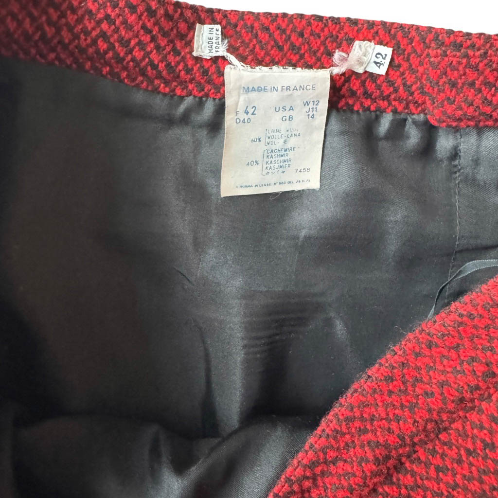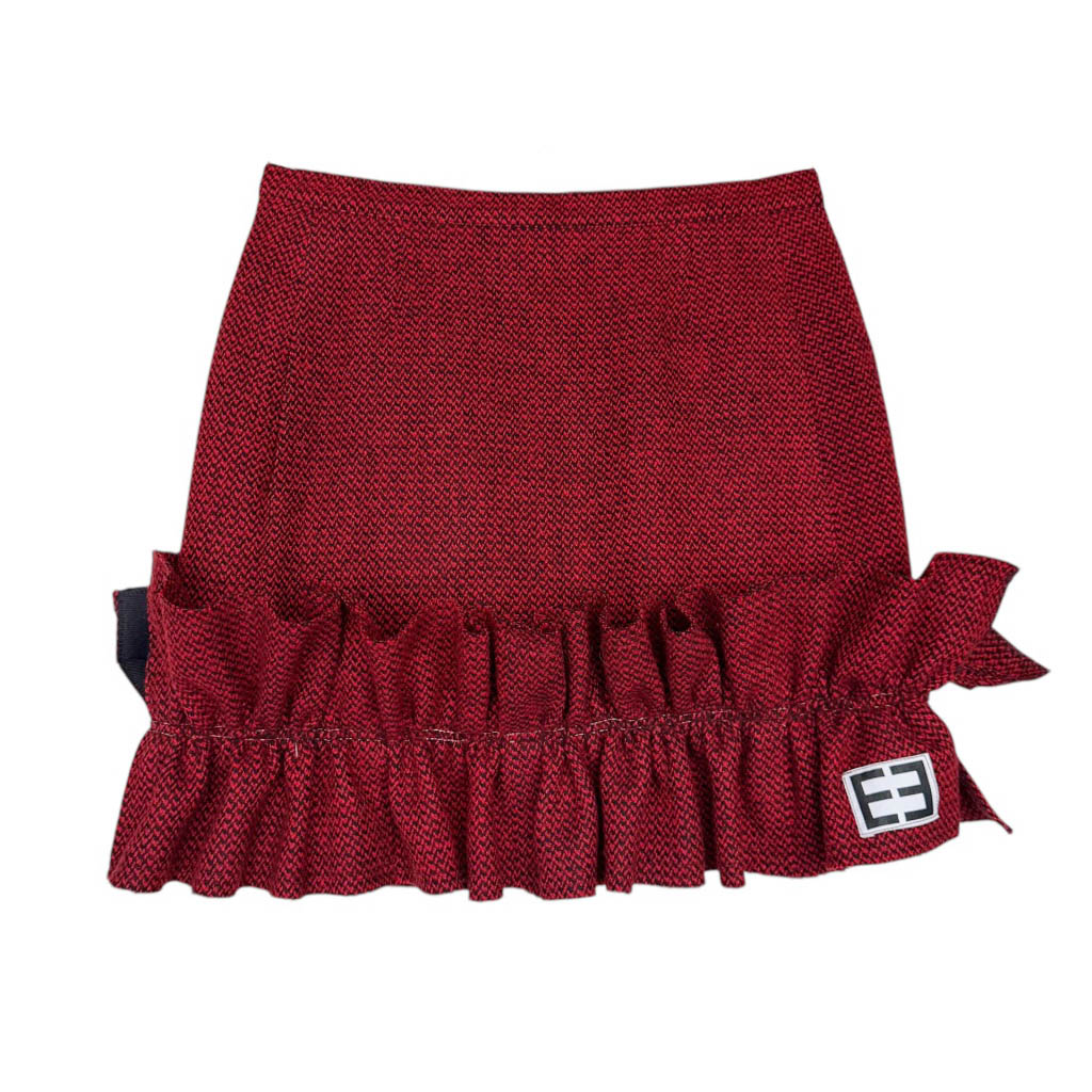 Mini-jupe upcycling N21 Elephant Paris Design Mini-jupe upcyclée d’une jupe trapèze en lainage rouge profond et noir, vintage datant des années 1 9 8 0, pièce unique, fabriquée à Paris. Cette mini-jupe est née d’un upcycling créatif, sur une jupe droite vintage Guy Laroche dégriffée datant des années 1 9 8 0, retravaillée dans notre atelier parisien : une jupe droite transformée en mini jupe à volant pleine d’allure, confortable, sexy et très féminine, elle incarne l’esprit libre et audacieux de la mode Elephant Paris. Confectionnée en lainage, cette mini-jupe conserve ses étiquettes d’origine, quand elle en possède, témoins de son…