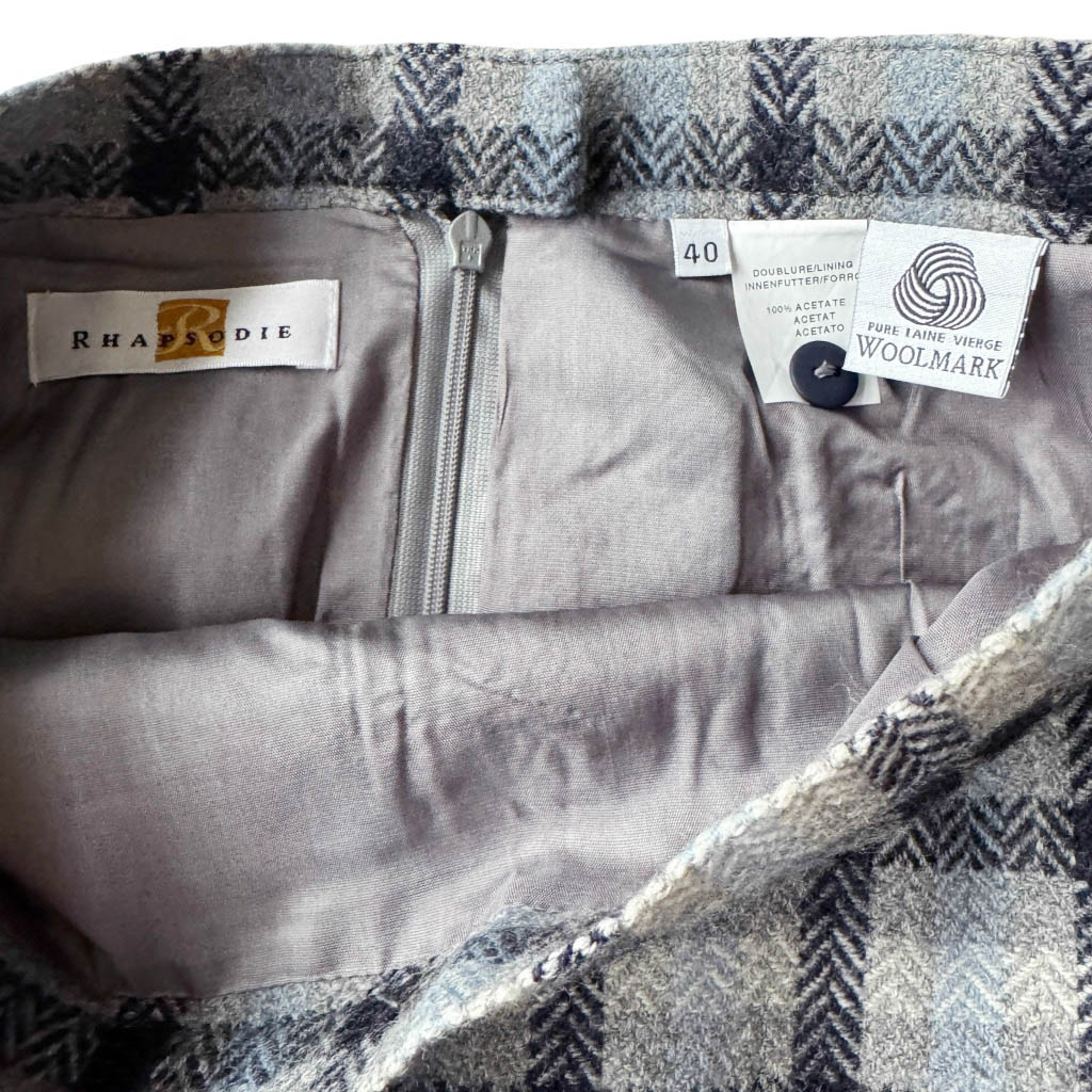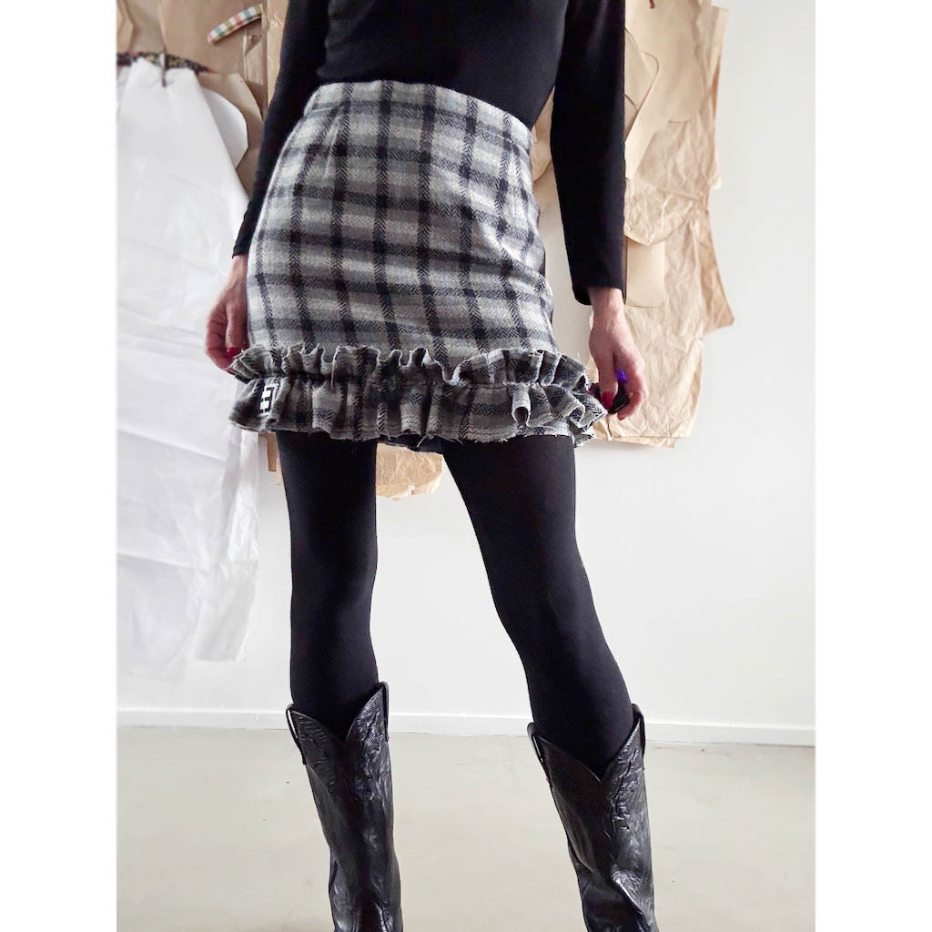Mini jupe upcycling N9 Elephant Paris Design Mini-jupe upcyclée d’une jupe droite, de la marque RHAPSODIE, vintage datant des années 1 9 8 0 – 1 0 0 % pure laine, pièce unique, fabriquée à Paris. Cette mini-jupe est née d’un upcycling créatif, sur une jupe ancienne retravaillée dans notre atelier parisien : une jupe droite transformée en mini-jupe à volant pleine d’allure, confortable, sexy et très féminine, elle incarne l’esprit libre et audacieux de la mode Elephant Paris. Confectionnée en lainage ou en tweed de pure laine, cette mini-jupe conserve ses étiquettes d’origine, quand elle en possède, témoins de…