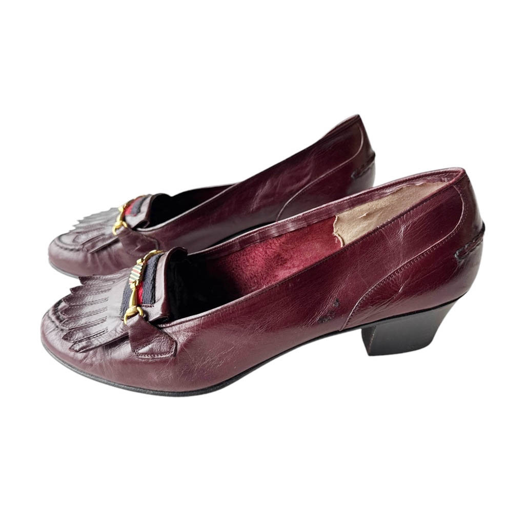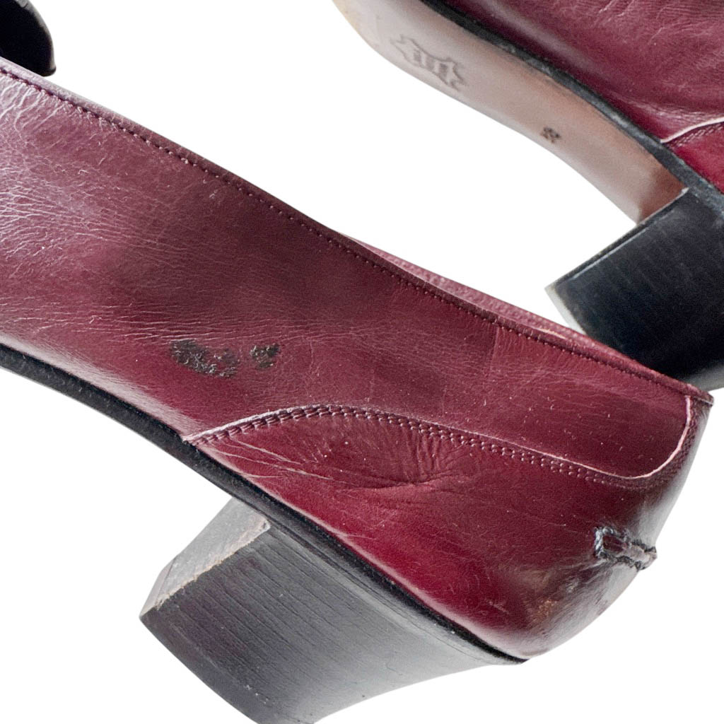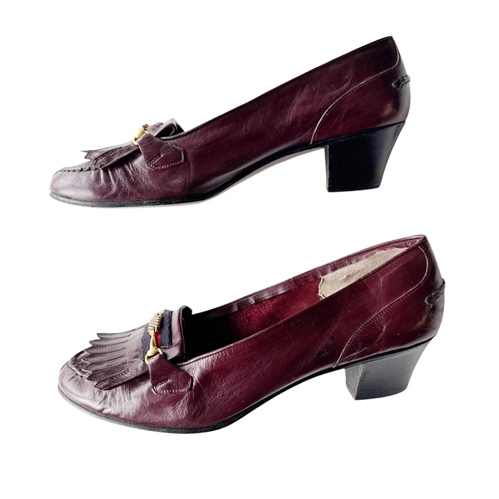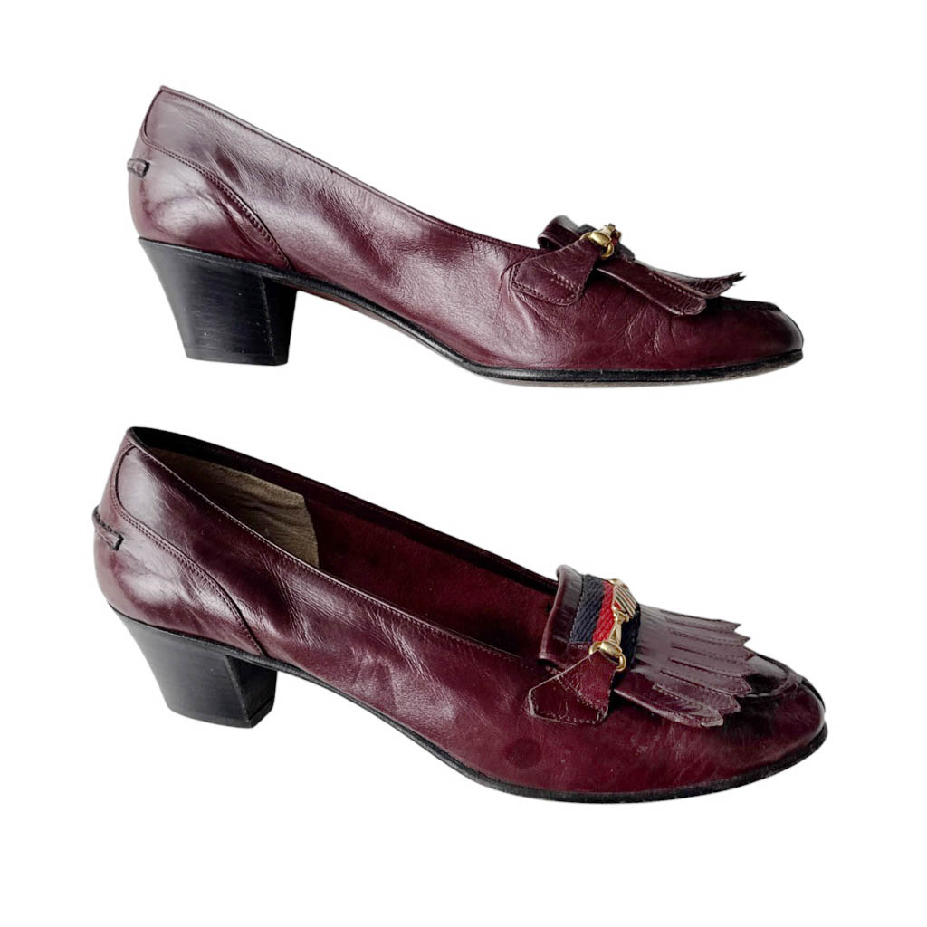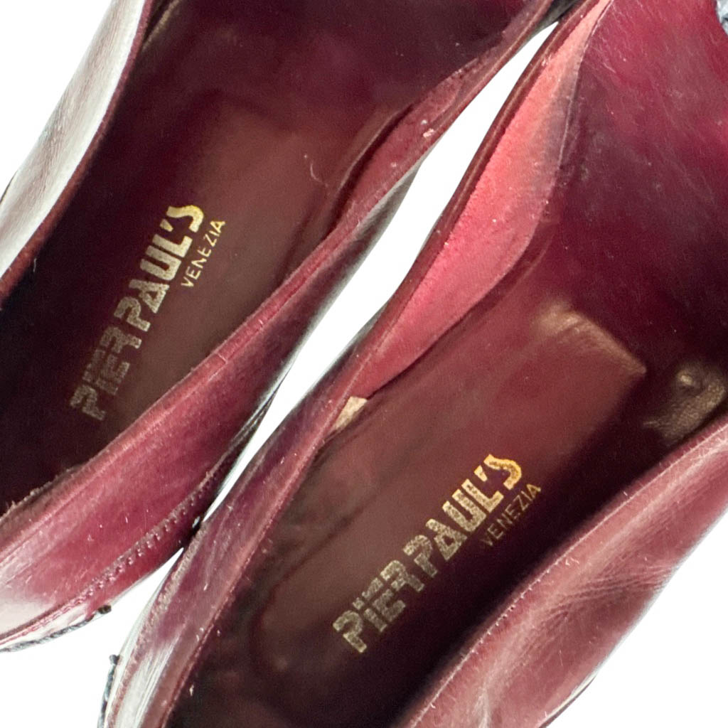 Mocassins cuir Pierpaul’s Venezia Elephant Paris Vintage Sirenella shoes of Venice, mocassins bordeaux à franges en cuir, bande bicolore marine et rouge et bride bijoux en métal doré, vintage des années 70, Pointure 38 Hauteur talon 4,5cm, Bon état, semelles cuir, dessus cuir, fabriquées à Venise
