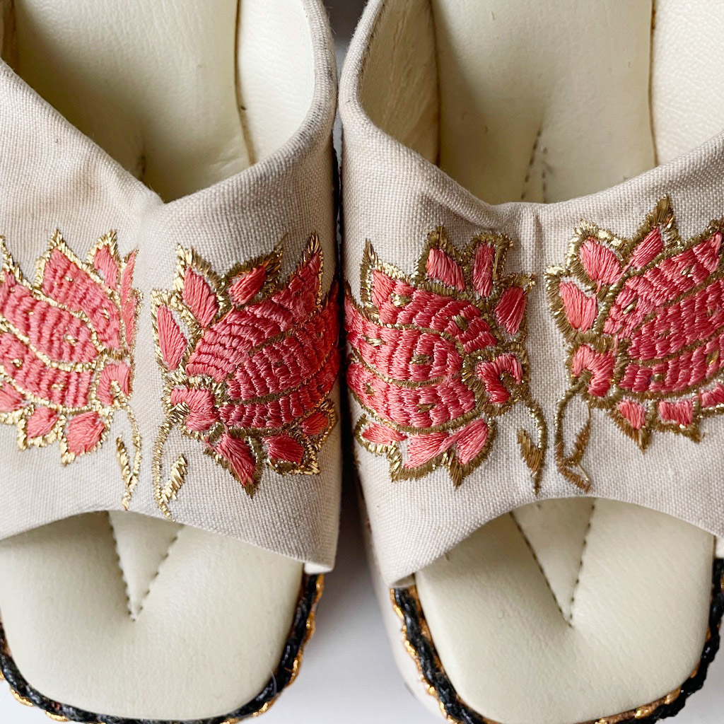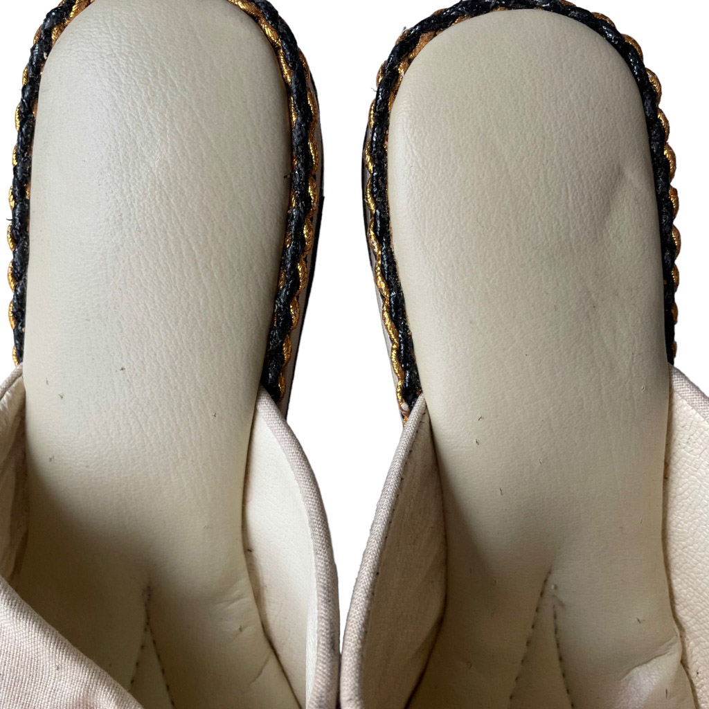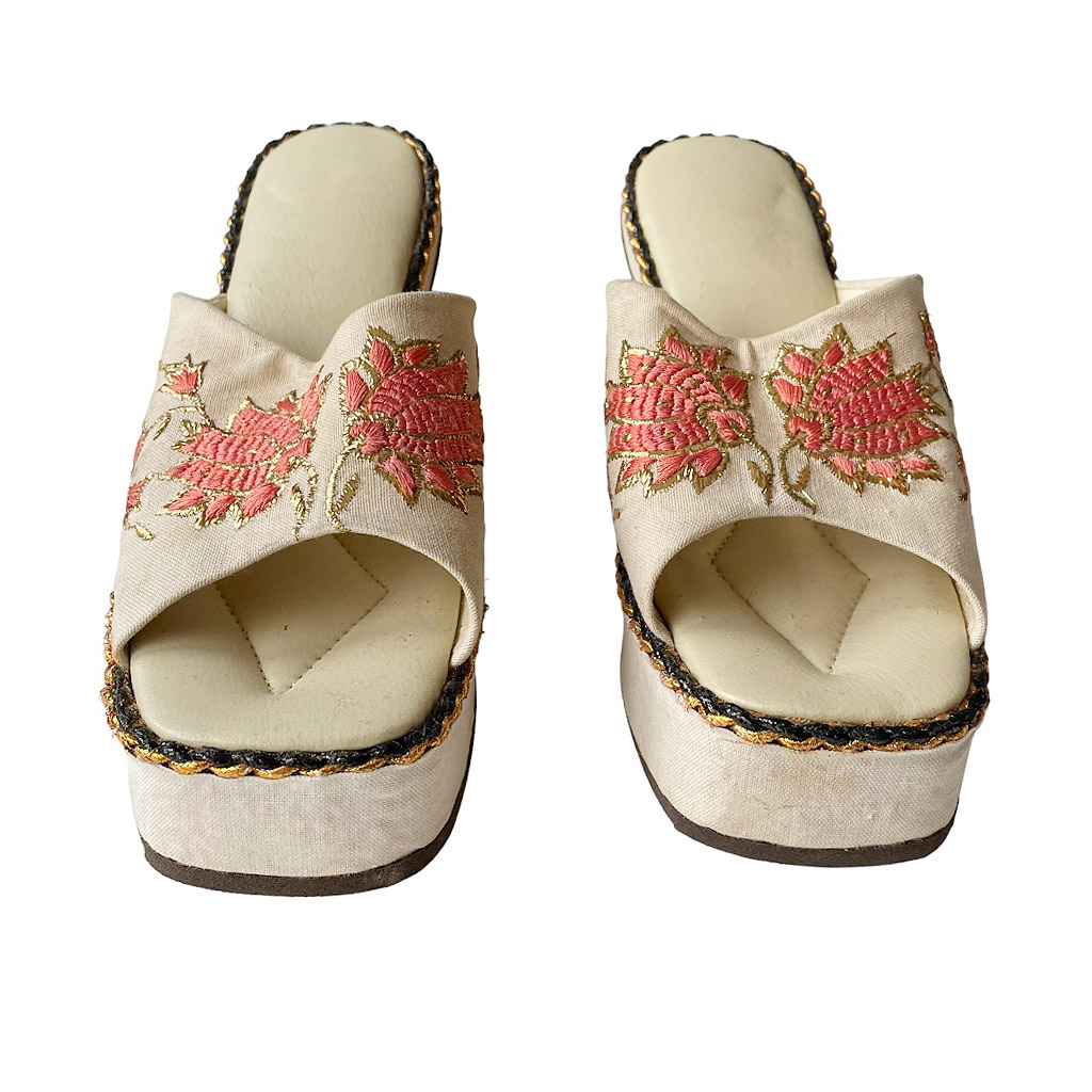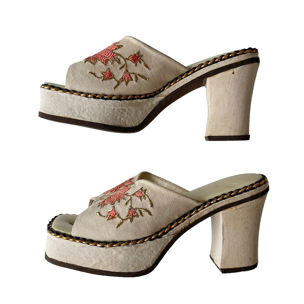 Mules beiges en tissus brodé compensées à plateau en tissus brodé semelle en simili cuir vintage années 70, neuves d’époque Pointure 36,5/37, Hauteur talon 9cm, Hauteur plateau 3cm