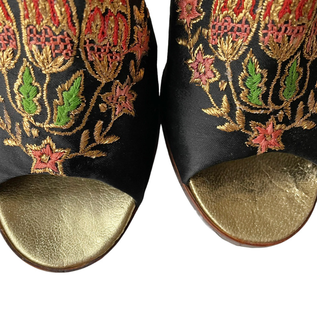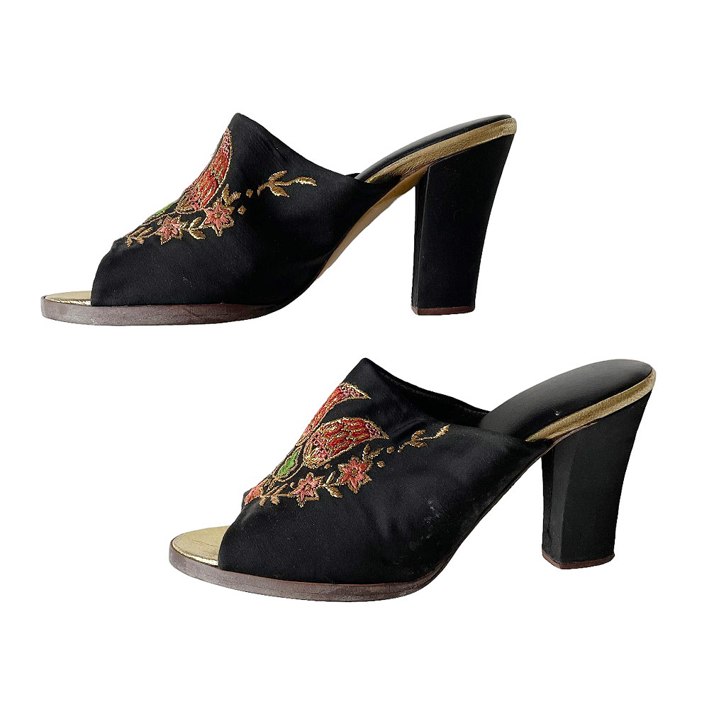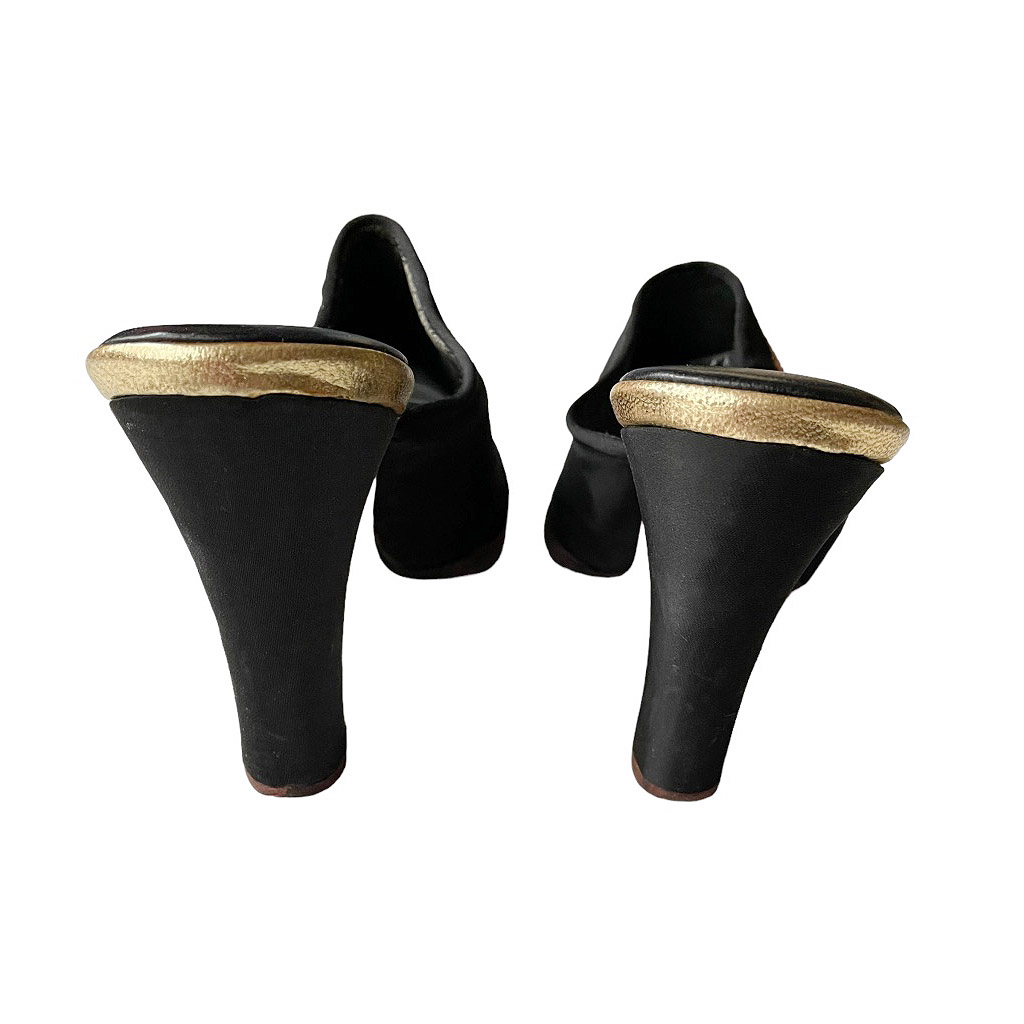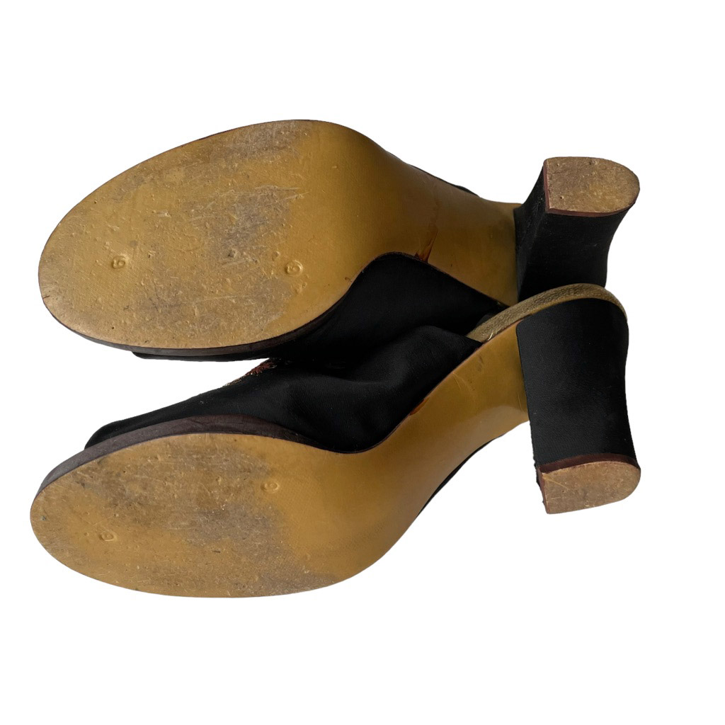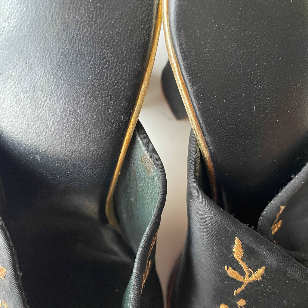 Mules noires en satin brodé semelle en cuir doré, vintage années 70 Pointure 36,5/37, Hauteur talon 9cm