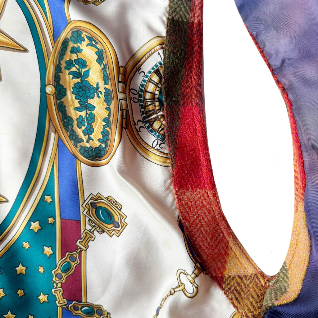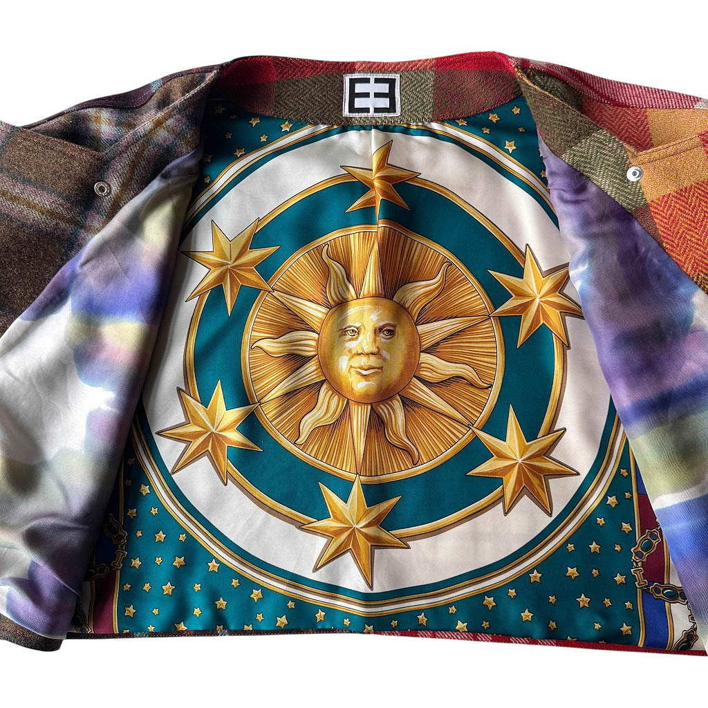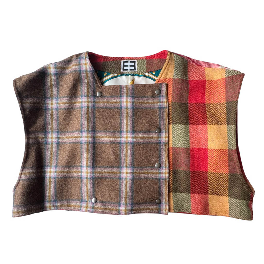 Over Gilet Quadri Tartan Elephant Paris Design Le Over-Gilet Quadri Tartan est une pièce unique, réalisée en mélange de tartans anglais et écossais en pure laine.Sa doublure est en soie imprimée, elle représente un grand soleil et des étoiles inspirées de l’astronomie, pour un contraste unique entre tradition et symbolisme céleste. Ce modèle oversize et sans manches se ferme sur le devant par des pressions couleur bronze, fabriquées en Italie et posées à la main à Paris.Il peut se porter comme un top, fermé ou entrouvert, ou encore comme un gilet oversize par-dessus un manteau — notamment le O W…