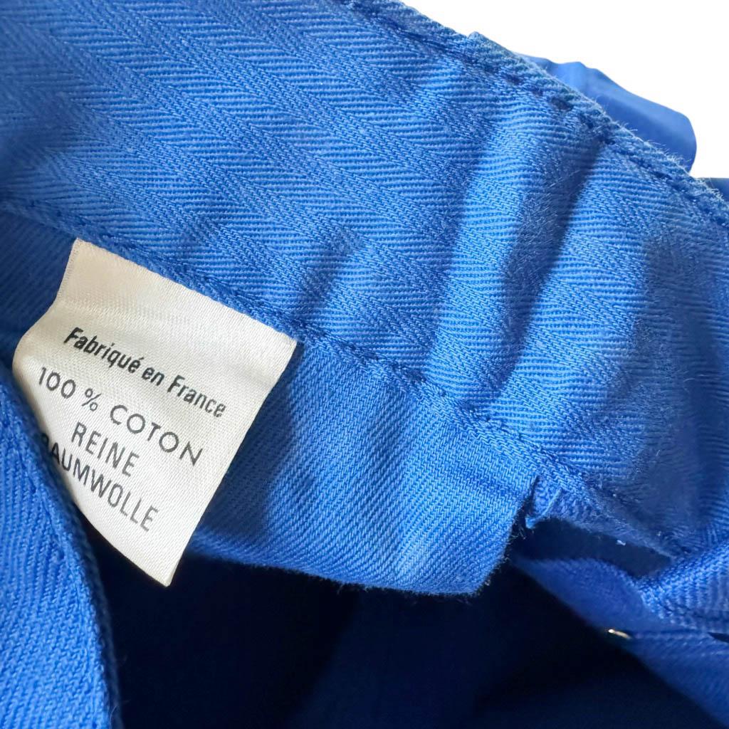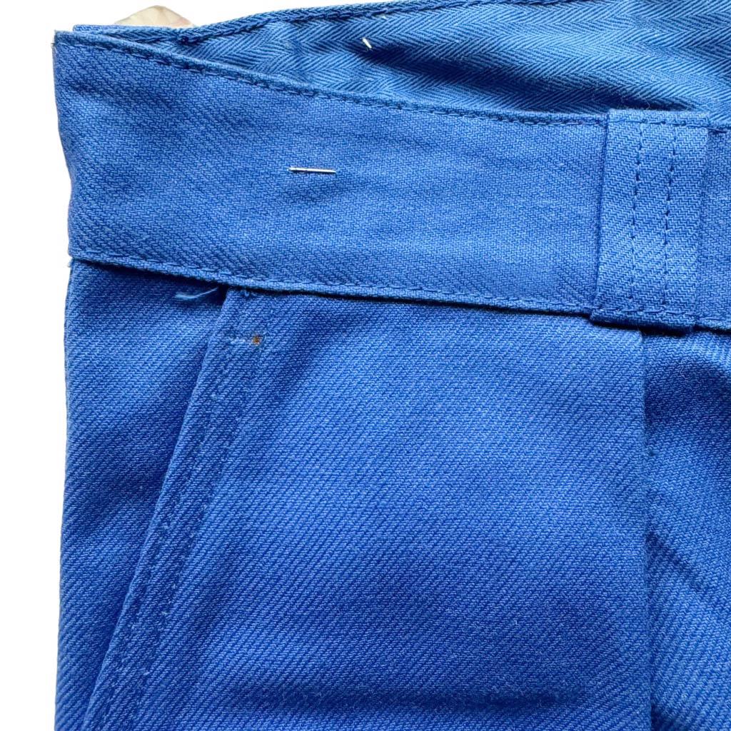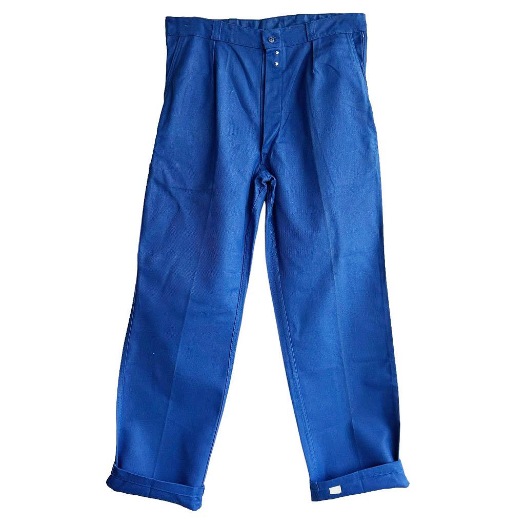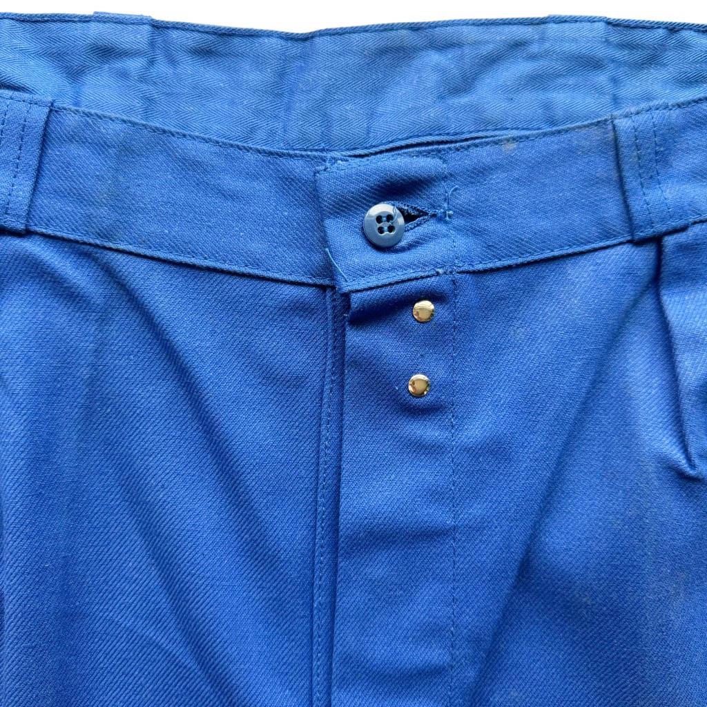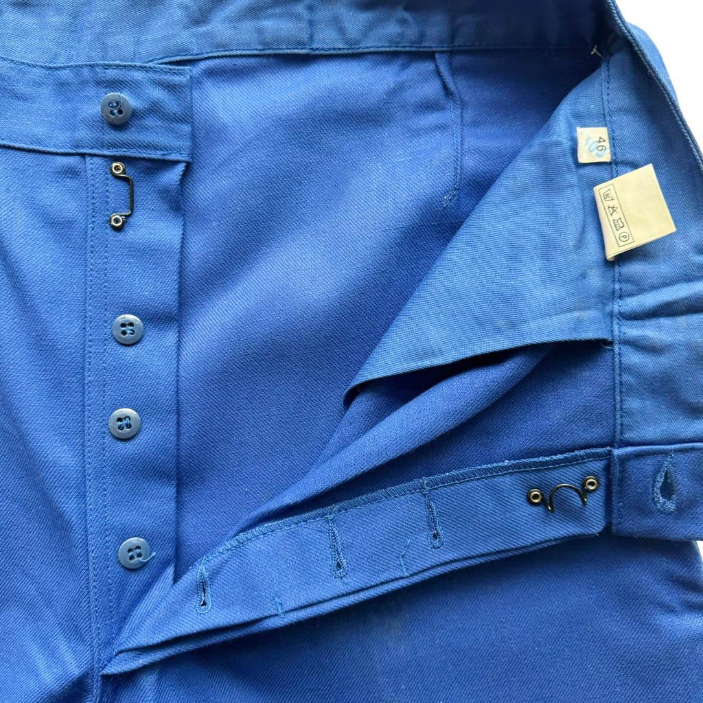 Pantalon bleu de travail Sanfor Elephant Paris Vintage Années 50, Taille 46cm, Hanches 54cm, Longueur entrejambes depuis la taille 33cm, Longueur depuis la taille avec la ceinture 118cm, Longueur jambe depuis la fourche 84cm, Taille 46